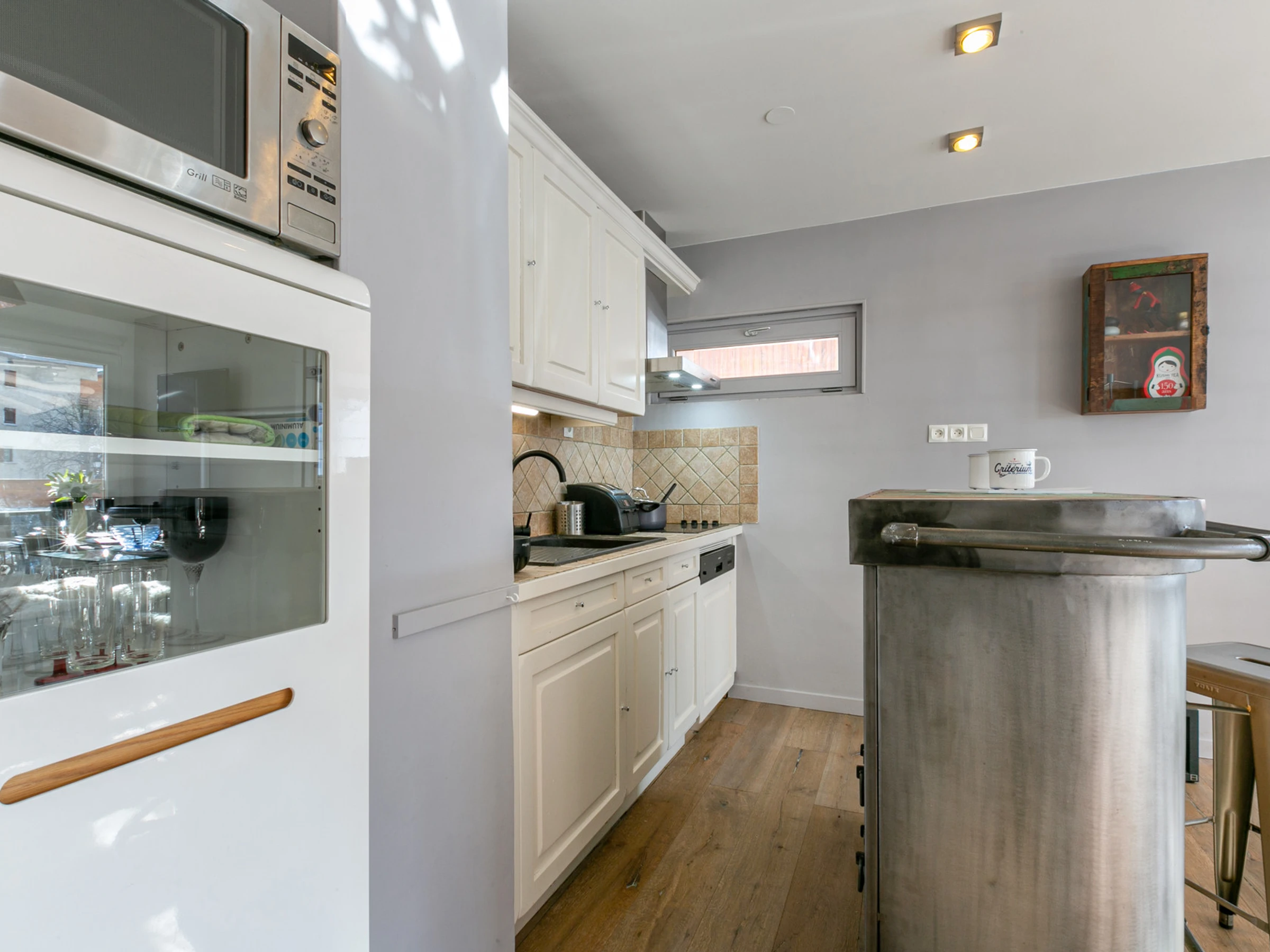 Equipée d'un four micro-ondes avec grill, plaque vitrocéramique, hotte aspirante, réfrigérateur et lave-vaisselle.
