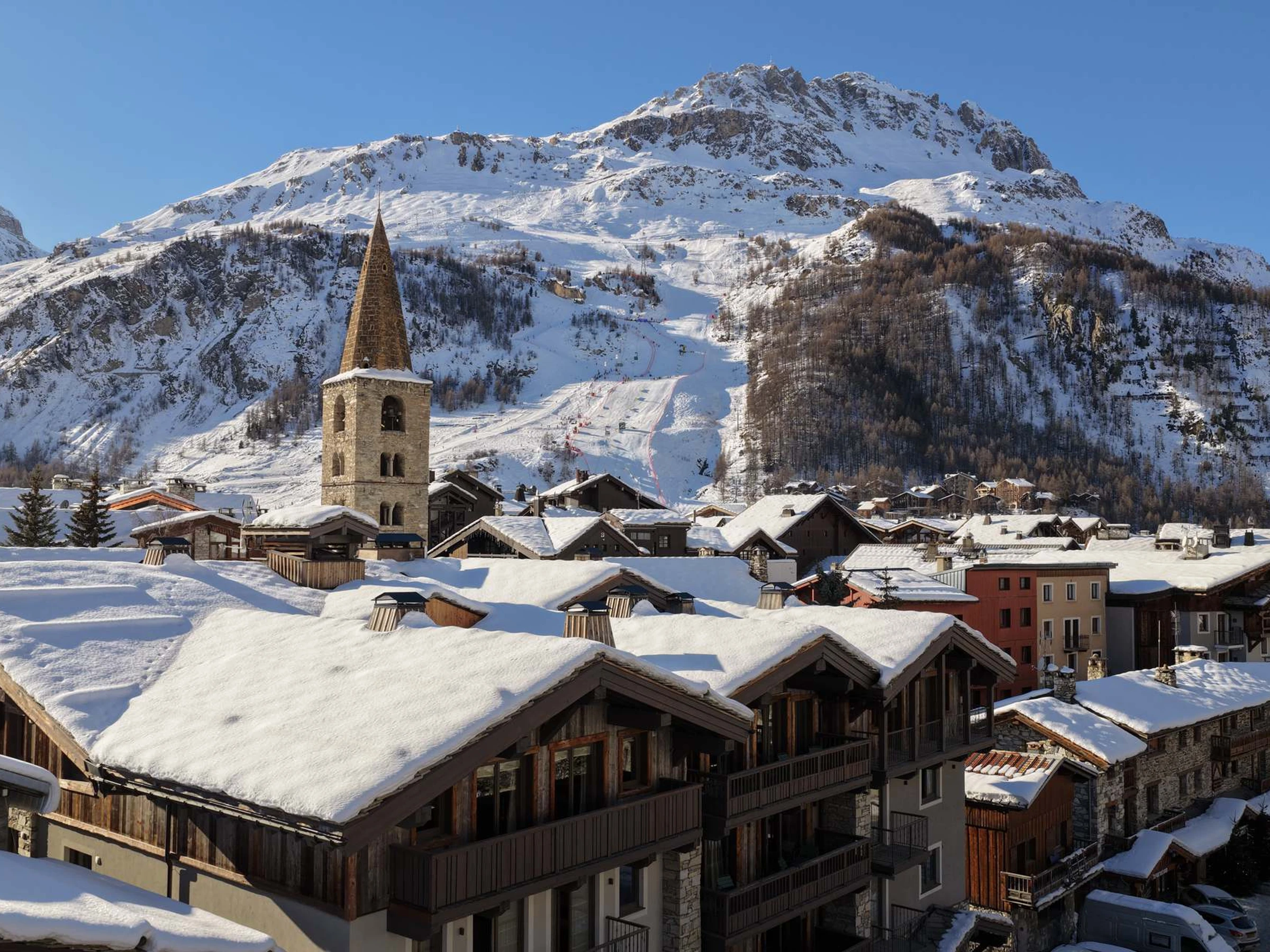 Magnifique panorama sur le clocher du vieux village et la piste de Bellevarde.