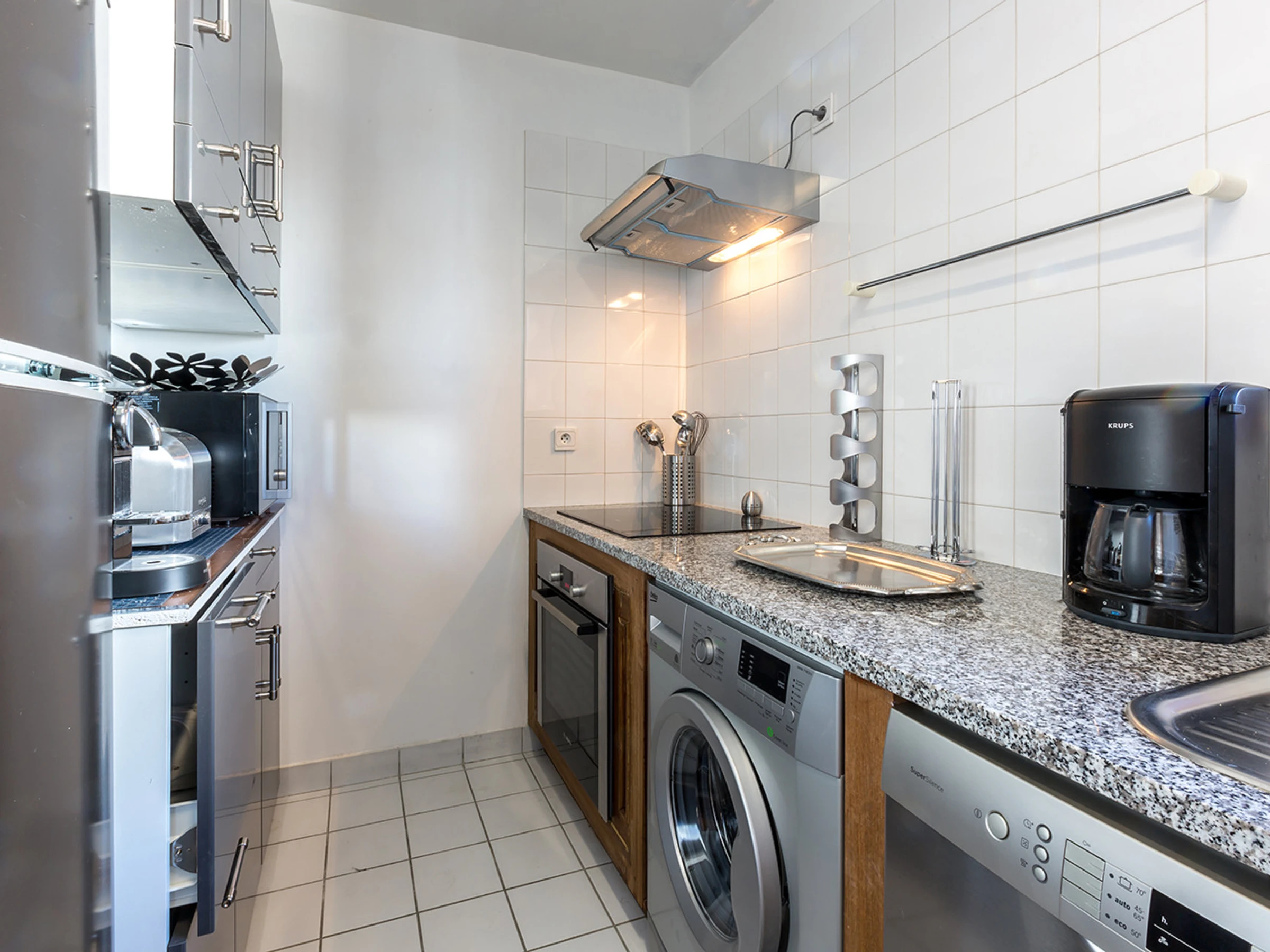 Equipée d'un four, four micro-ondes avec grill, plaque induction, réfrigérateur, hotte aspirante, lave-vaisselle et lave-linge