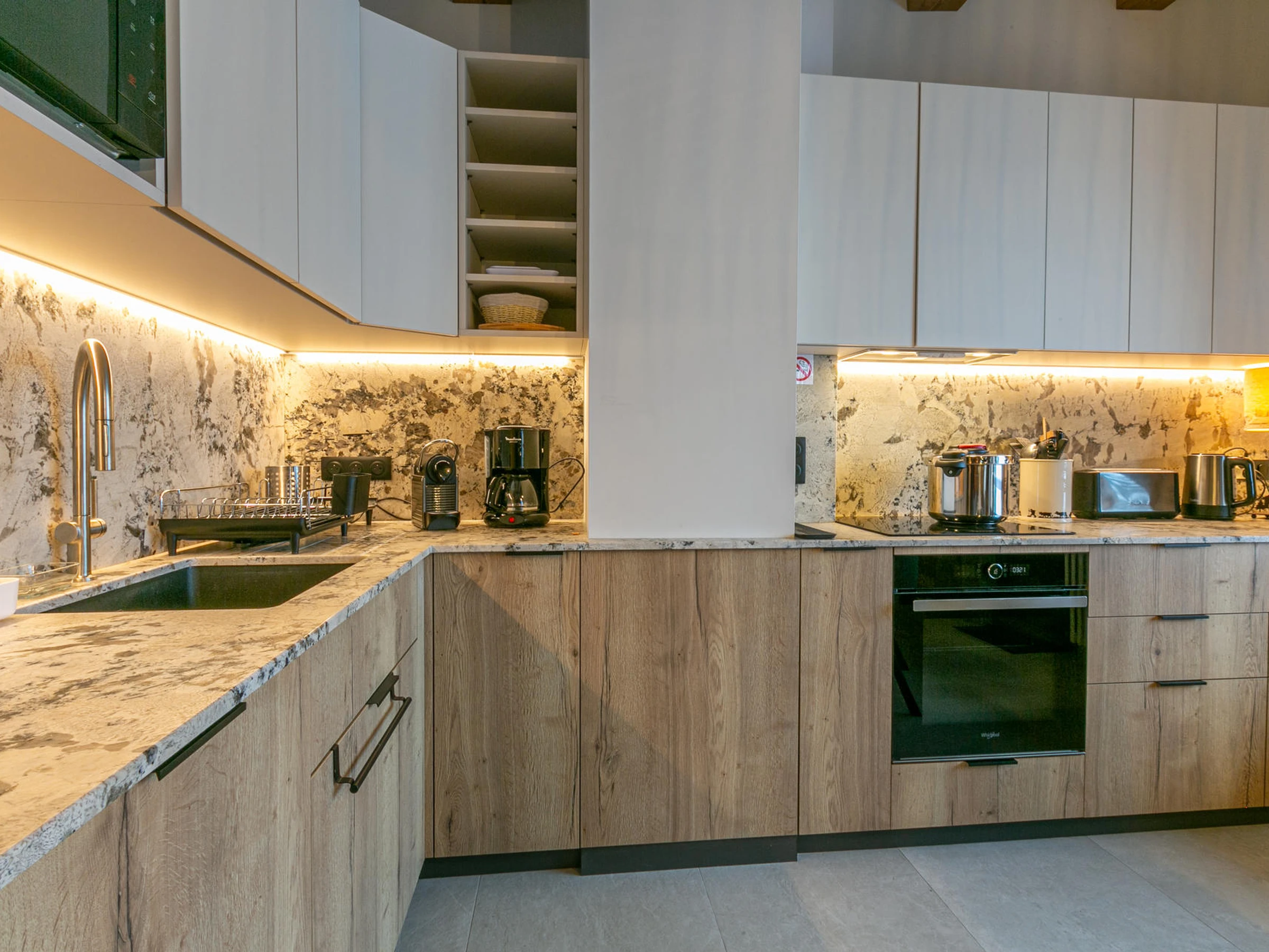 Equipée d'un four, four micro-ondes, plaque induction, lave-vaisselle, réfrigérateur avec congélateur, hotte aspirante.