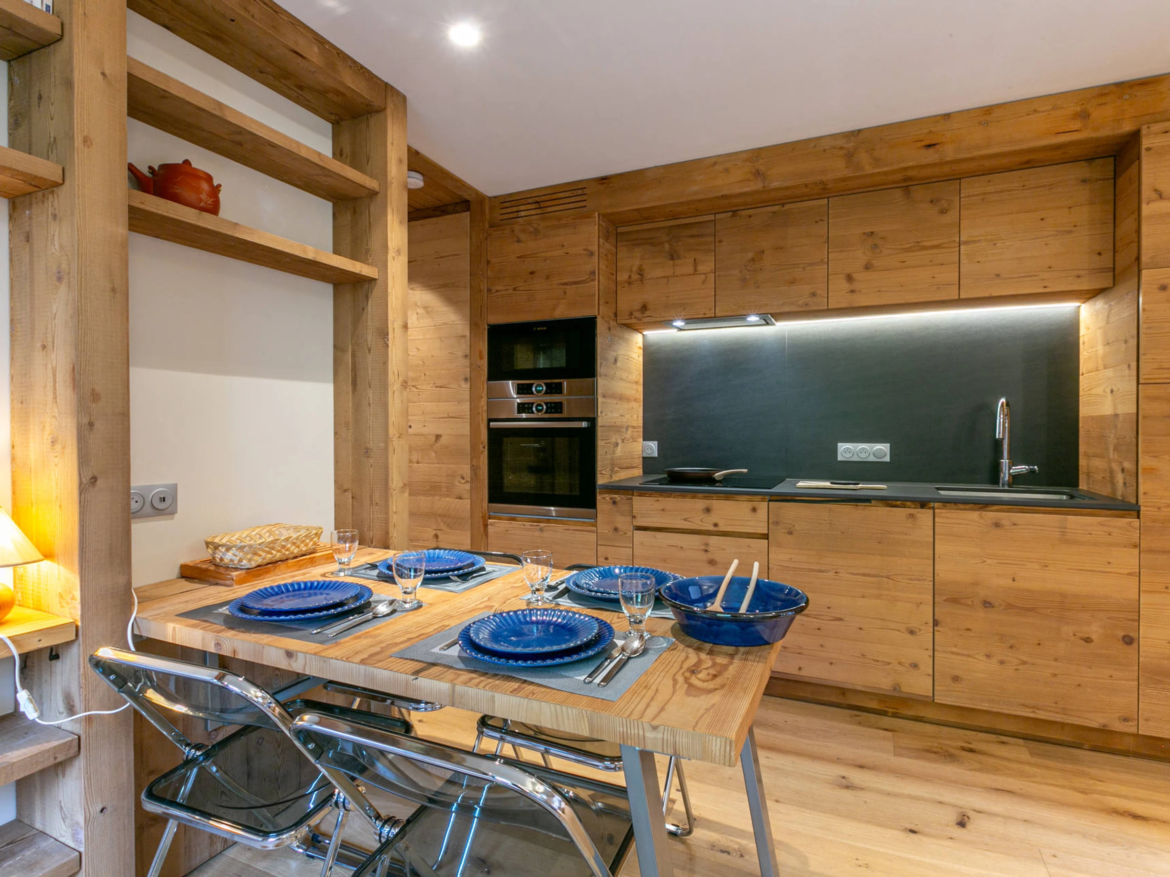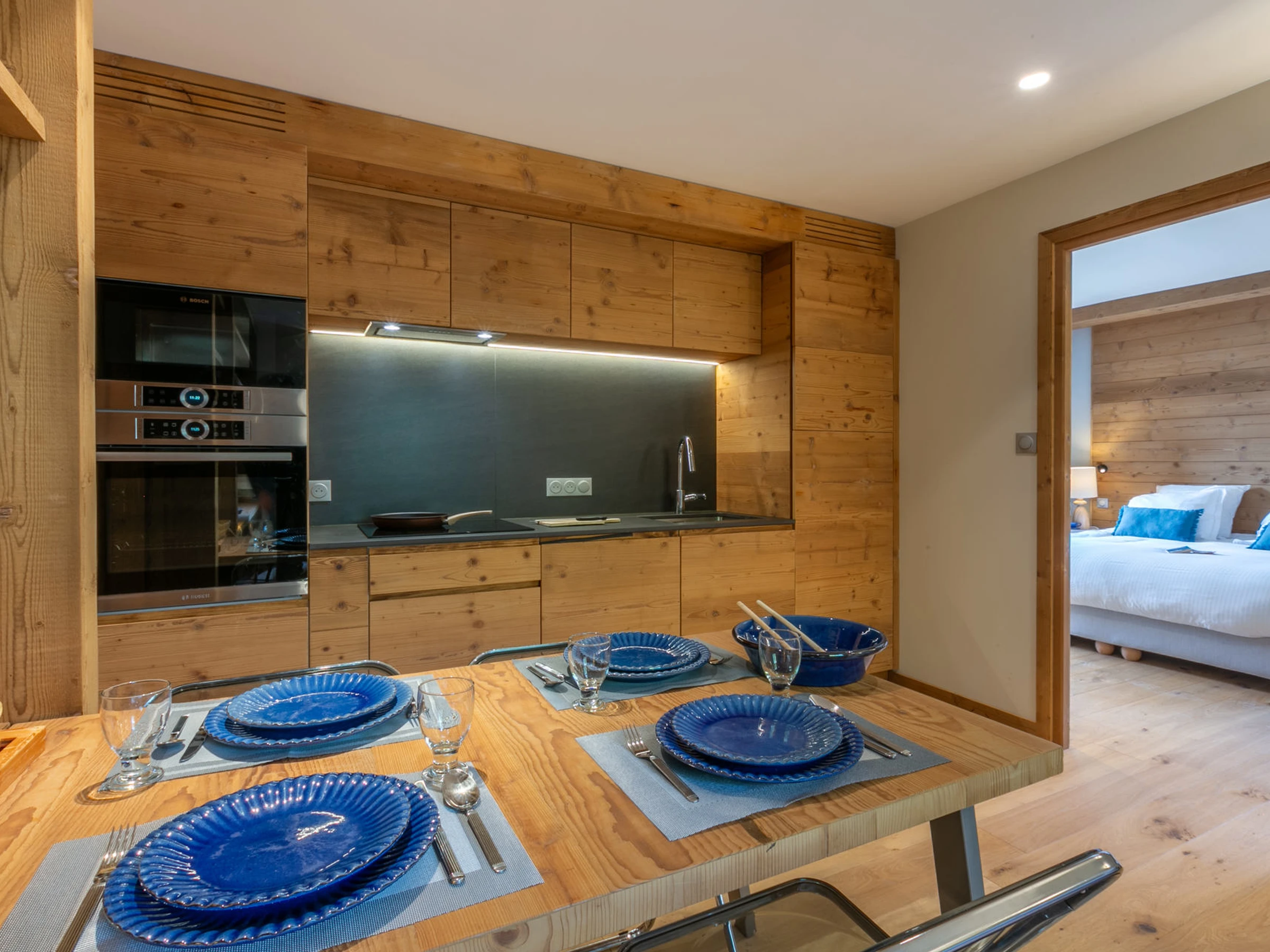 Cuisine ouverte équipée d'un four, lave-vaisselle, four micro-ondes, réfrigérateur avec compartiment congélation, hotte aspirante, plaque vitrocéramique