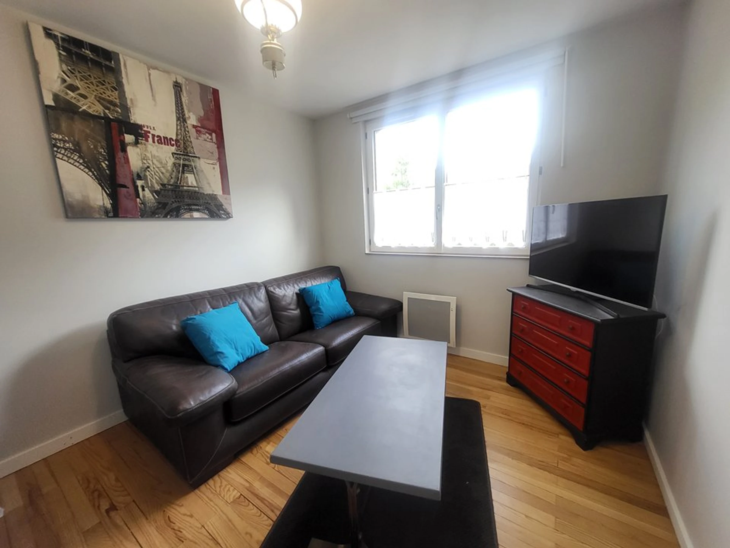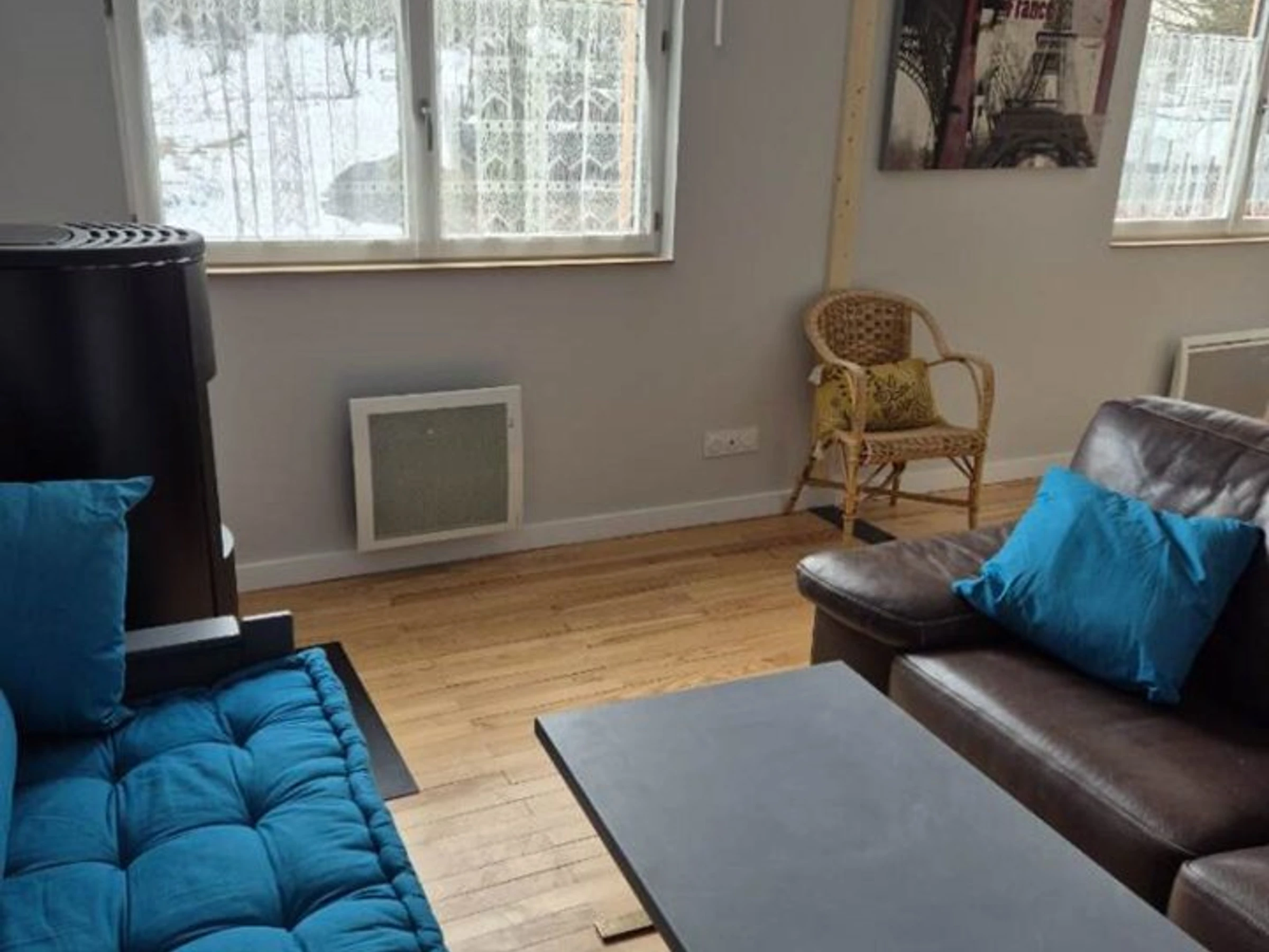 - un séjour avec poêle à granules, télévision, baby-foot, donnant sur le coin repas et sur le balcon,