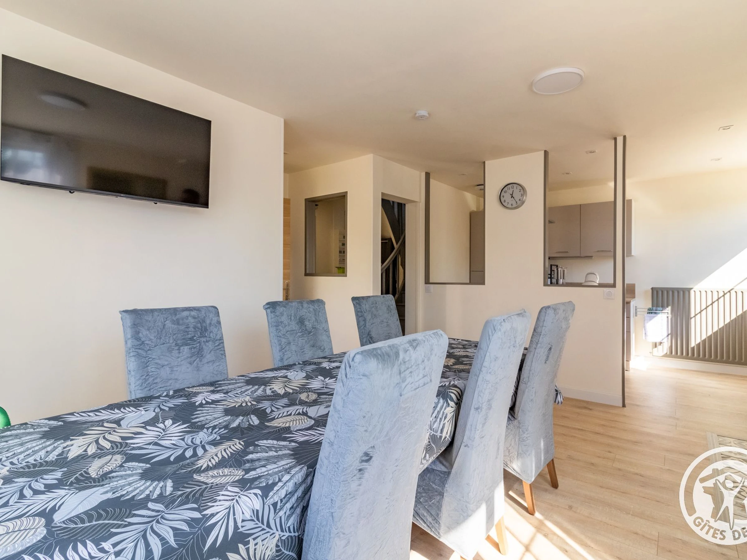 - 1er niveau, la pièce de vie de 27m² avec cuisine aménagée, espace repas pour 8 personnes et espace détente avec 2 petites banquettes et une télévision connectée. Poêle à bois. Salle d'eau avec douche, meuble-vasque et lave-linge. Wc indépendants.