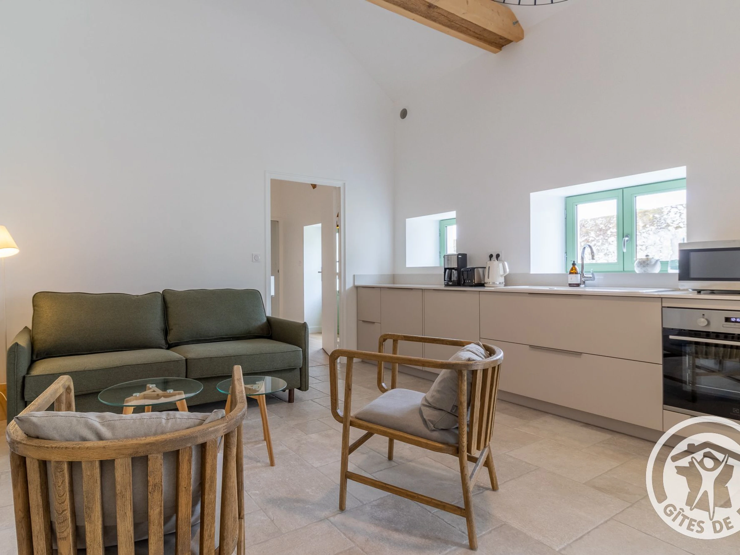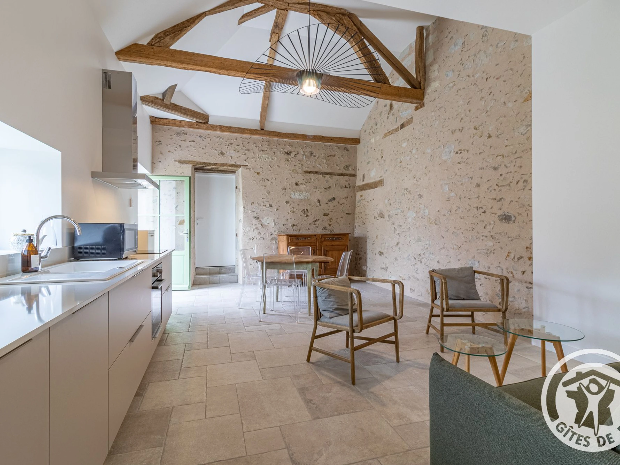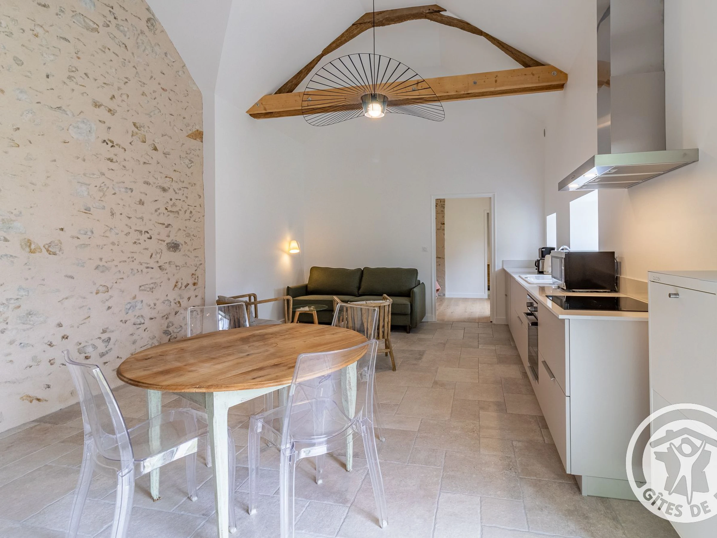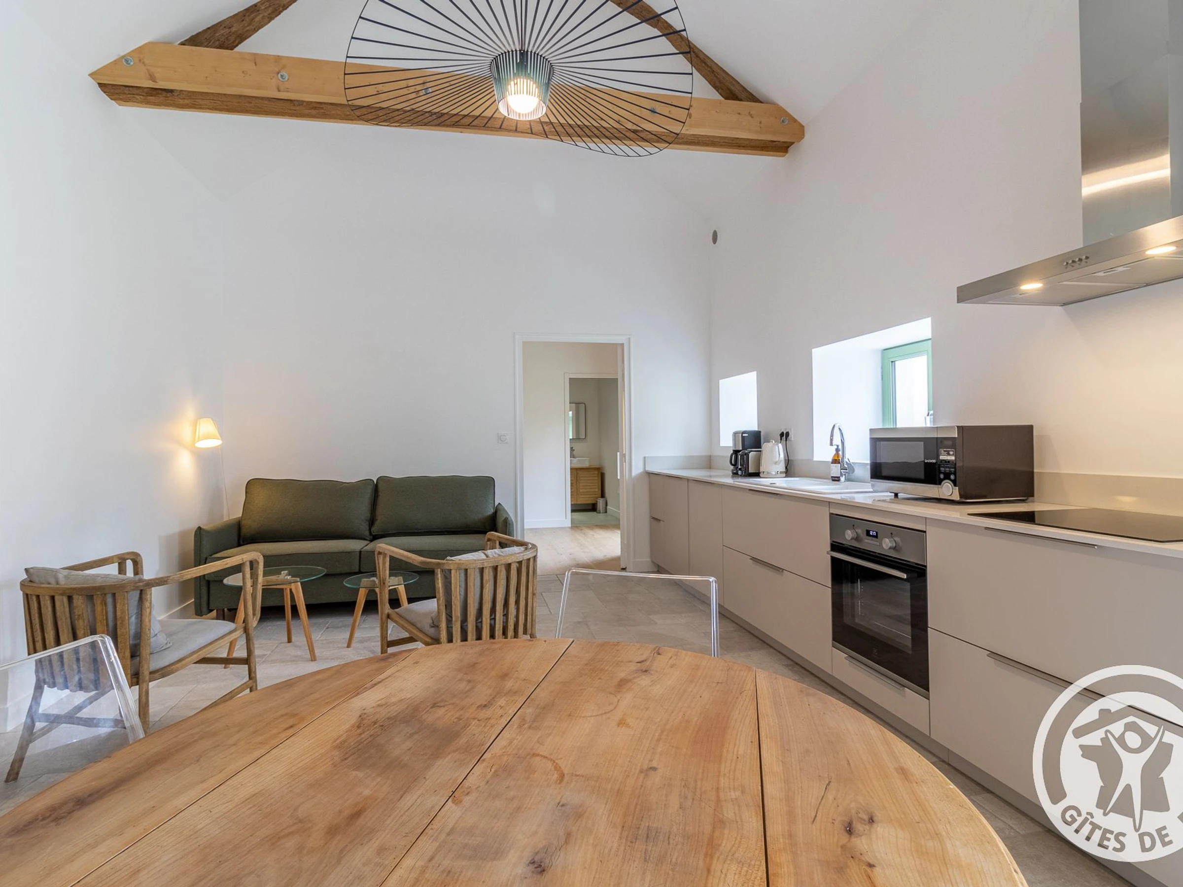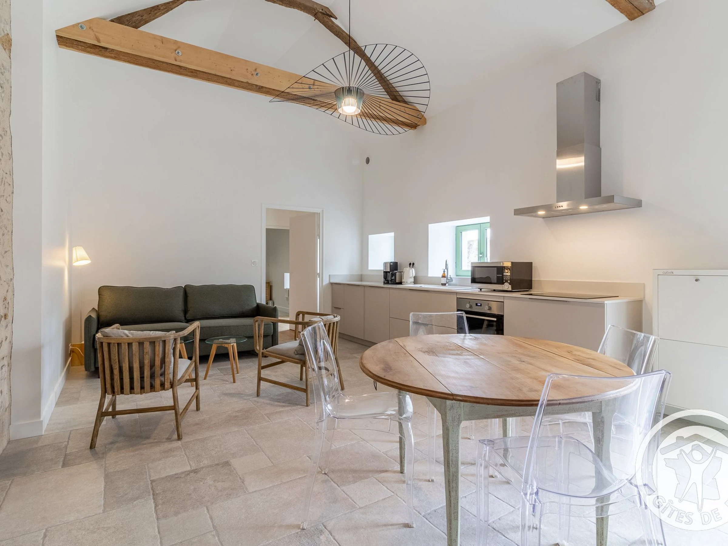 Pièce de vie avec belle hauteur sous plafond et poutres apparentes : table à manger, cuisine équipée (plaques induction, réfrigérateur, lave-vaisselle, four, micro-ondes, ...) et espace salon avec canapé convertible (160x190cm). Chambre munie d'un lit double 160x200cm avec salle de douche attenante (douche à l'italienne, lavabo, sèche-cheveux) disposant d'un accès direct à la terrasse. Wc indépendant avec lave-linge (accès par 2 marches depuis le salon)
