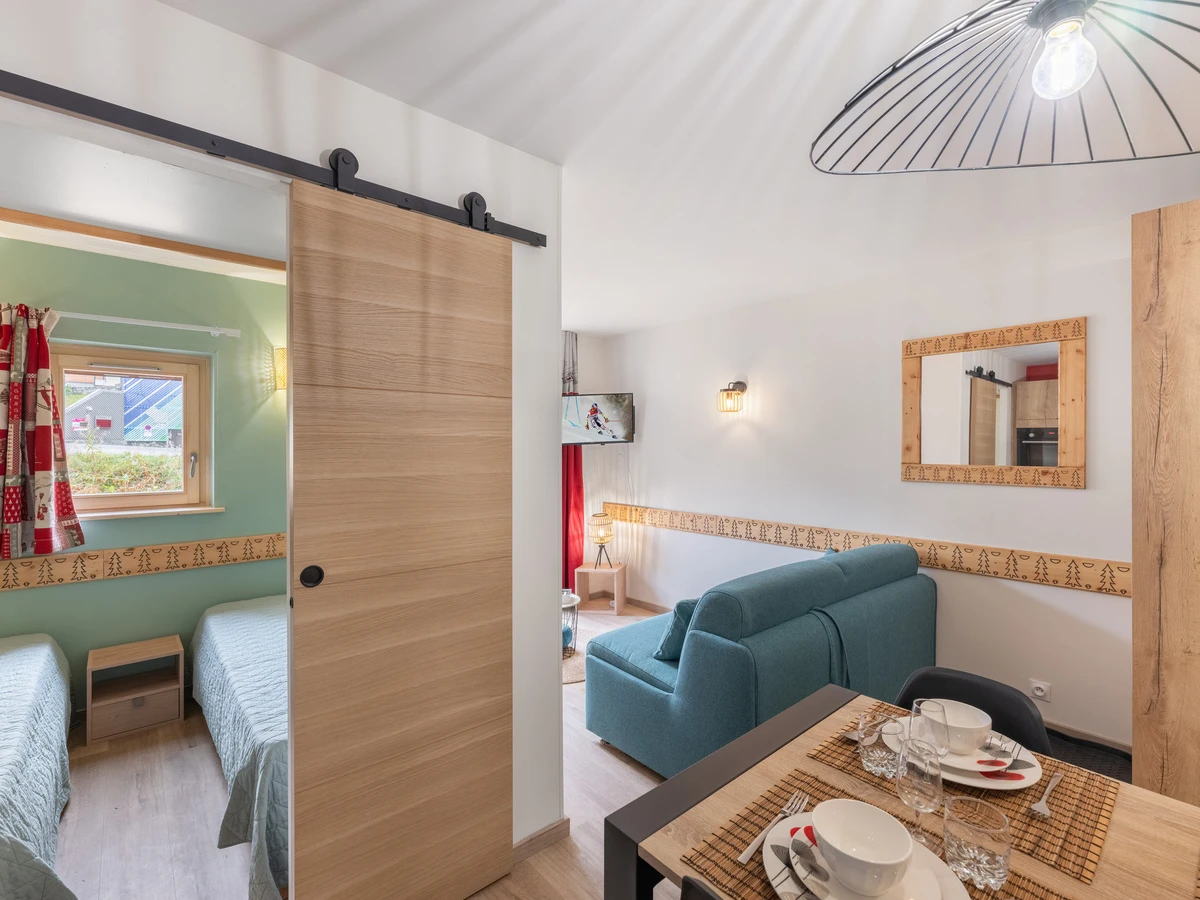 Une chambre avec lits twin compose cet appartement. Il dispose également d'une cuisine équipée et d'une salle d'eau avec une douche spacieuse. Le canapé du séjour est quant à lui convertible. Le mélange équilibré d'éléments de décoration au style montagnard et de touche plus moderne, offre une atmosphère chaleureuse à l'ensemble de l'appartement.