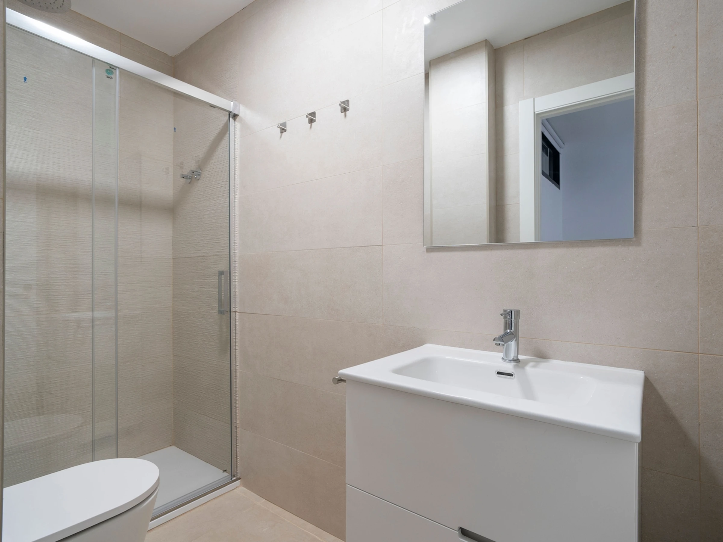La salle de bain, aux finitions aux tons doux, est dotée d'une douche à effet pluie pour un moment de détente.