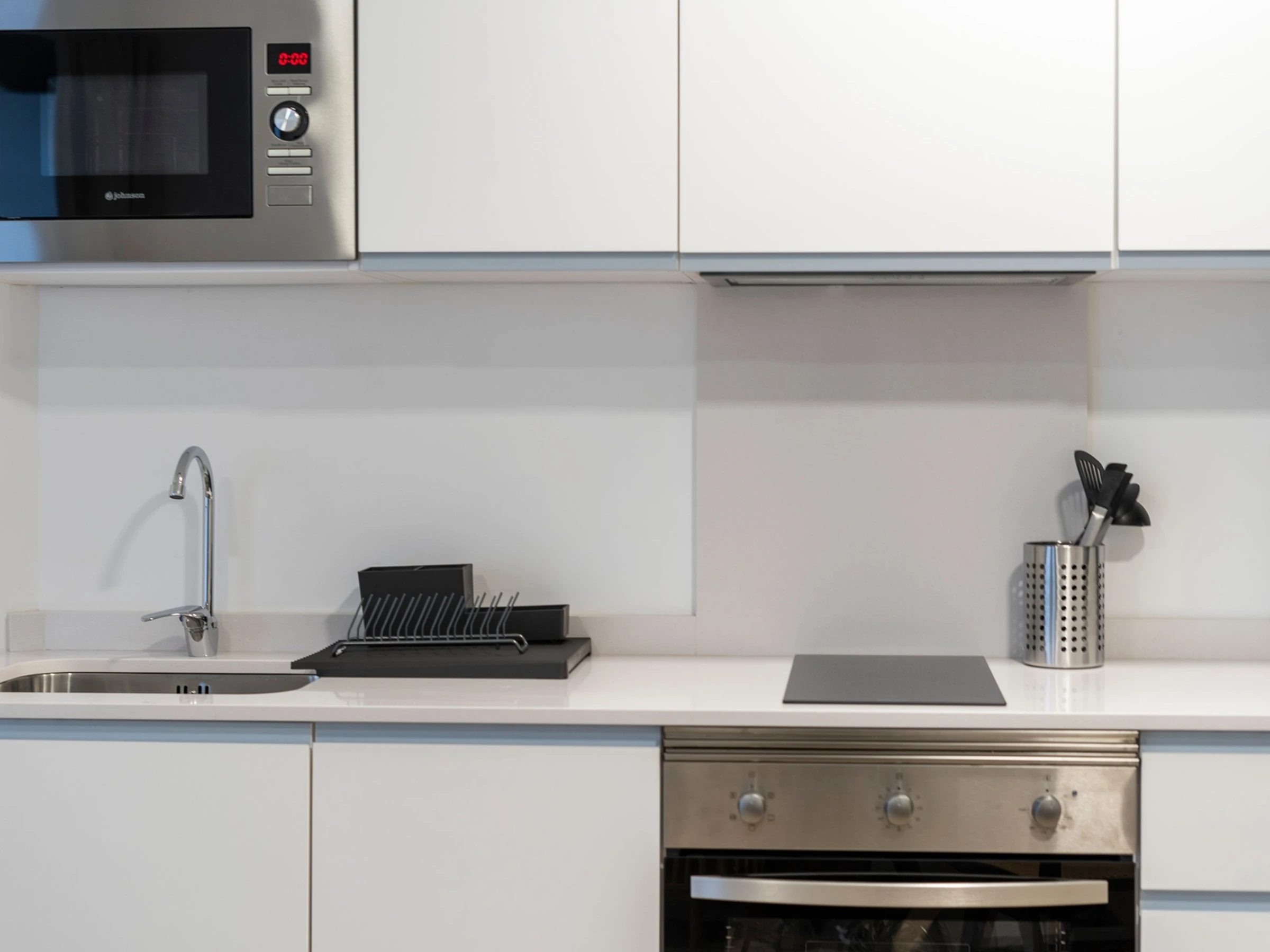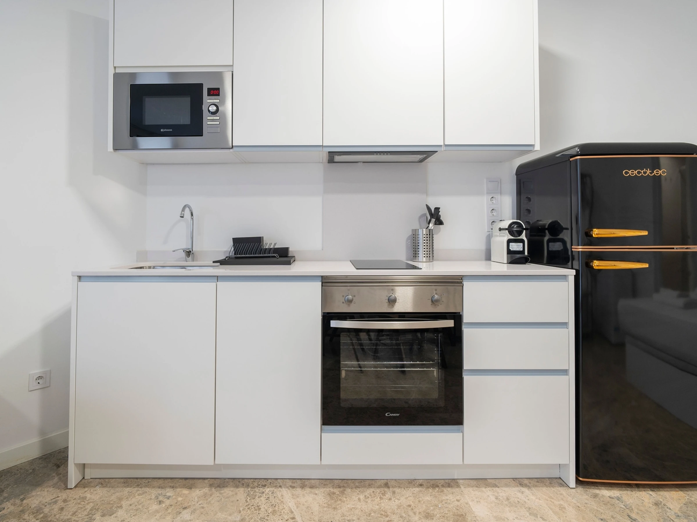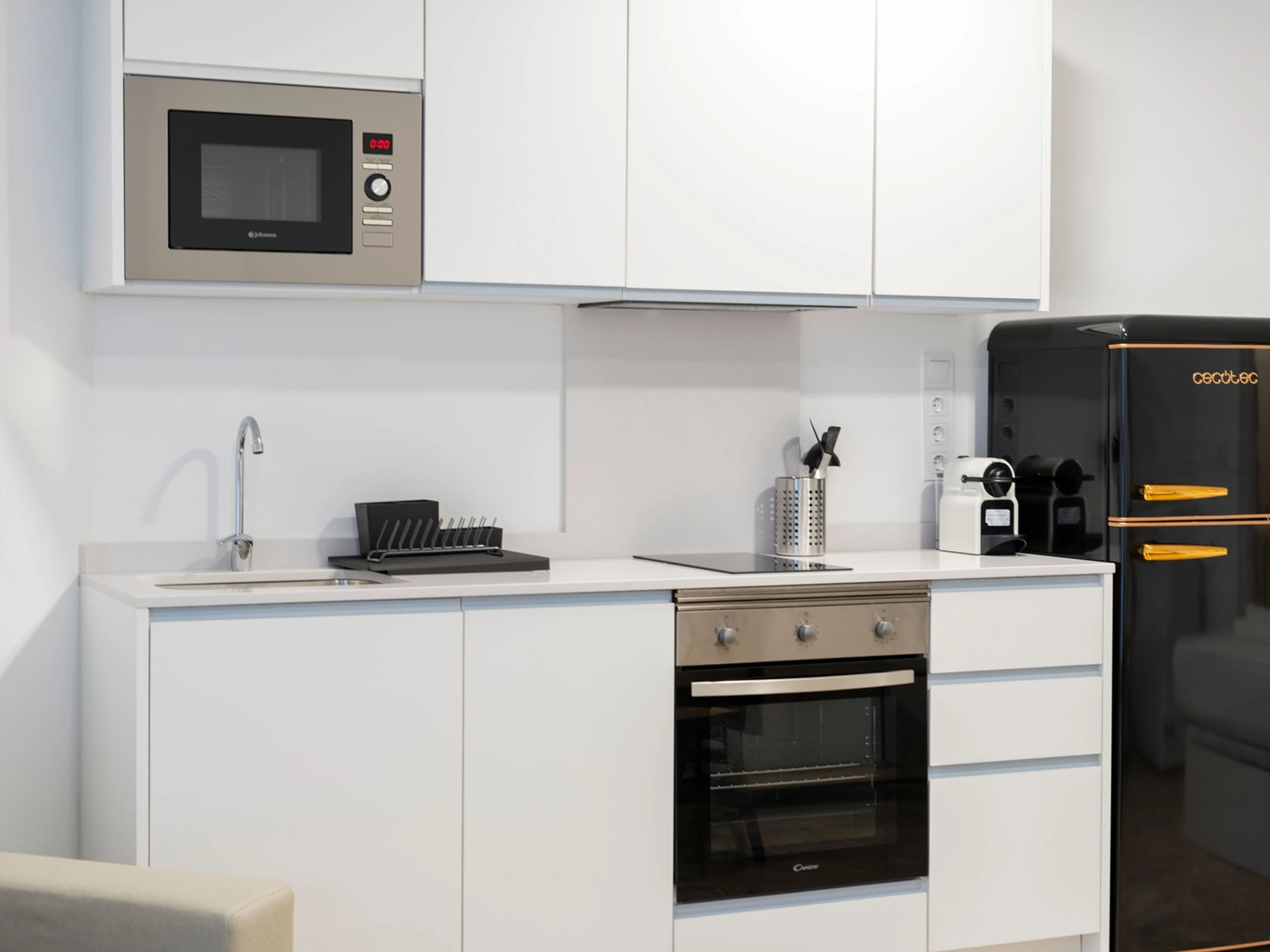 La cuisine comprend une plaque de cuisson vitrocéramique, les ustensiles et tout le nécessaire pour cuisiner confortablement.