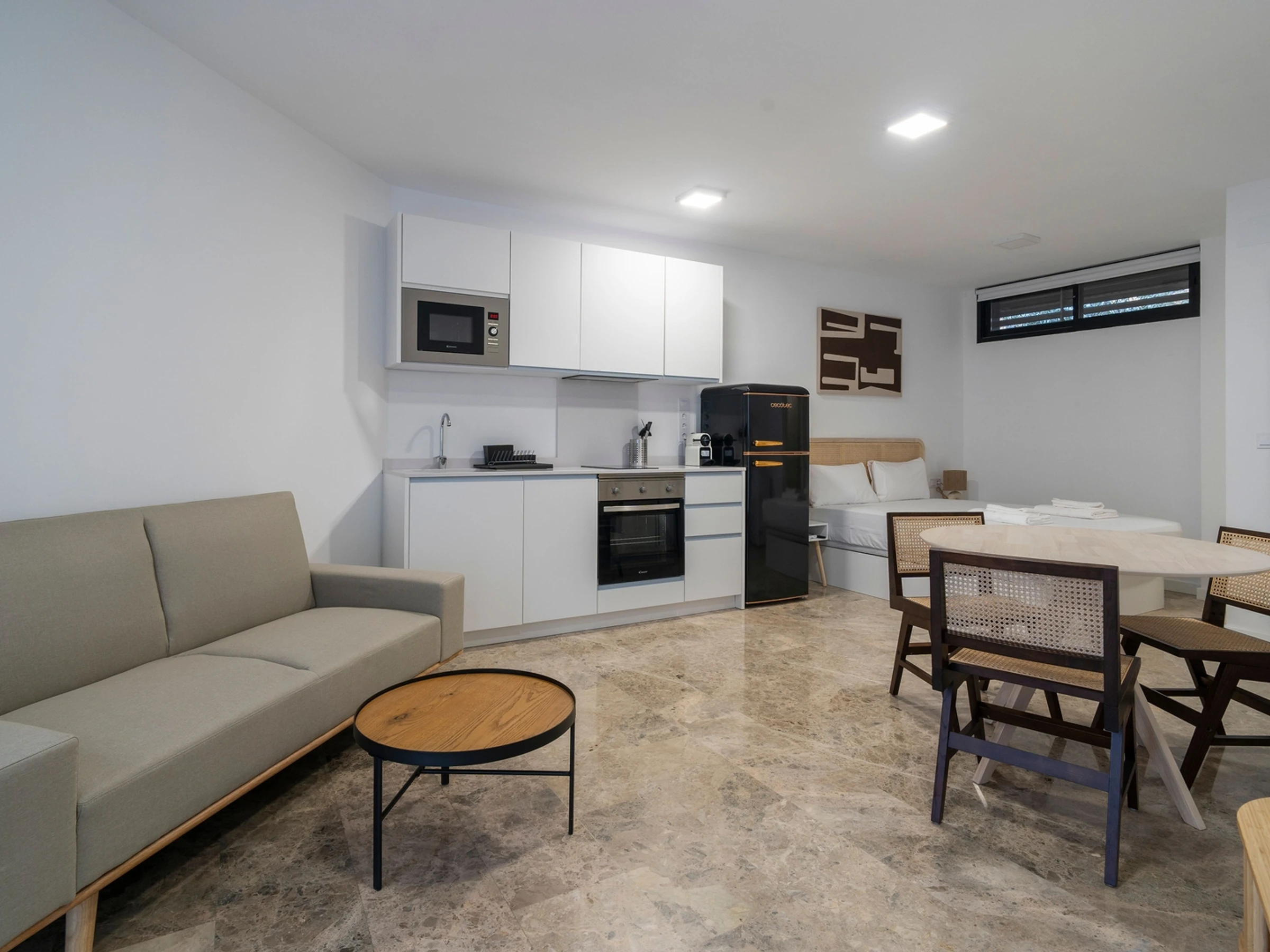 Les tons neutres et la lumière douce créent une atmosphère apaisante où vous vous sentirez à l'aise dès votre arrivée. L'espace est agencé de façon fonctionnelle, avec une cuisine équipée d'appareils modernes, un coin nuit avec un grand lit et un salon avec canapé-lit.