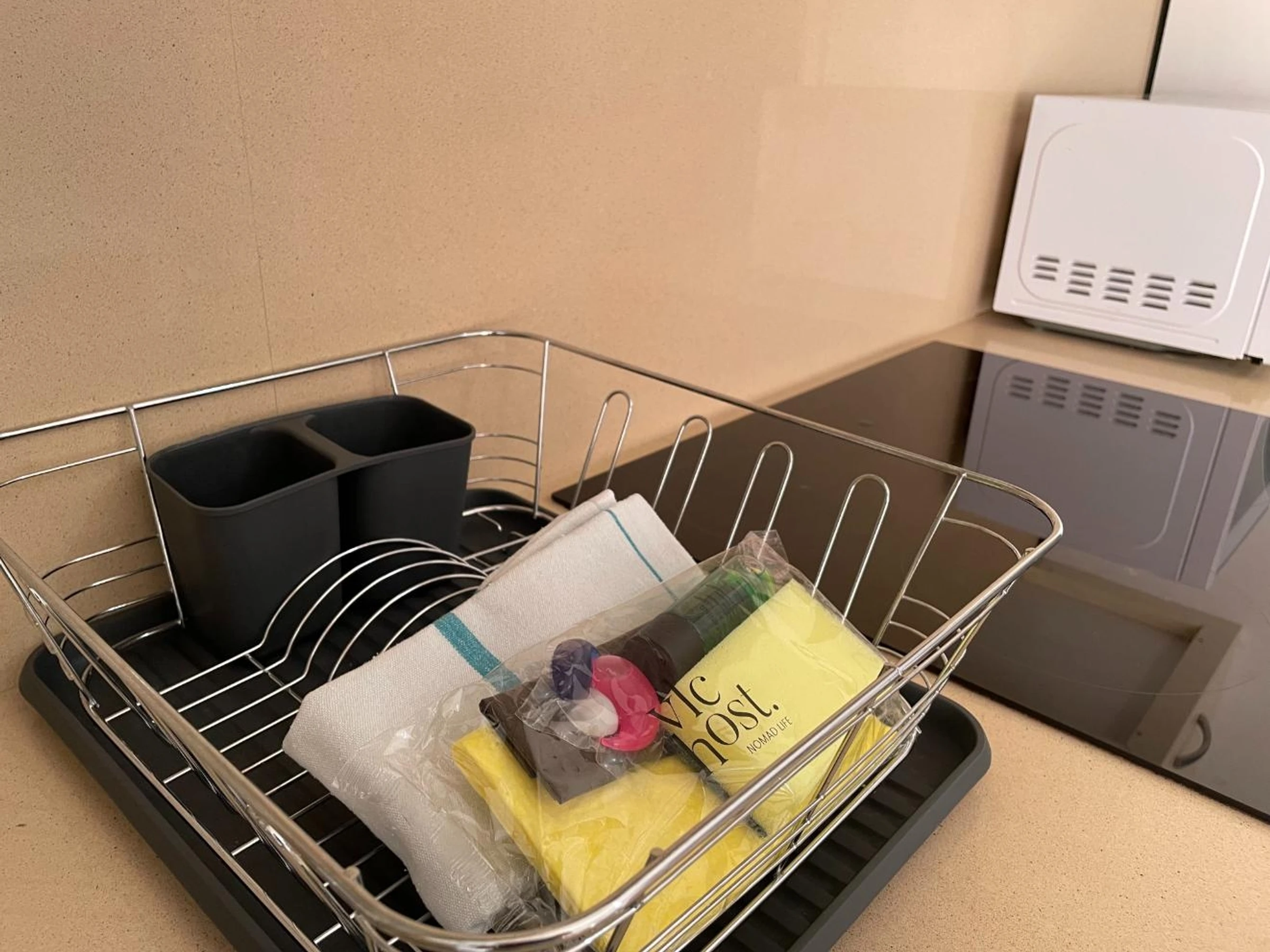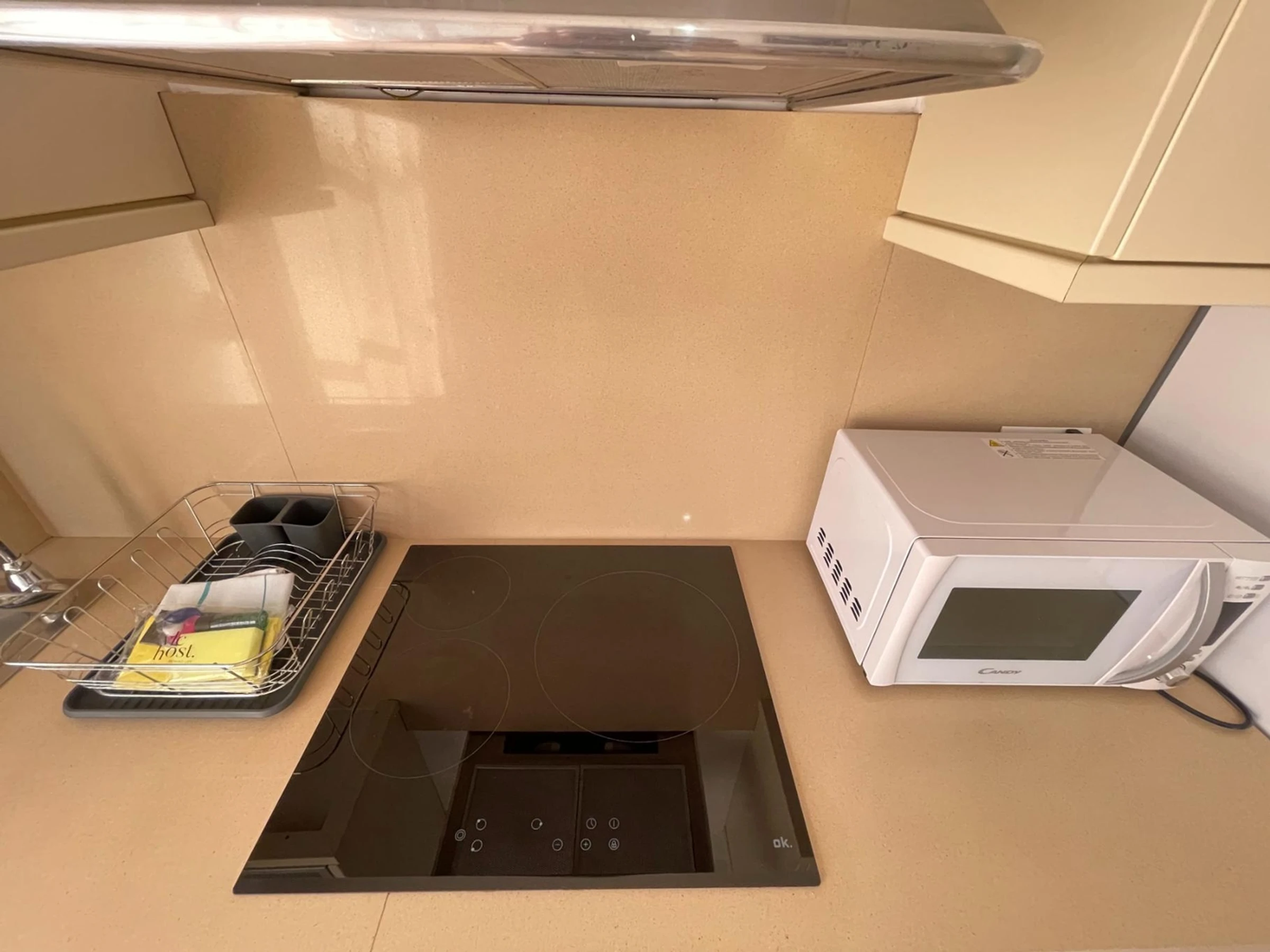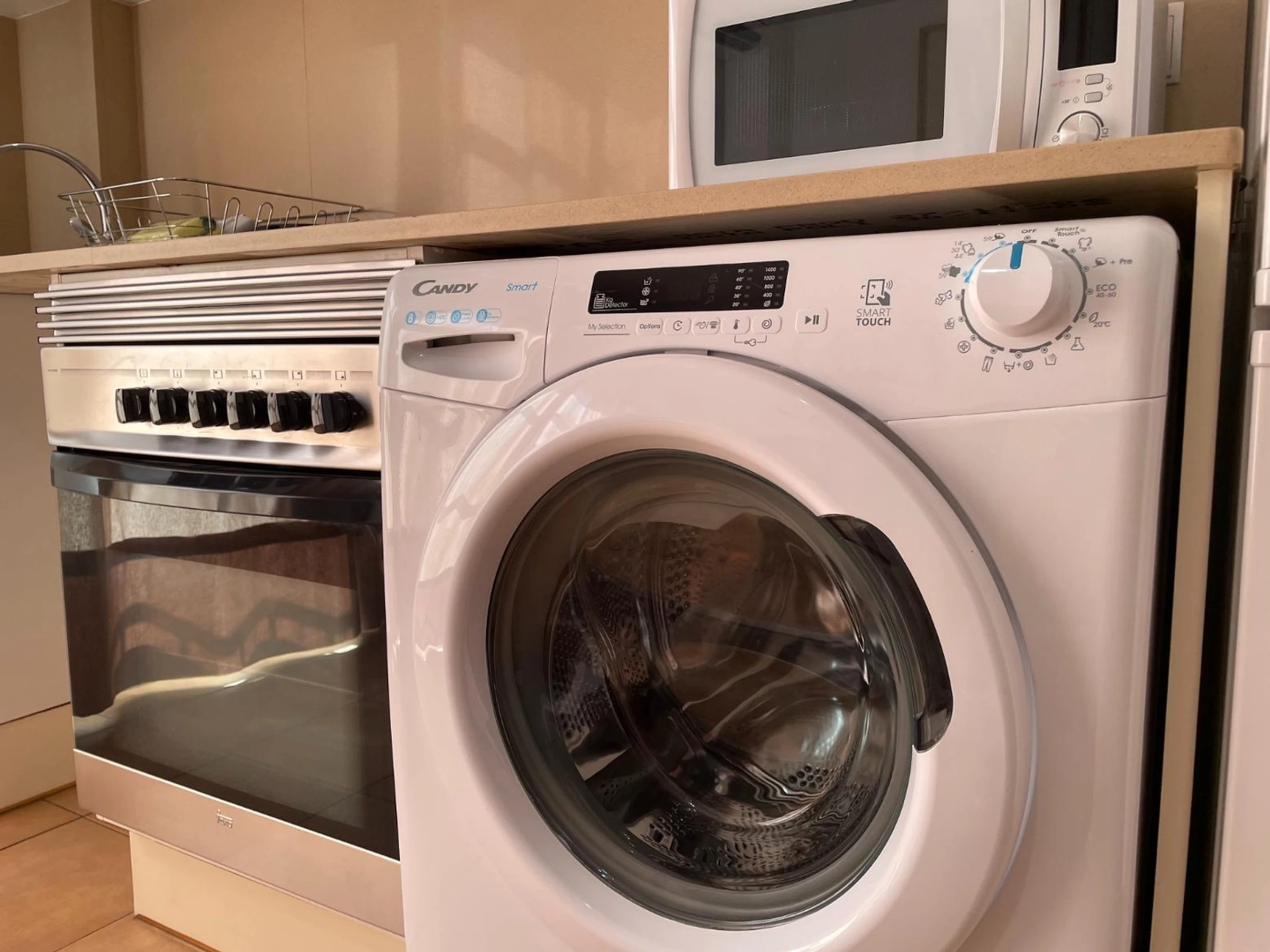 La cuisine est entièrement équipée avec tout le nécessaire pour préparer de délicieux repas maison, et comprend également un lave-linge, un four et un micro-ondes pour plus de commodité. Quelle que soit la saison, profitez d'un séjour confortable grâce à la climatisation et au chauffage du studio.