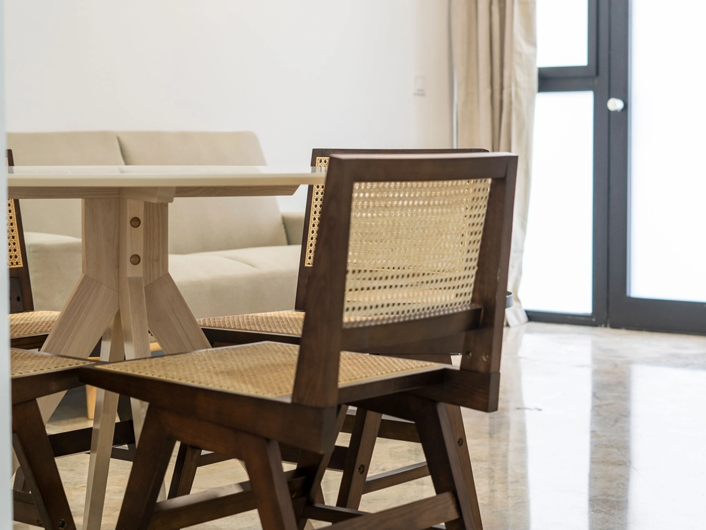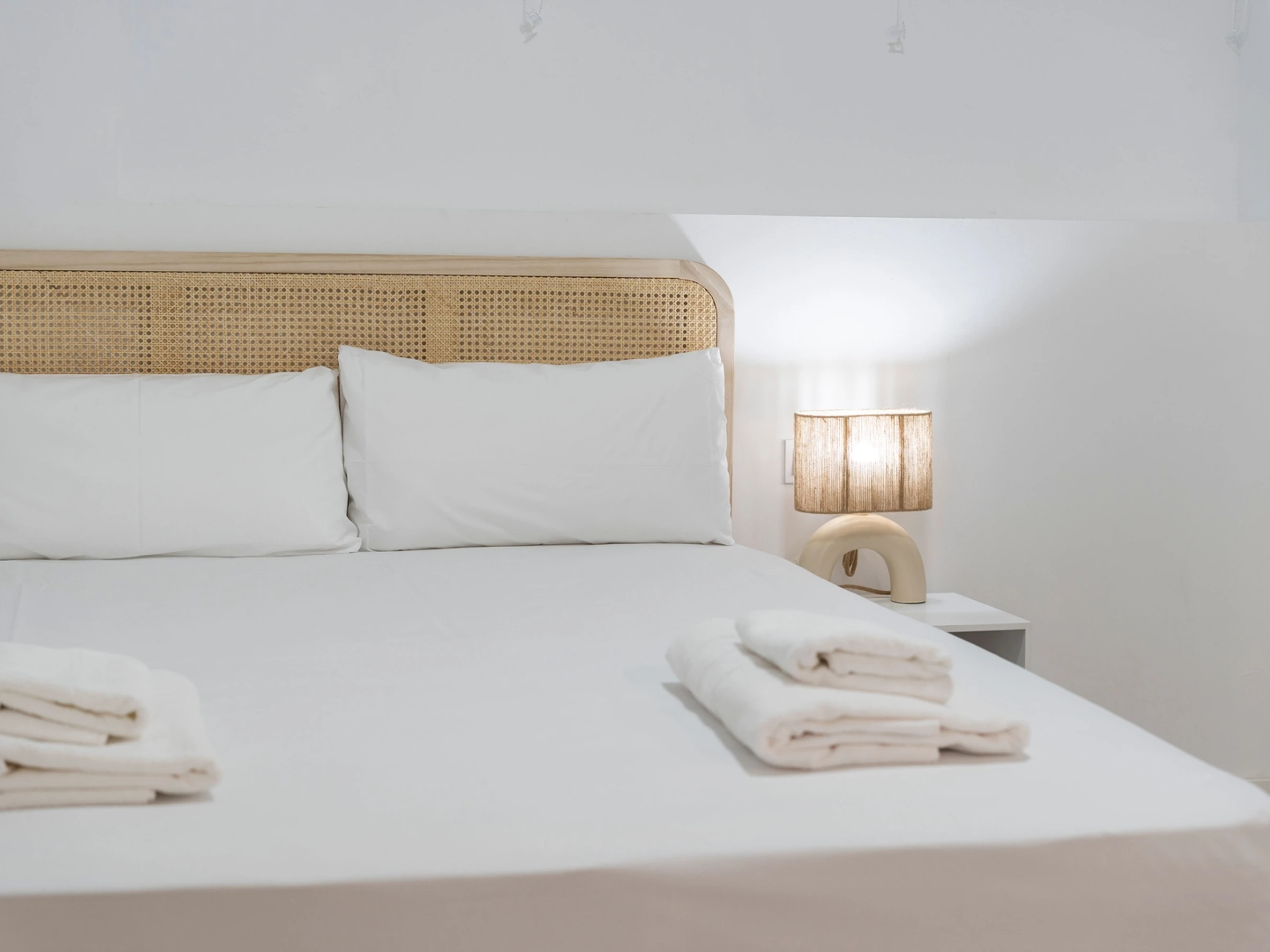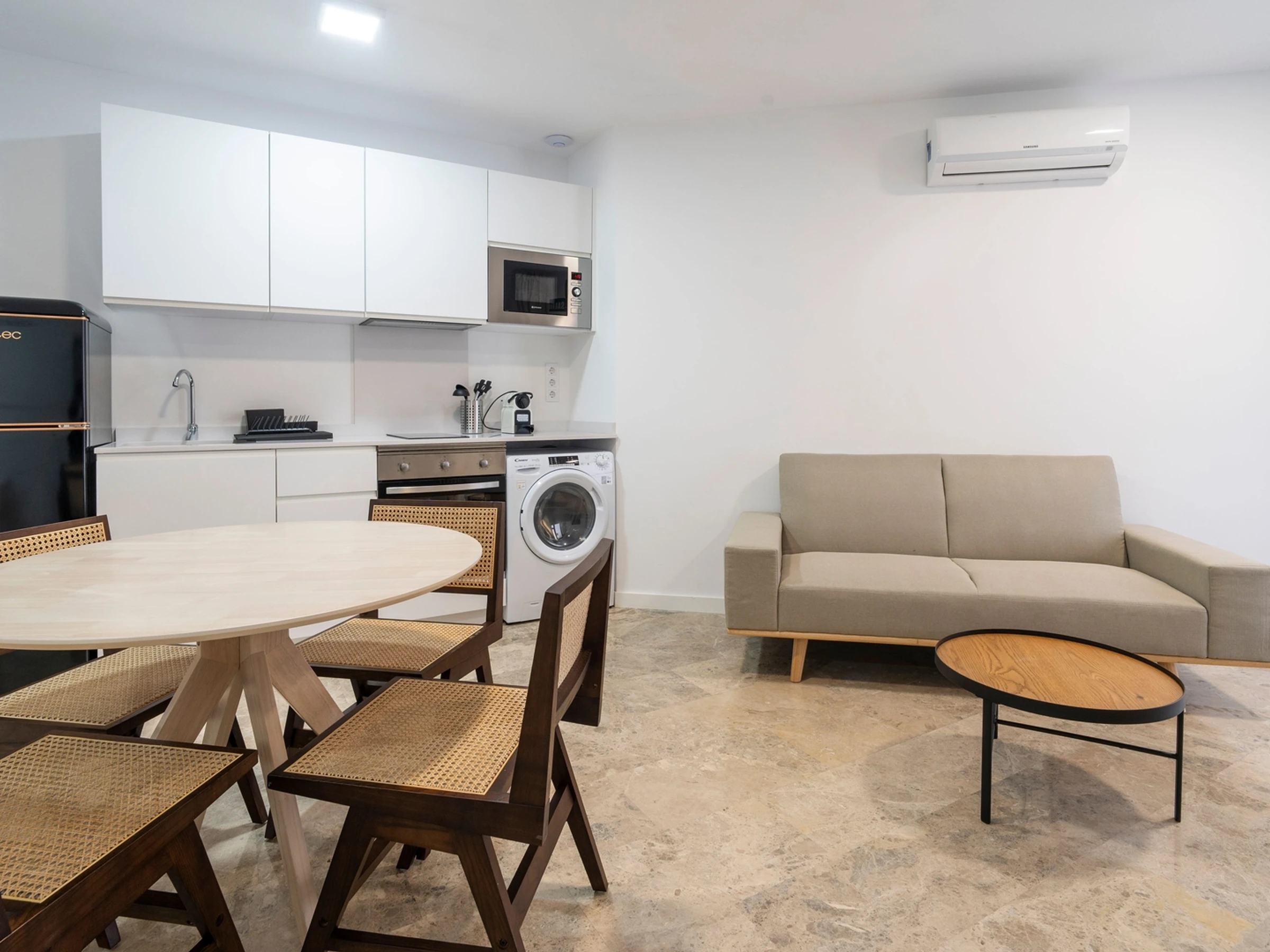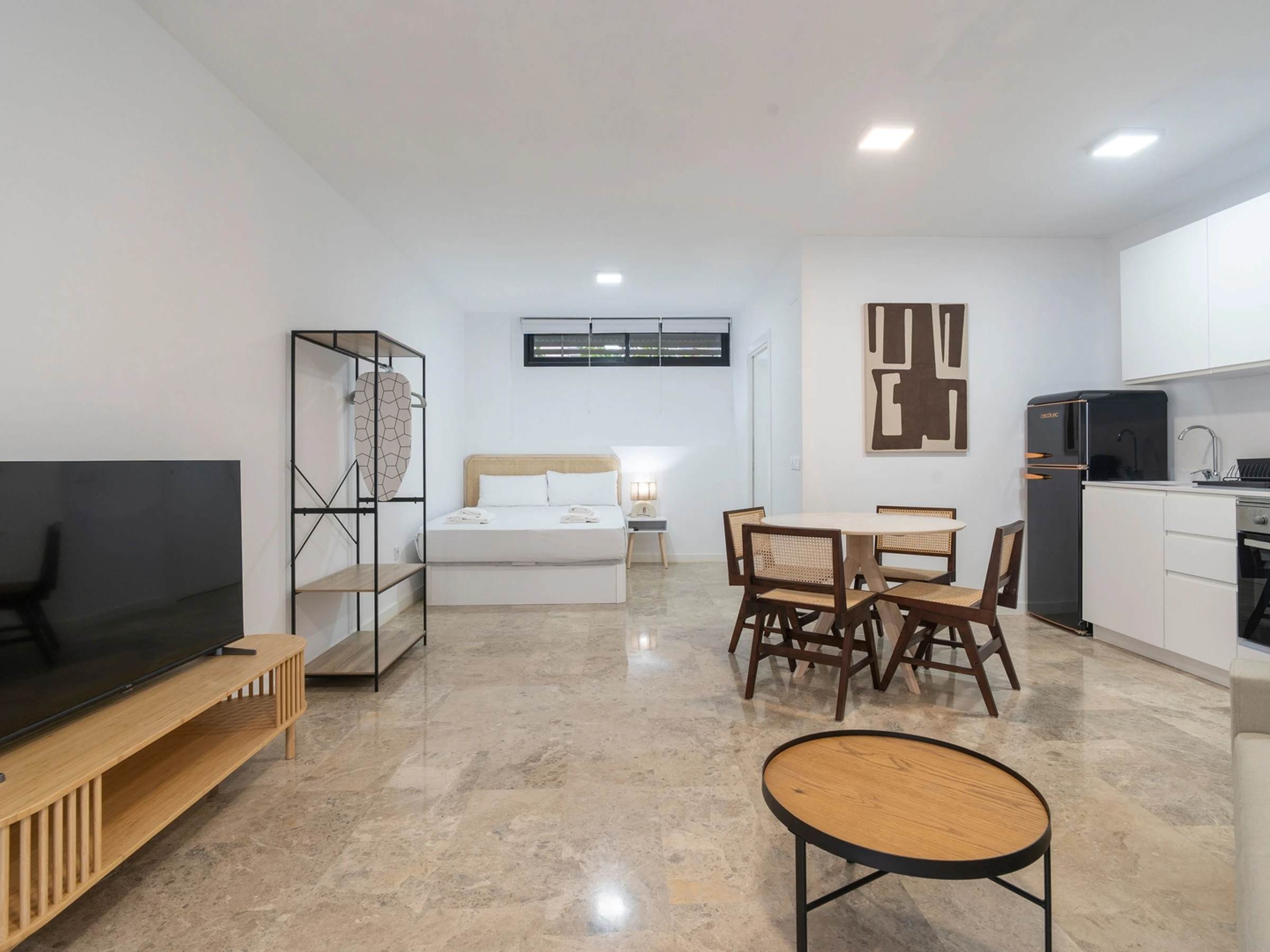 La décoration aux tons neutres, avec des touches de bois et de fibres naturelles, apporte une note moderne et apaisante. Cet espace ouvert comprend une cuisine entièrement équipée, un coin nuit avec un lit confortable et un salon avec canapé-lit.