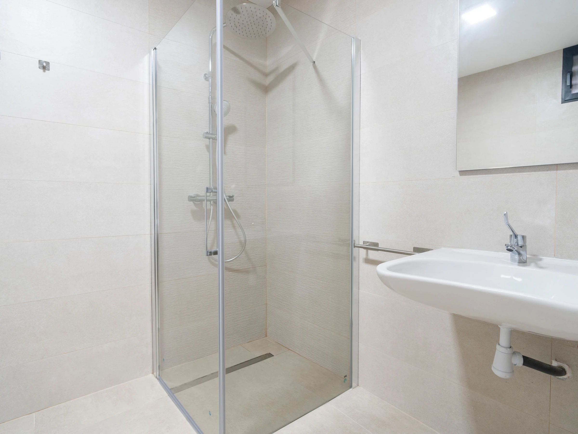 La salle de bain moderne et élégante est dotée d'une douche à effet pluie et de finitions aux tons doux, créant une ambiance fraîche et apaisante.