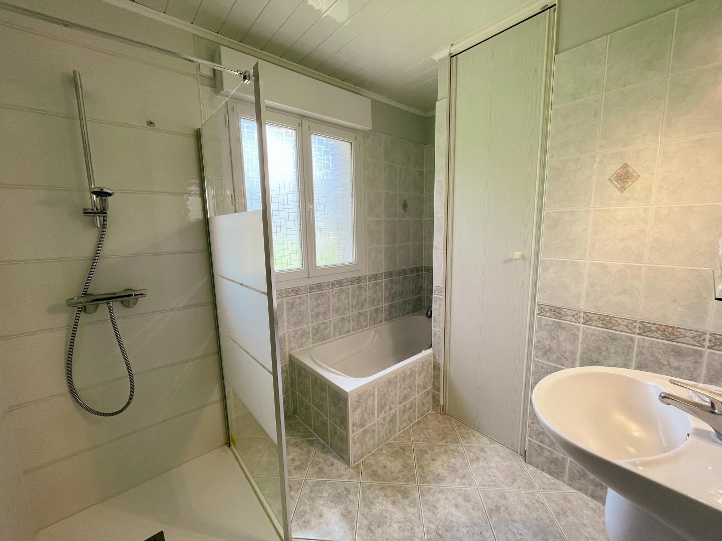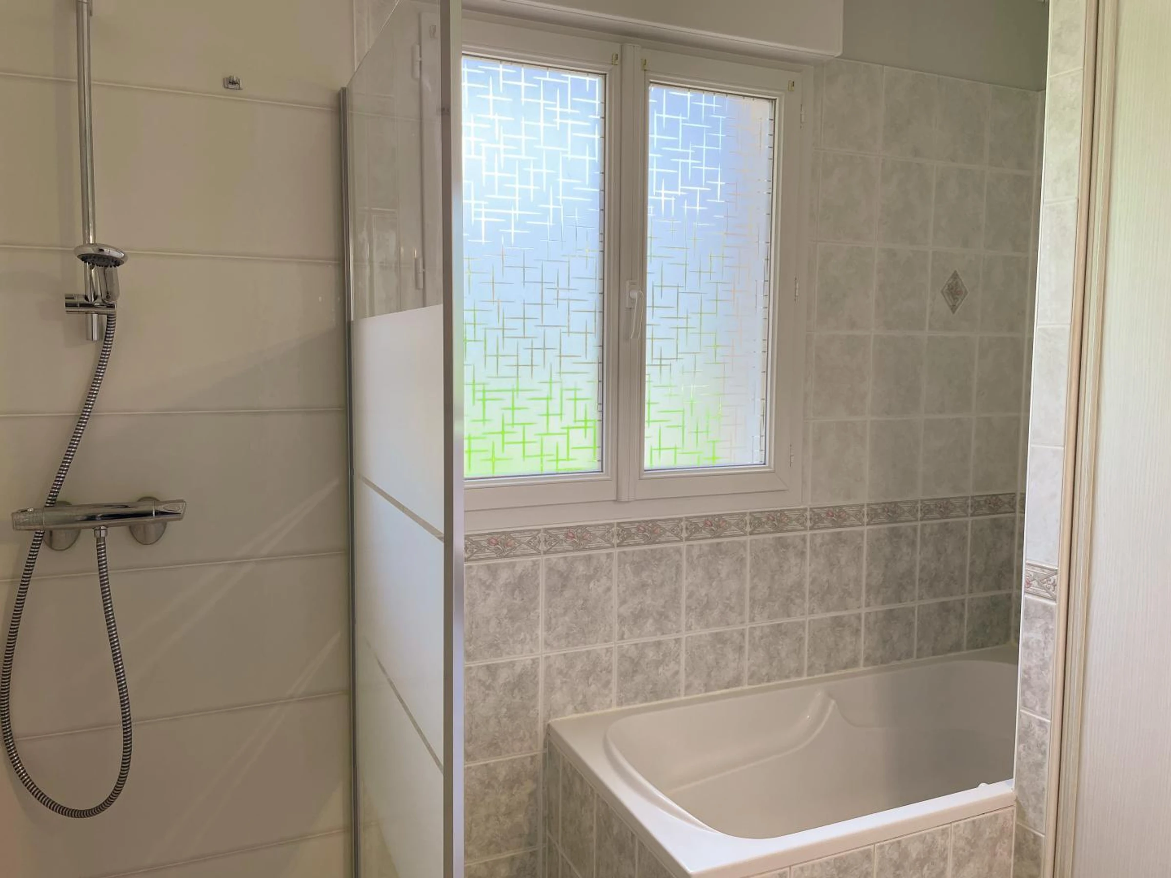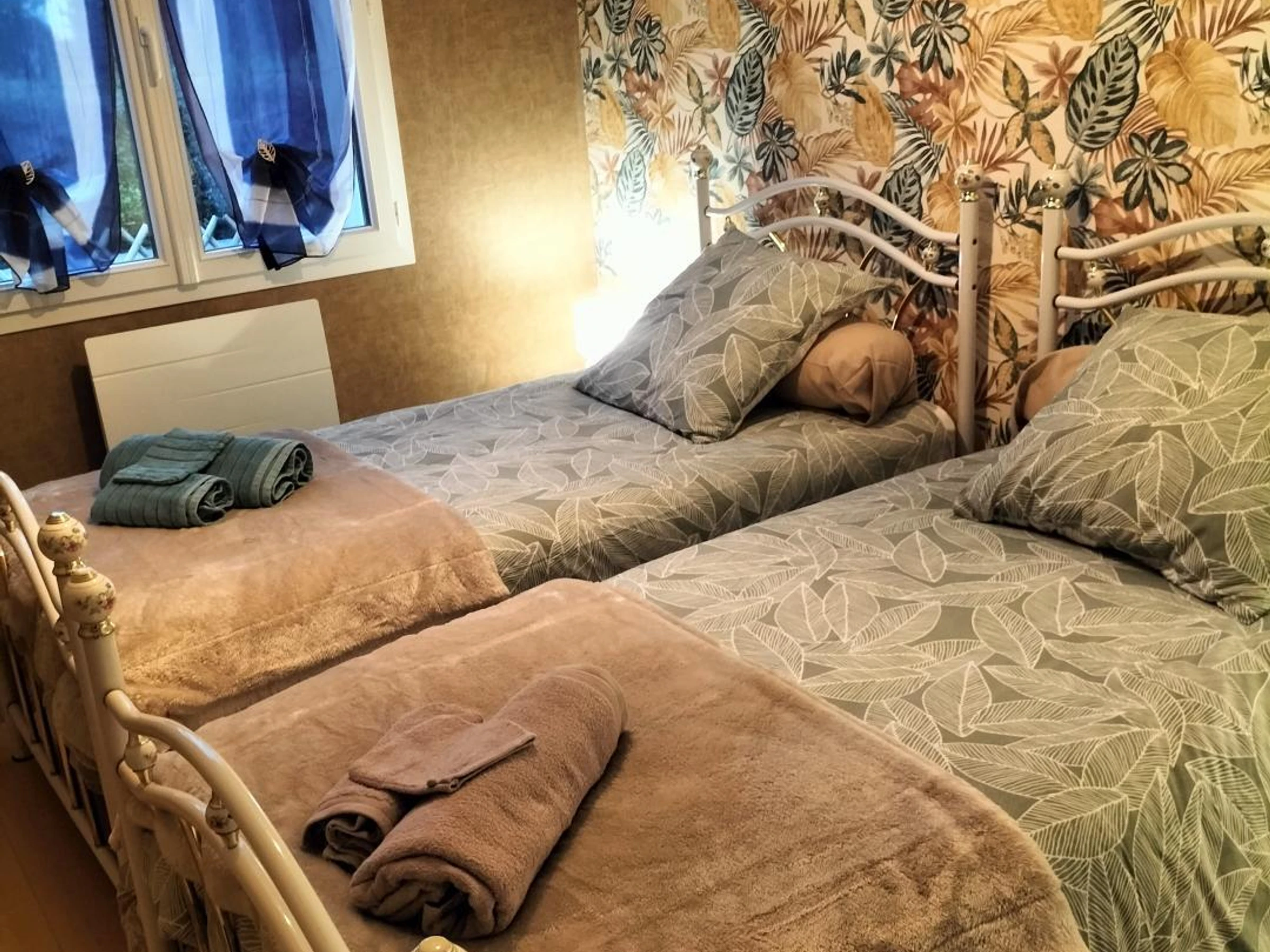 Au [hidden] : 1 salon-séjour (penderie dans l'entrée) avec coin salon (TV) et coin salle à manger (table 8 personnes) et coin cuisine ouverte aménagée. 1 arrière-cuisine. 1 garage. 1 ch. 1 lit de 140x190. 1 ch 2 lits de 90x190. 1 ch 2 lits de 80x200 jumelables (=1 lit double 160x200). 1 salle de bain (baignoire + douche + lavabo). 1 WC indépendant.