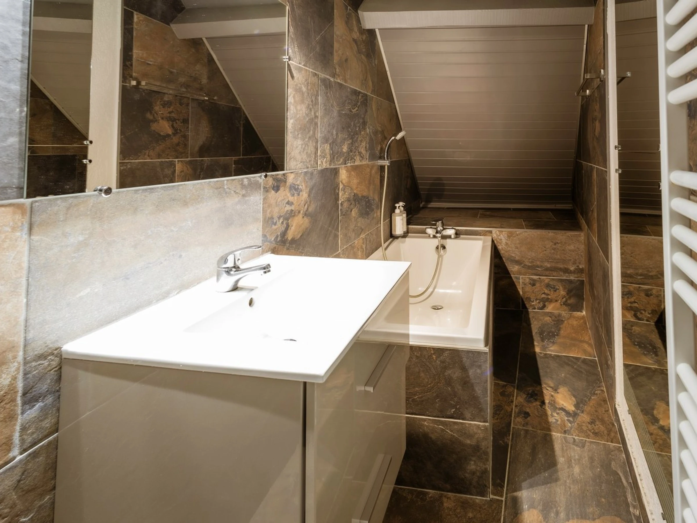 Salle de bains 2 (Niv +1) : lavabo, baignoire, WC et sèche-cheveux. WC indépendant.