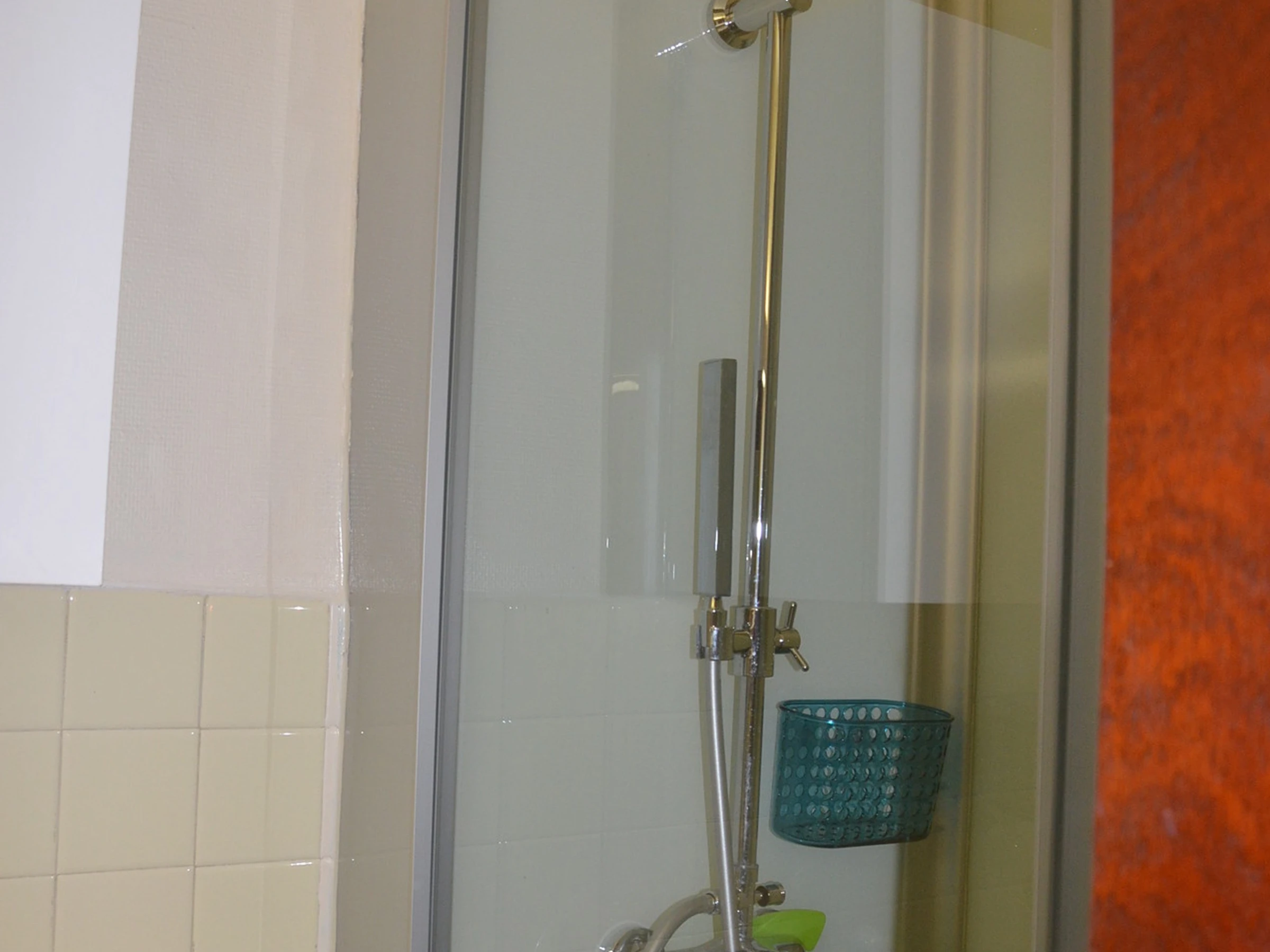 Salle d'eau : douche, lavabo et sèche-cheveux.