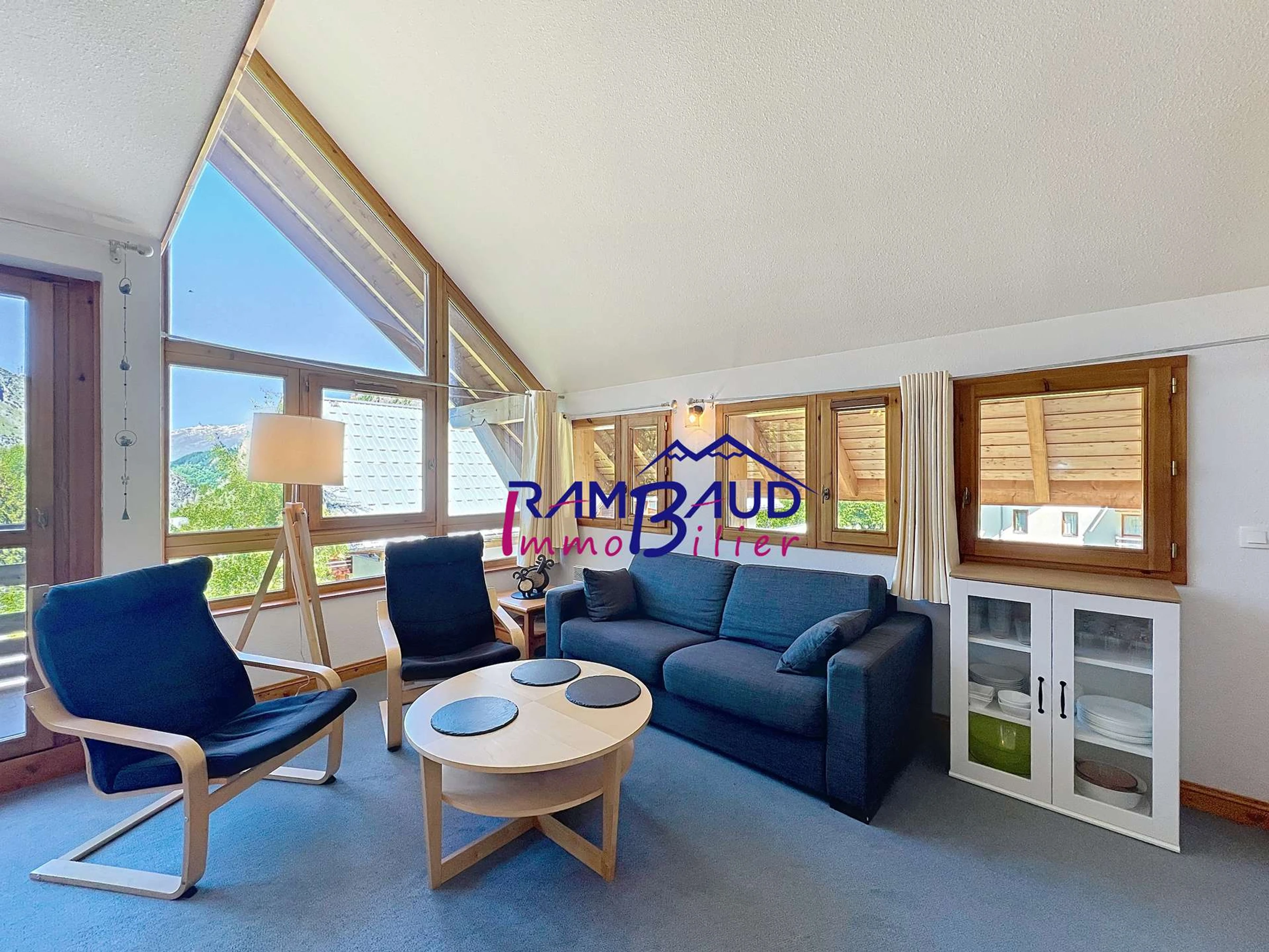 - Séjour cathédrale avec canapé, kitchenette, balcon Nord.
