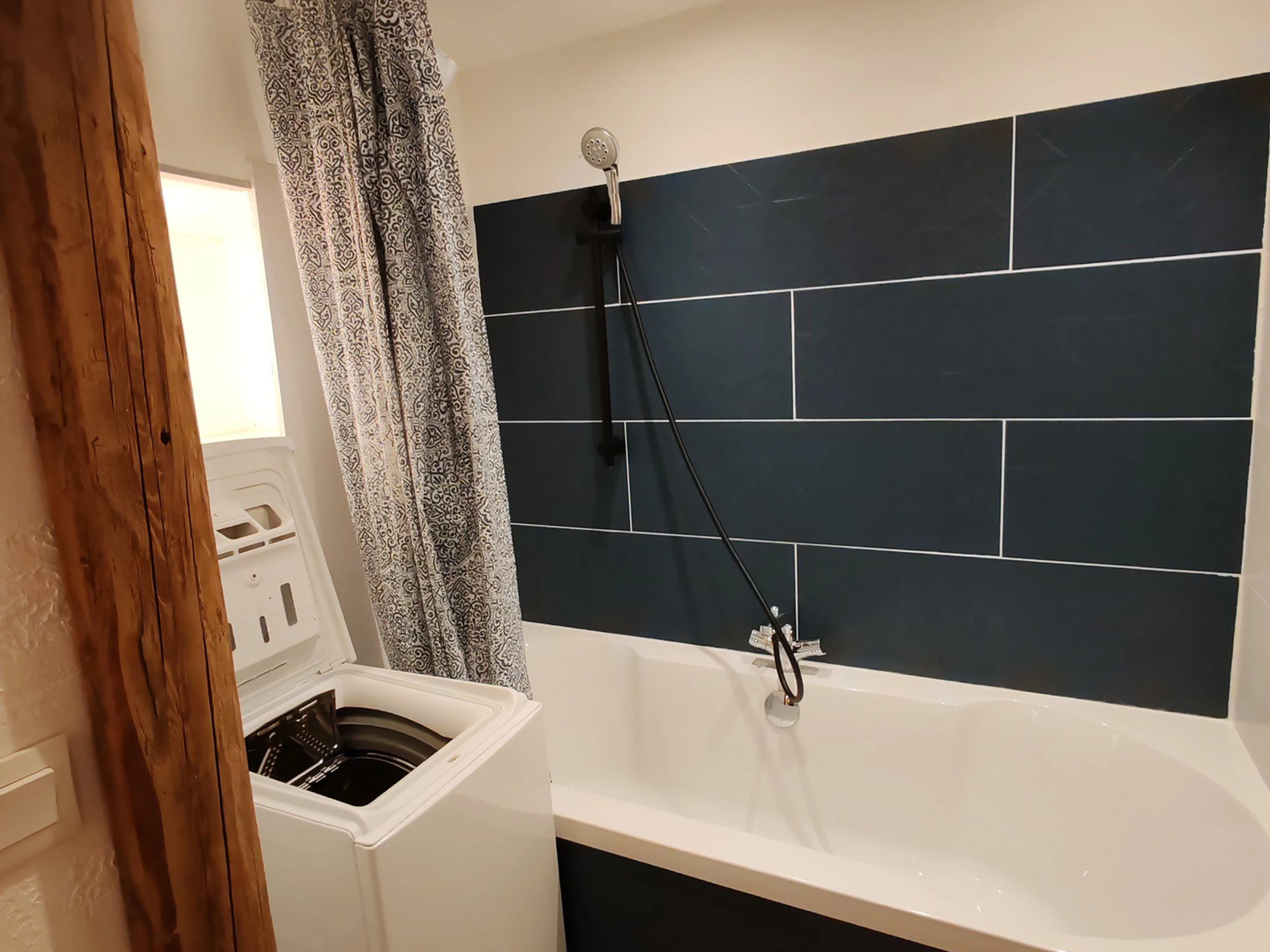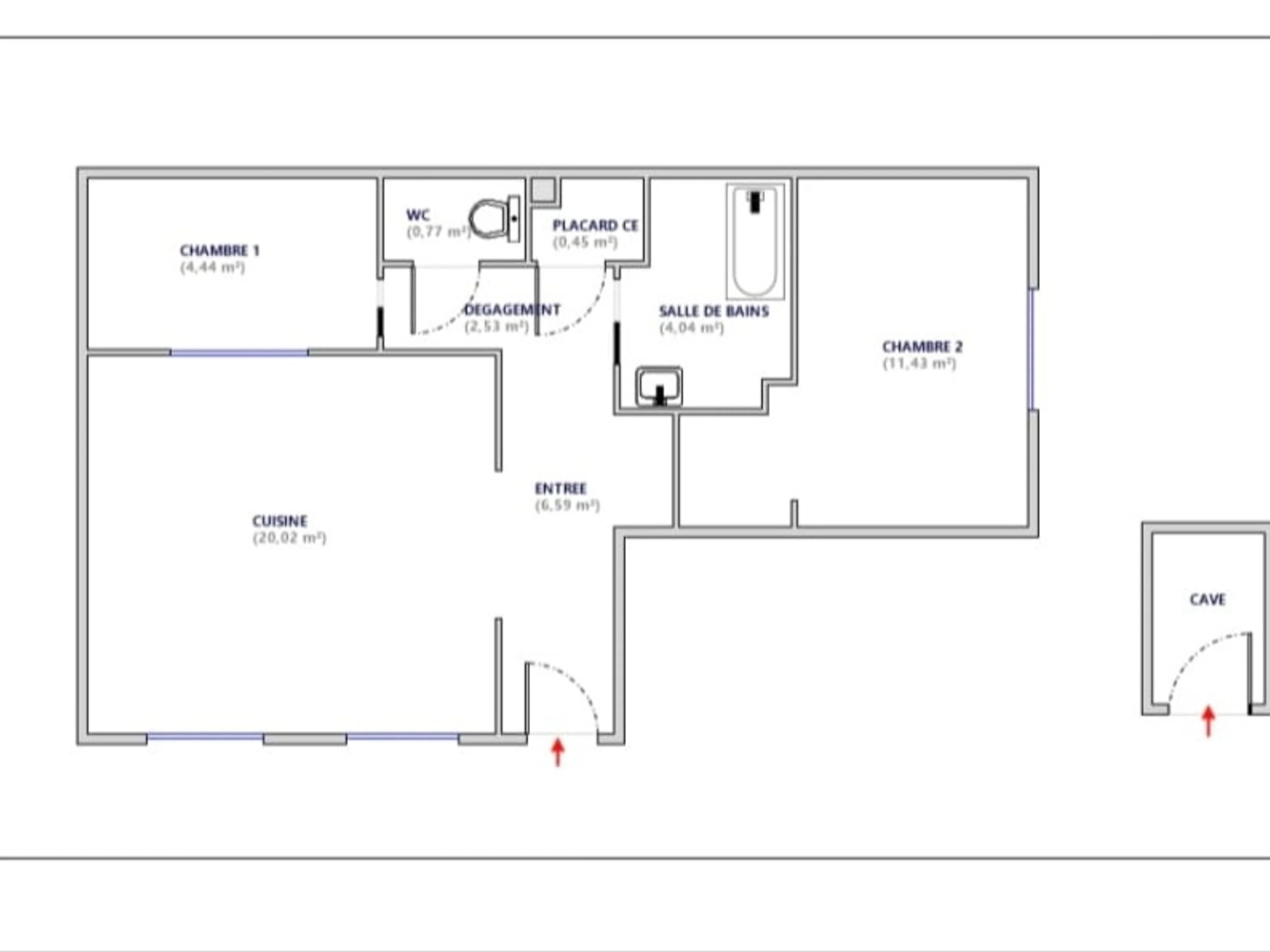 Salle de bains (4m²) : lavabo, baignoire, lave-linge. WC indépendant.