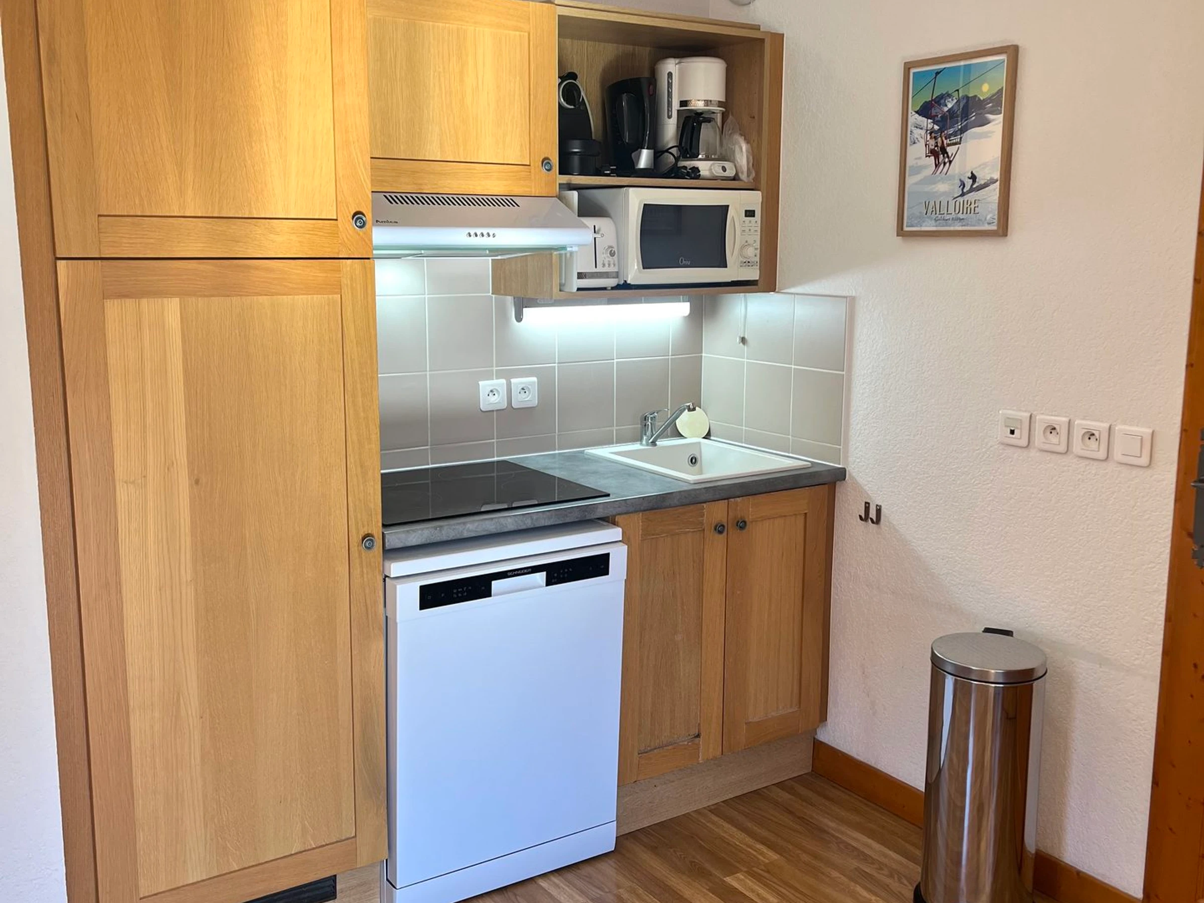 Coin cuisine : mini-four, micro-ondes, plaque vitrocéramique (4 foyers), lave-vaisselle, réfrigérateur