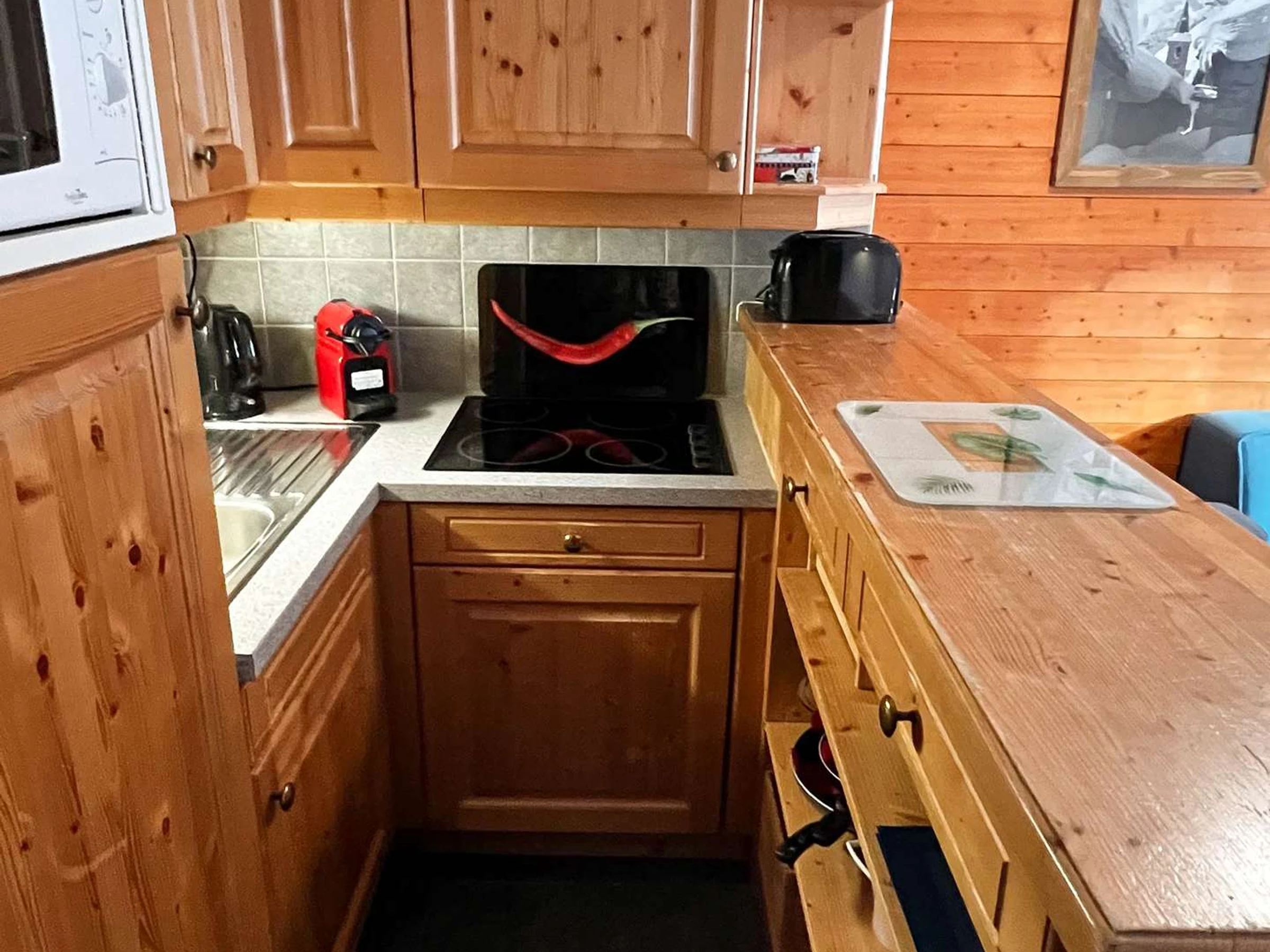 Coin cuisine : micro-ondes, lave-vaisselle, réfrigérateur, plaques vitrocéramique, 1 cafetière filtre, 1 grille pain, 1 bouilloire, une nespresso.