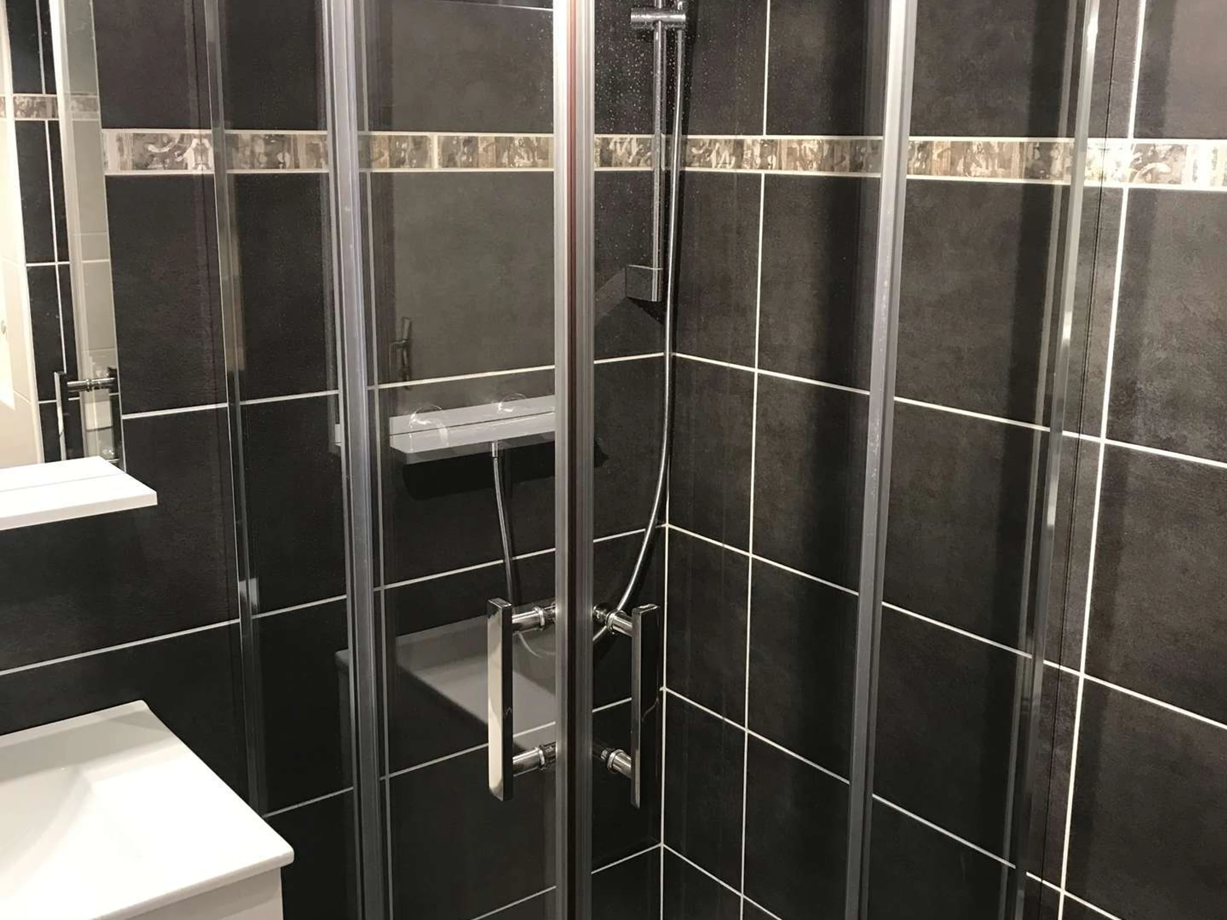 Salle d'eau : lavabo, douche, sèche-cheveux, WC incorporés.