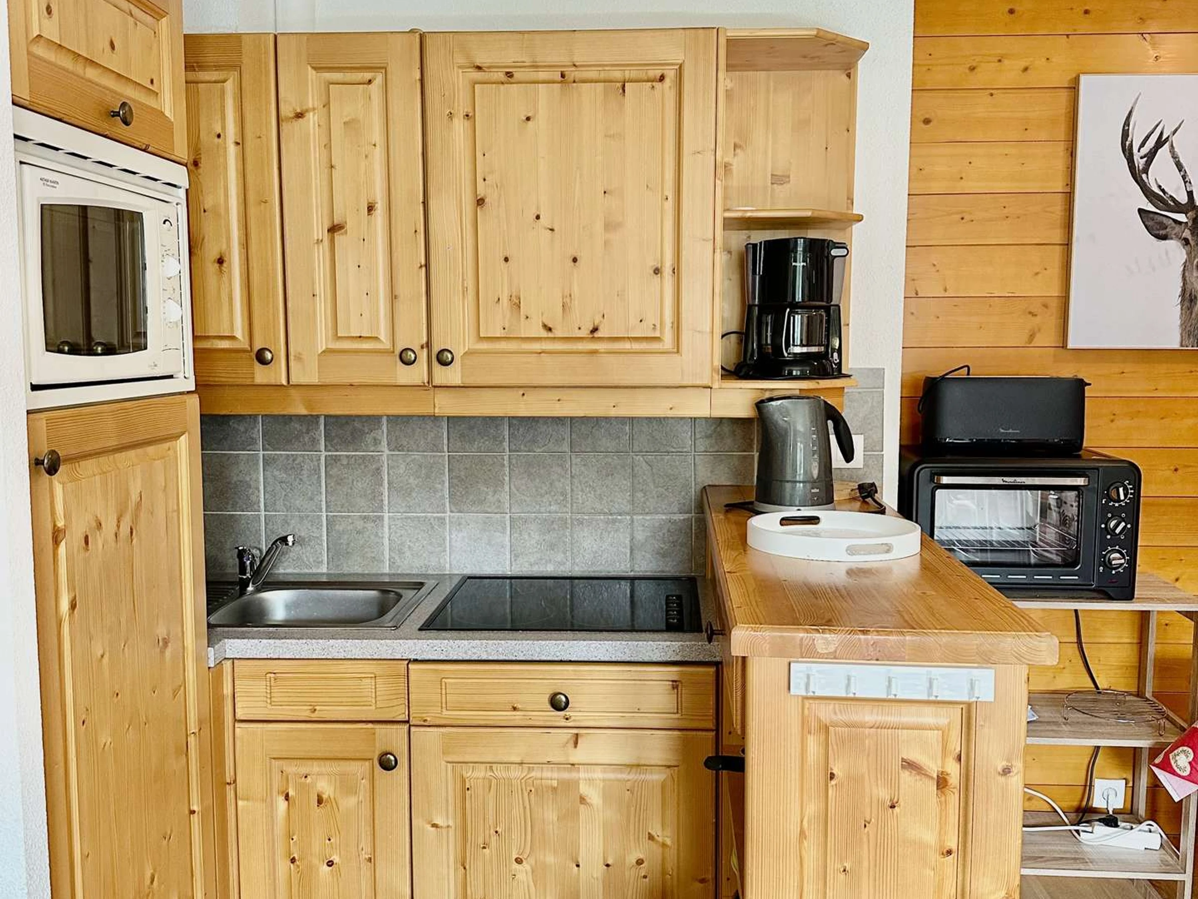 coin cuisine: micro-ondes avec grill, lave-vaisselle, réfrigérateur/congélateur, plaque vitrocéramique 4 feux, 1 cafetière filtre, 1 grille pain.