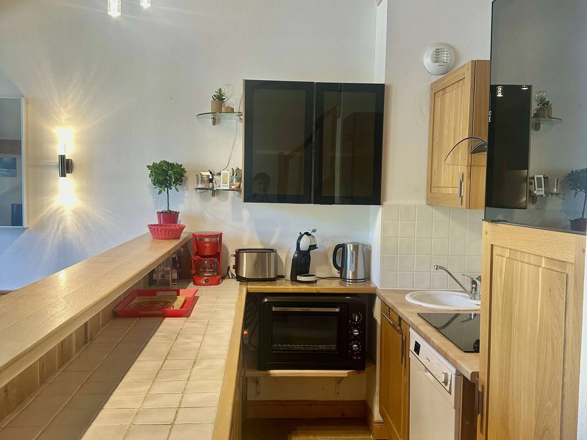 séjour, télévision, coin cuisine avec micro-ondes, lave-vaisselle, réfrigérateur, plaques vitrocéramiques, four.1 cafetière filtre, 1 Dolce Gusto, 1 bouilloire, 1 grille pain .