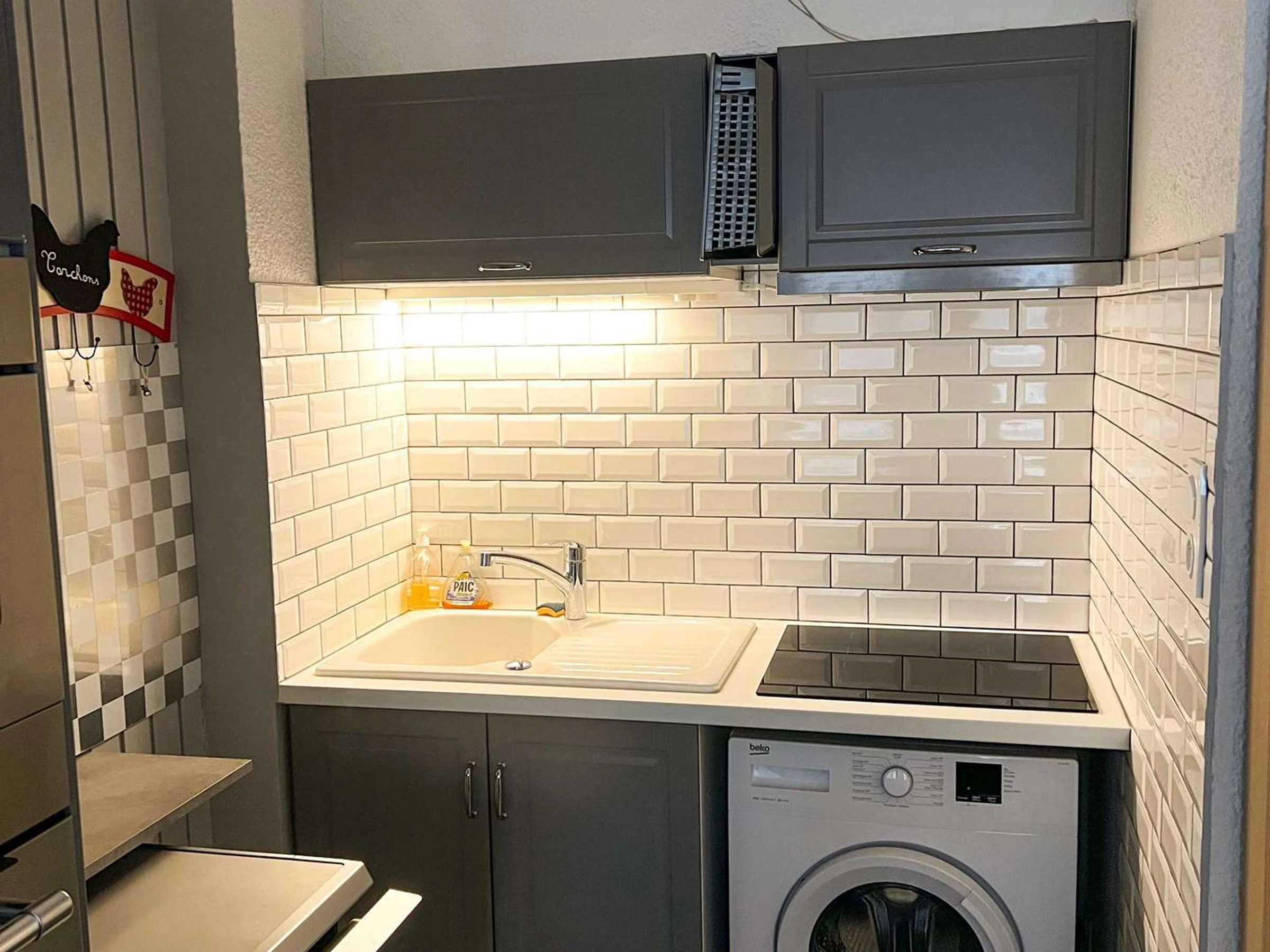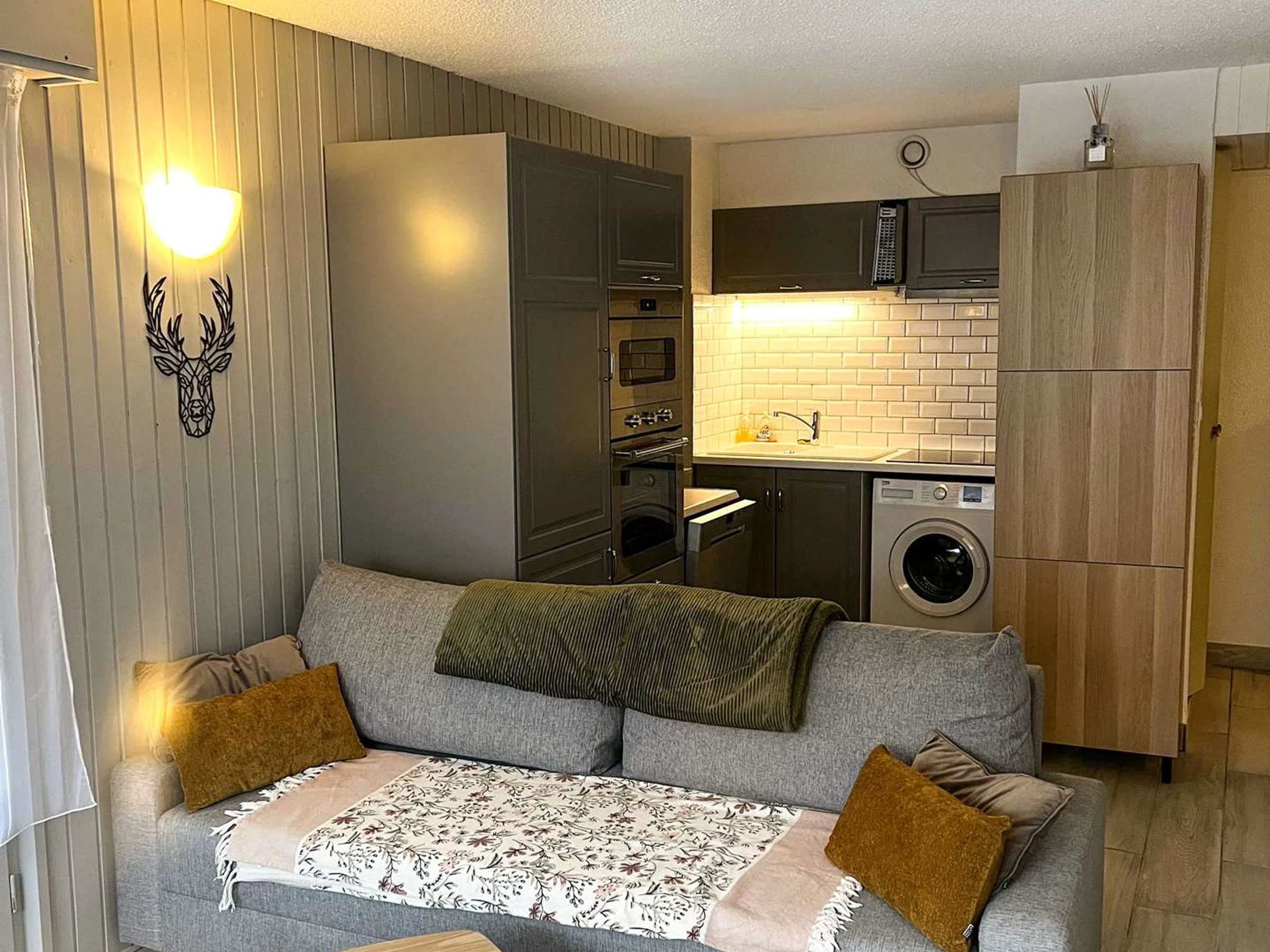 Coin cuisine : four, réfrigérateur (150l), congélateur (30l), micro-ondes, plaques vitrocéramique, lave vaisselle, lave-linge. 1 cafetière filtre,1 nespresso 1 bouilloire, 1 grille pain.