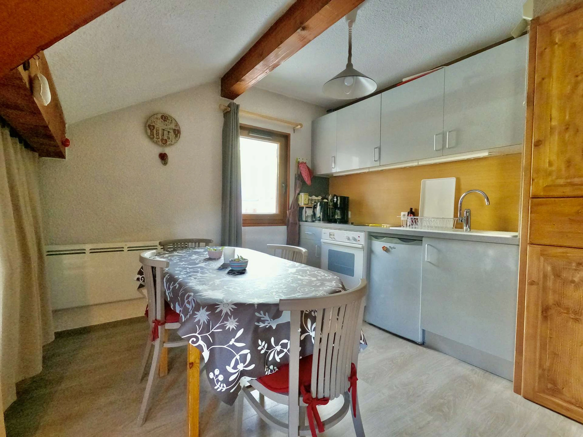 Coin cuisine équipé de plaque vitrocéramique 2 feux, d'un four, d'un micro-ondes, d'un réfrigérateur, lave-linge.1 cafetière filtre, 1 bouilloire, 1 grille pain.