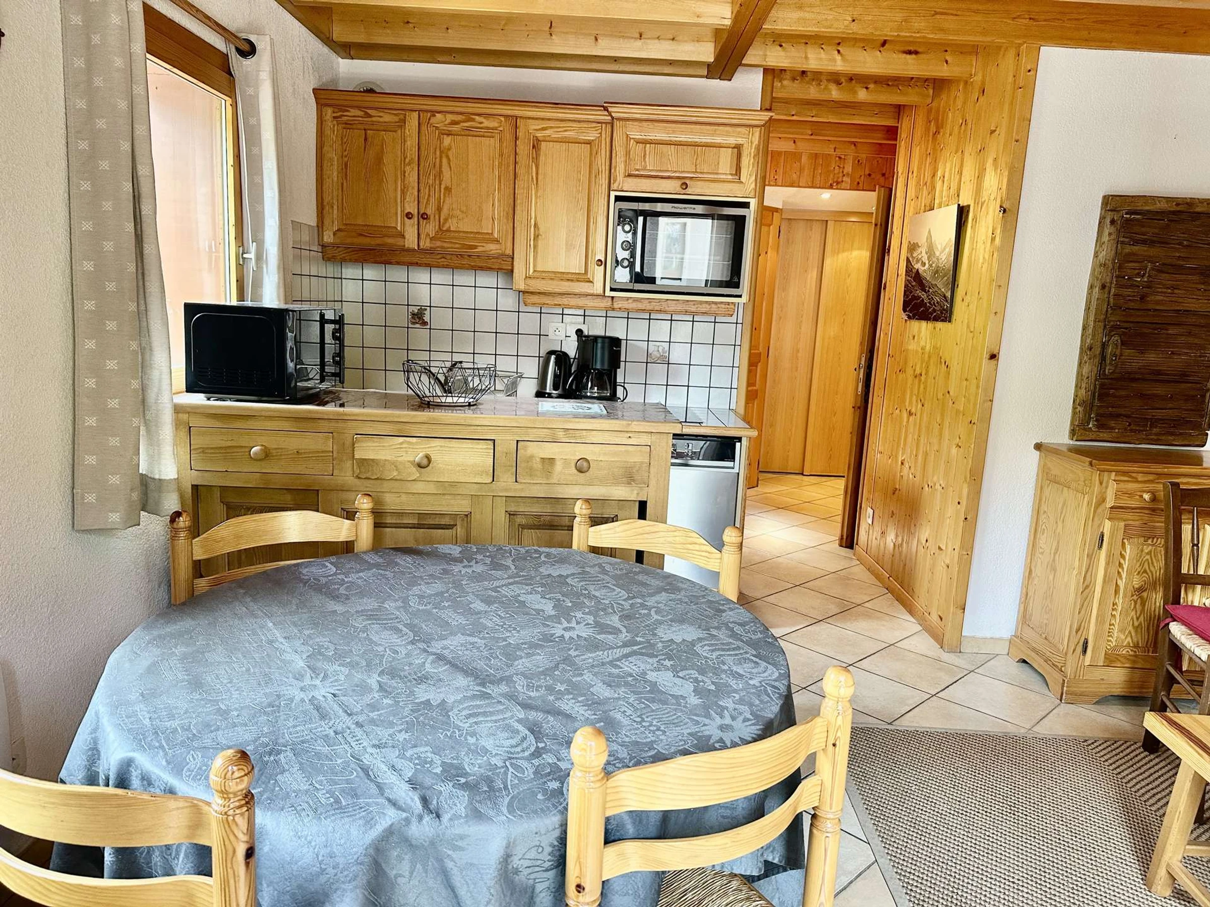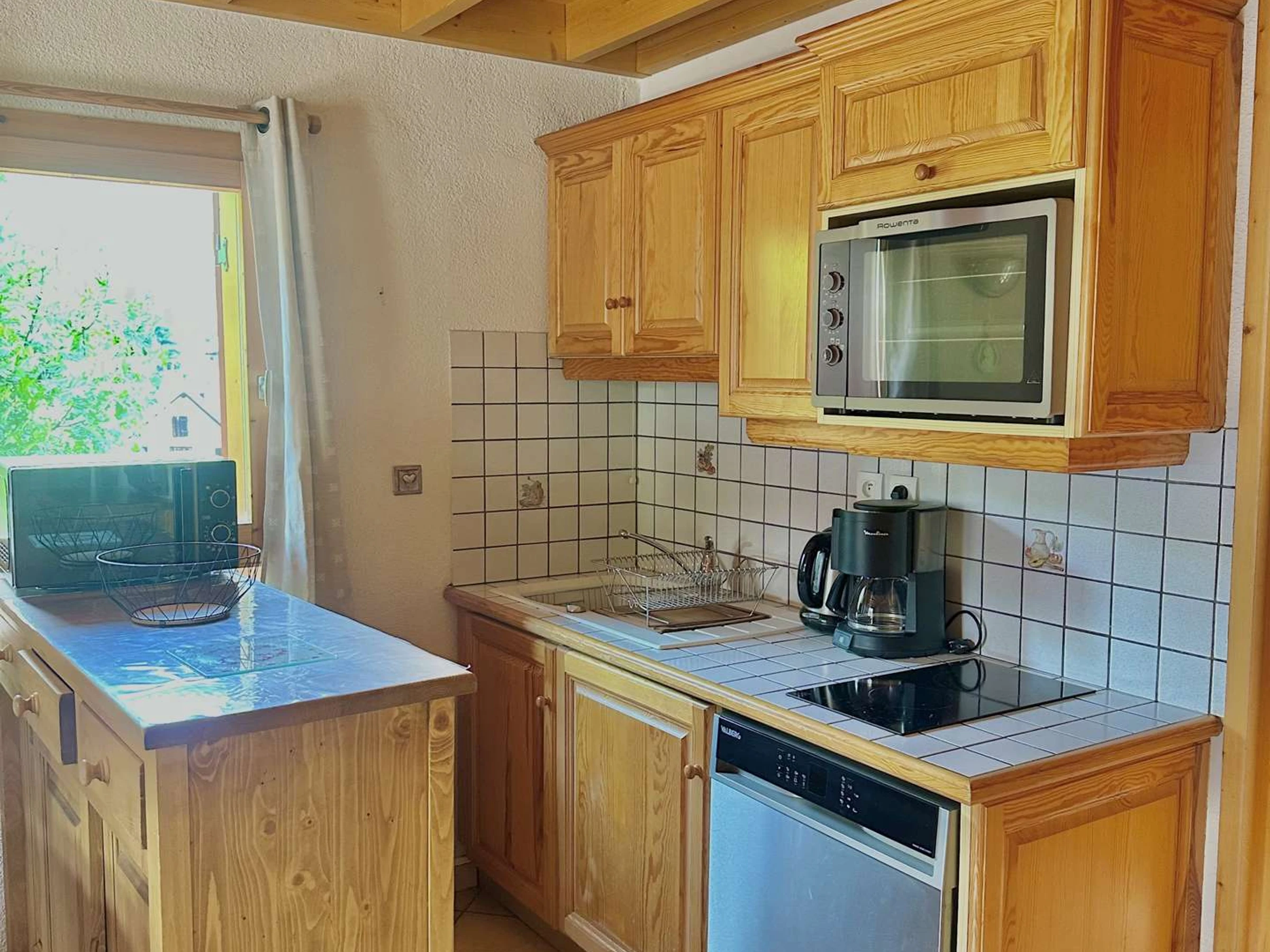 Coin cuisine : four, micro-ondes, réfrigérateur/congélateur, plaques vitrocéramique, lave-vaisselle, lave linge. 1 cafetière filtre, une bouilloire, un grille pain;