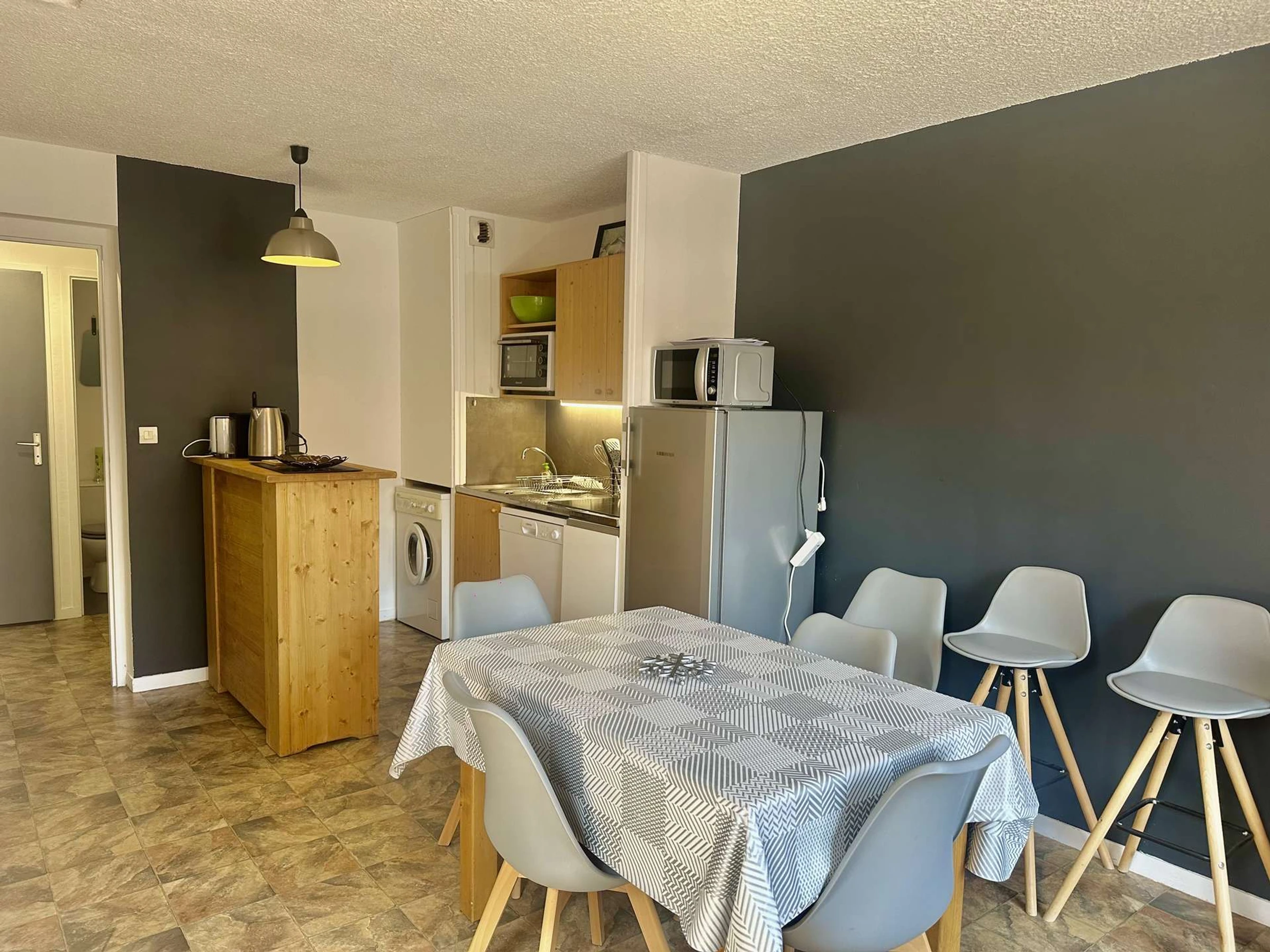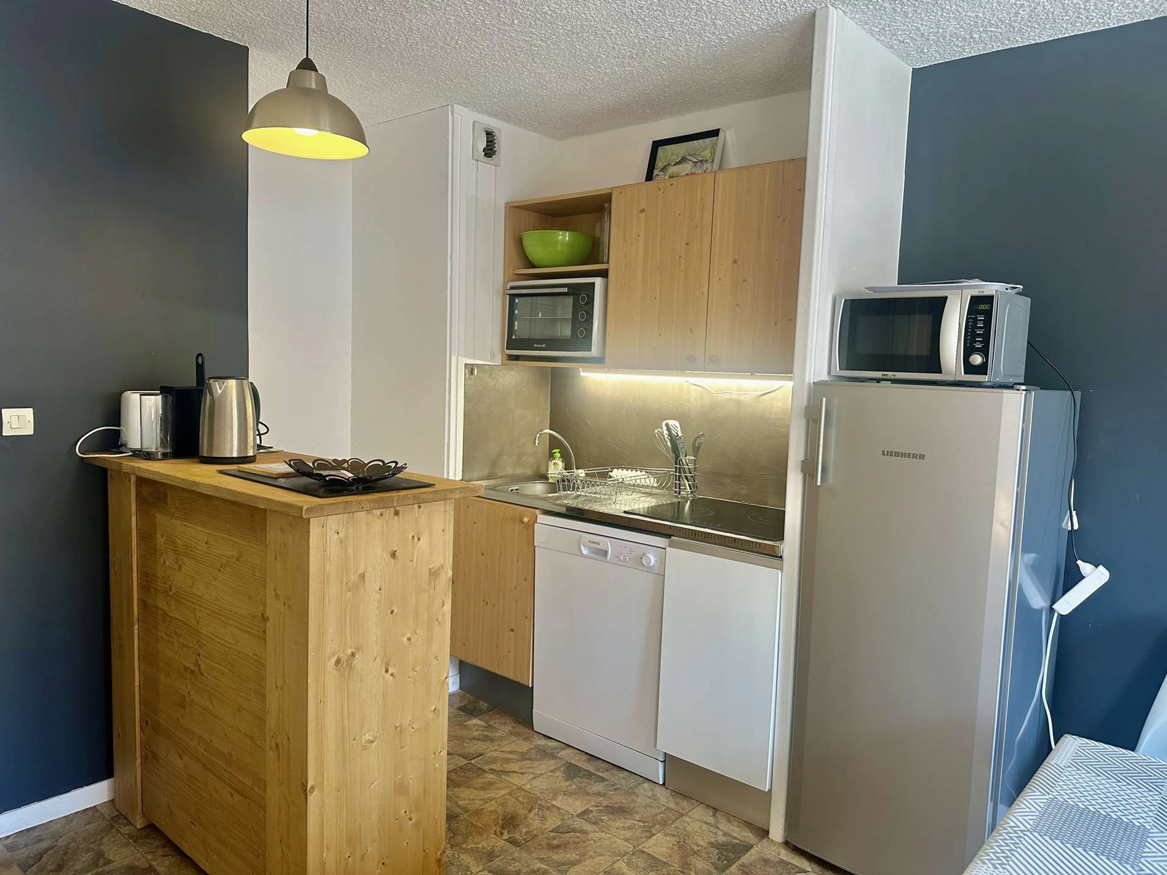 Coin cuisine: four, micro-ondes, lave vaisselle, réfrigérateur partie congélateur, plaques vitrocéramique 3 feux , lave-linge. 1 cafetière filtre, 1 Krups, 1 bouilloire, 1 grille pain