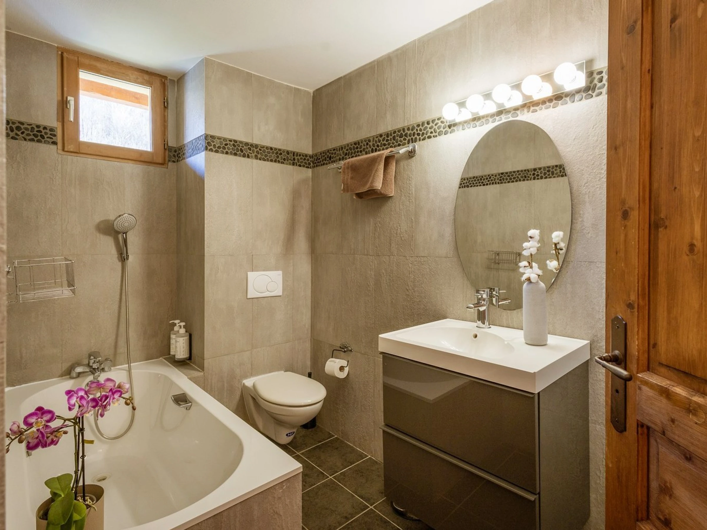 Salle de bains 1 (Niv 0) : lavabo, baignoire, sèche-cheveux et WC.