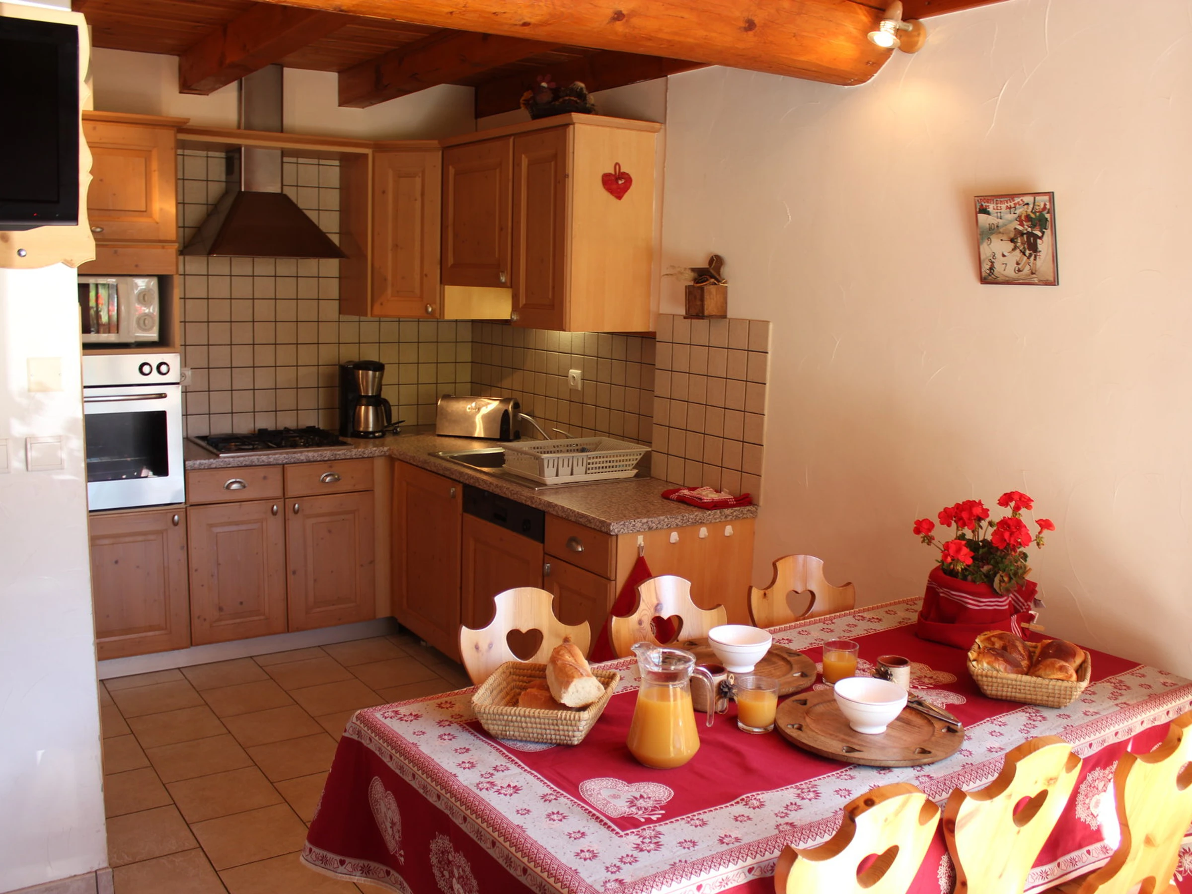 - Coin cuisine : four, micro-ondes, réfrigérateur (220L), feux gaz (3 foyers) + plaque électrique (1 foyer), lave-vaisselle et lave-linge.