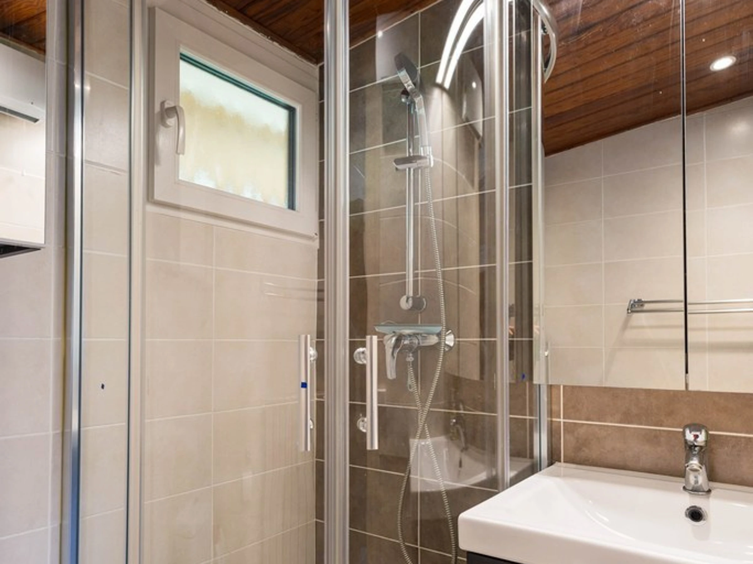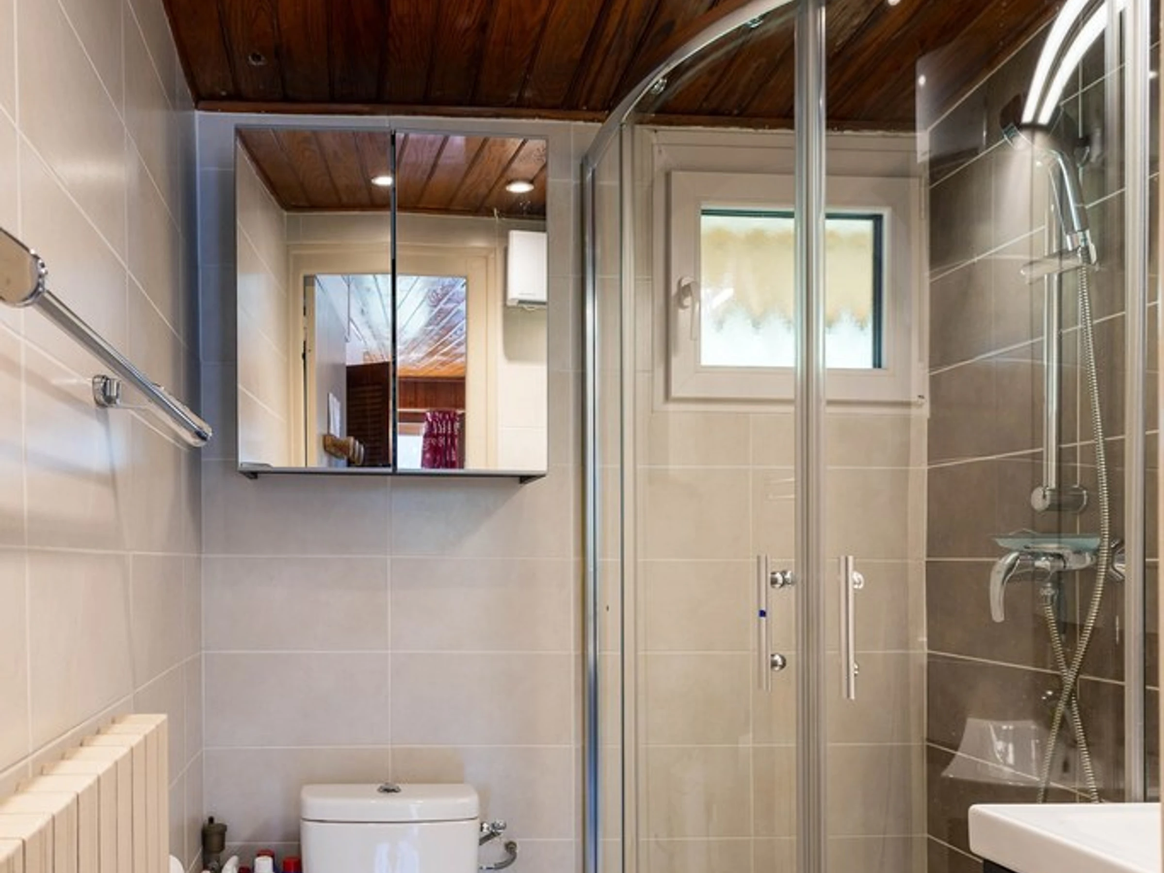 Salle de bains : douche, lavabo, sèche-cheveux et WC.