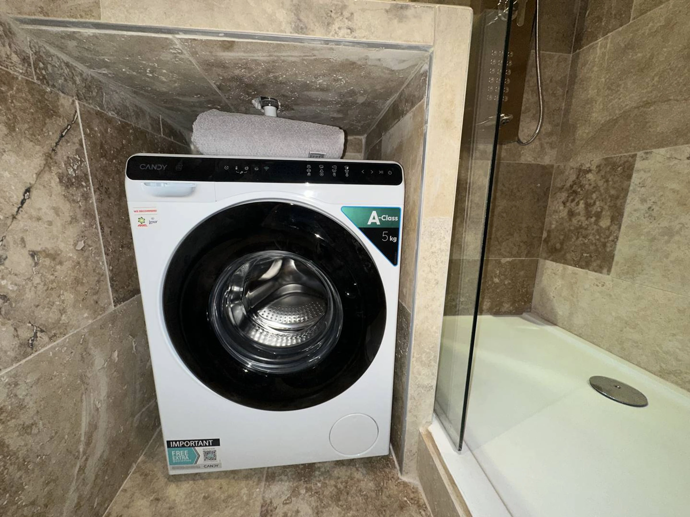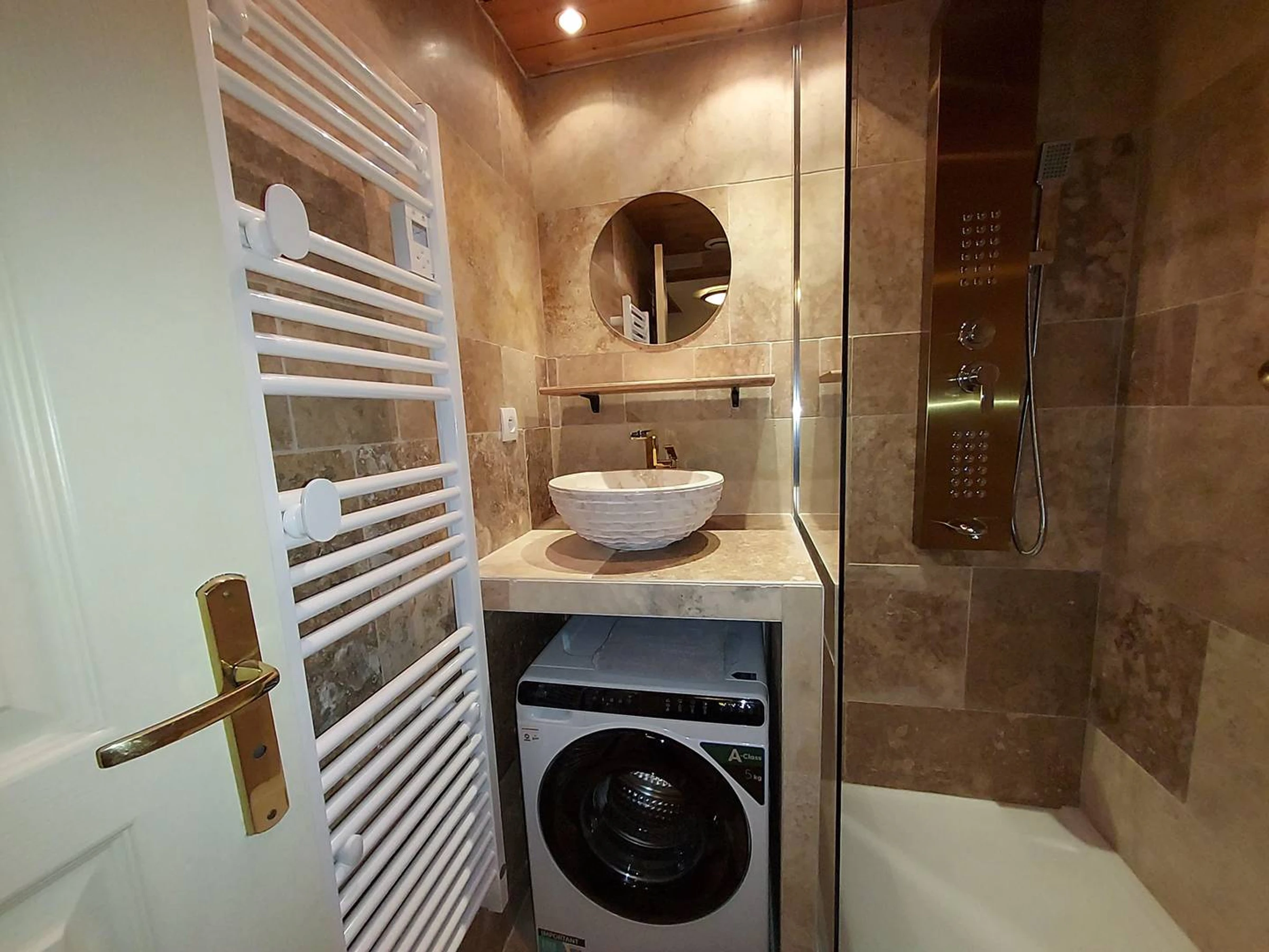 - Salle de douche avec lave-linge sèche serviette