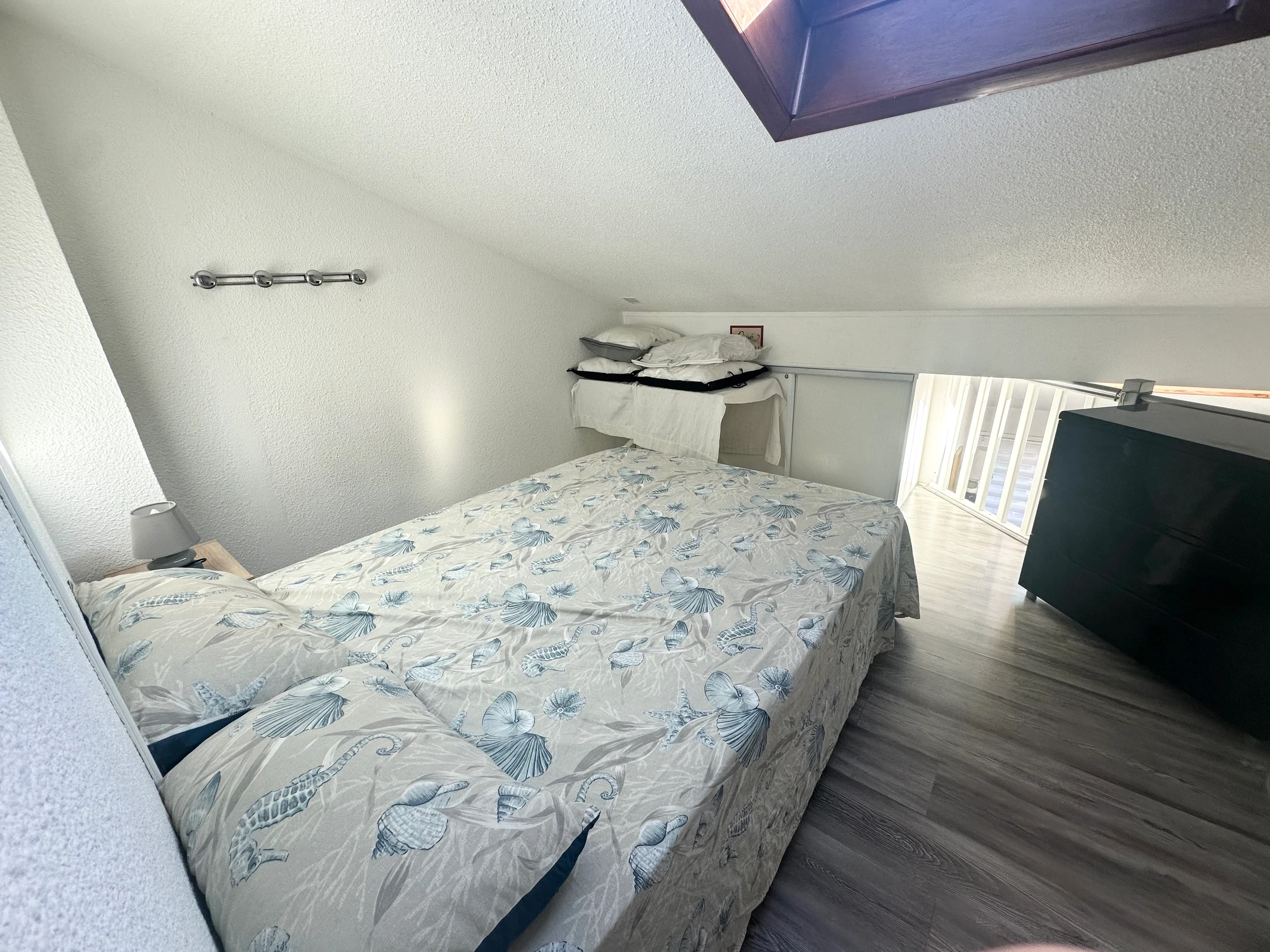 À l’étage : mezzanine aménagée avec un lit double (140 cm) et rangement