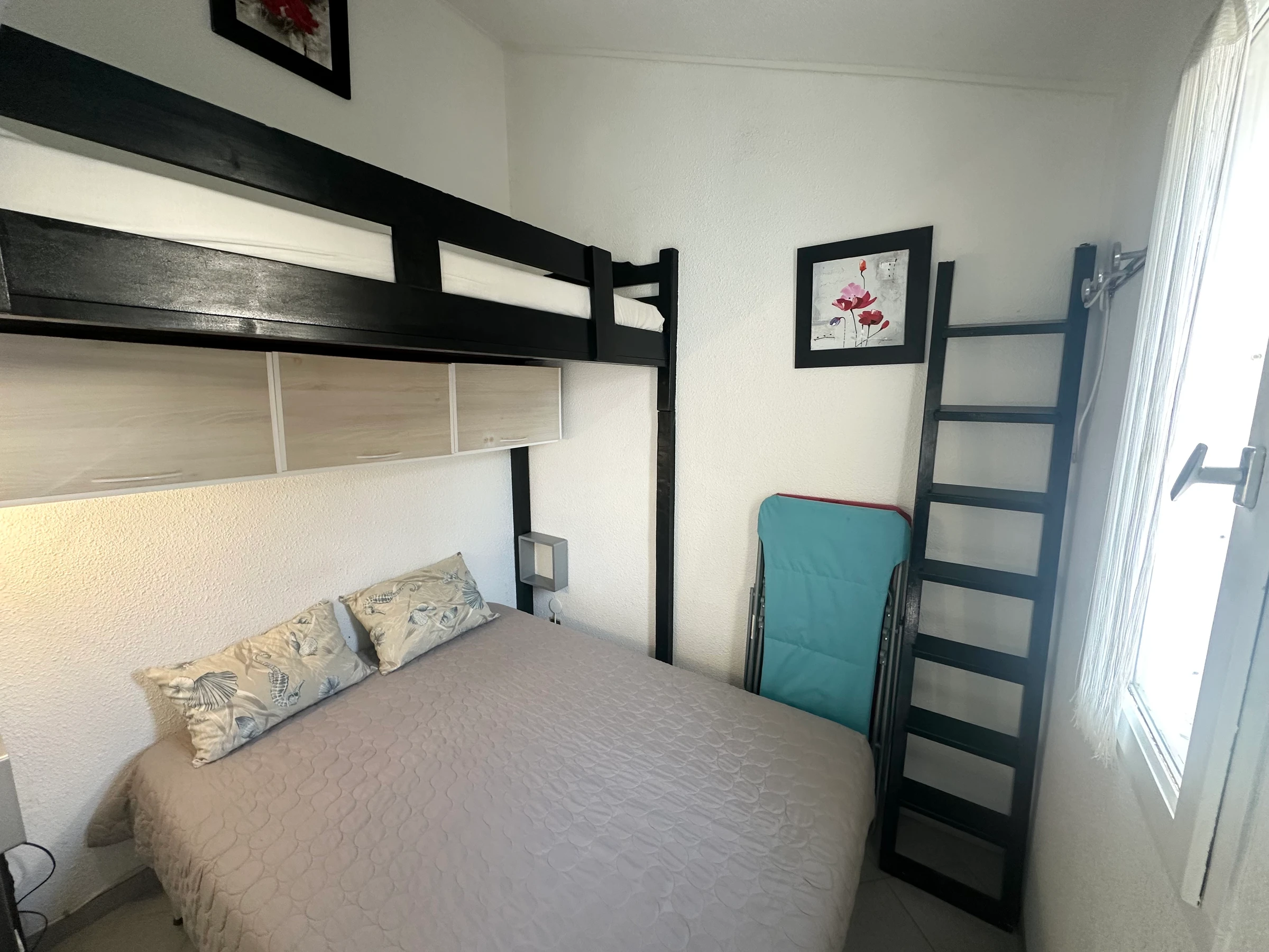 Une chambre cabine en rez-de-chaussée avec un lit double (140 cm) et un lit simple en hauteur (90 cm)