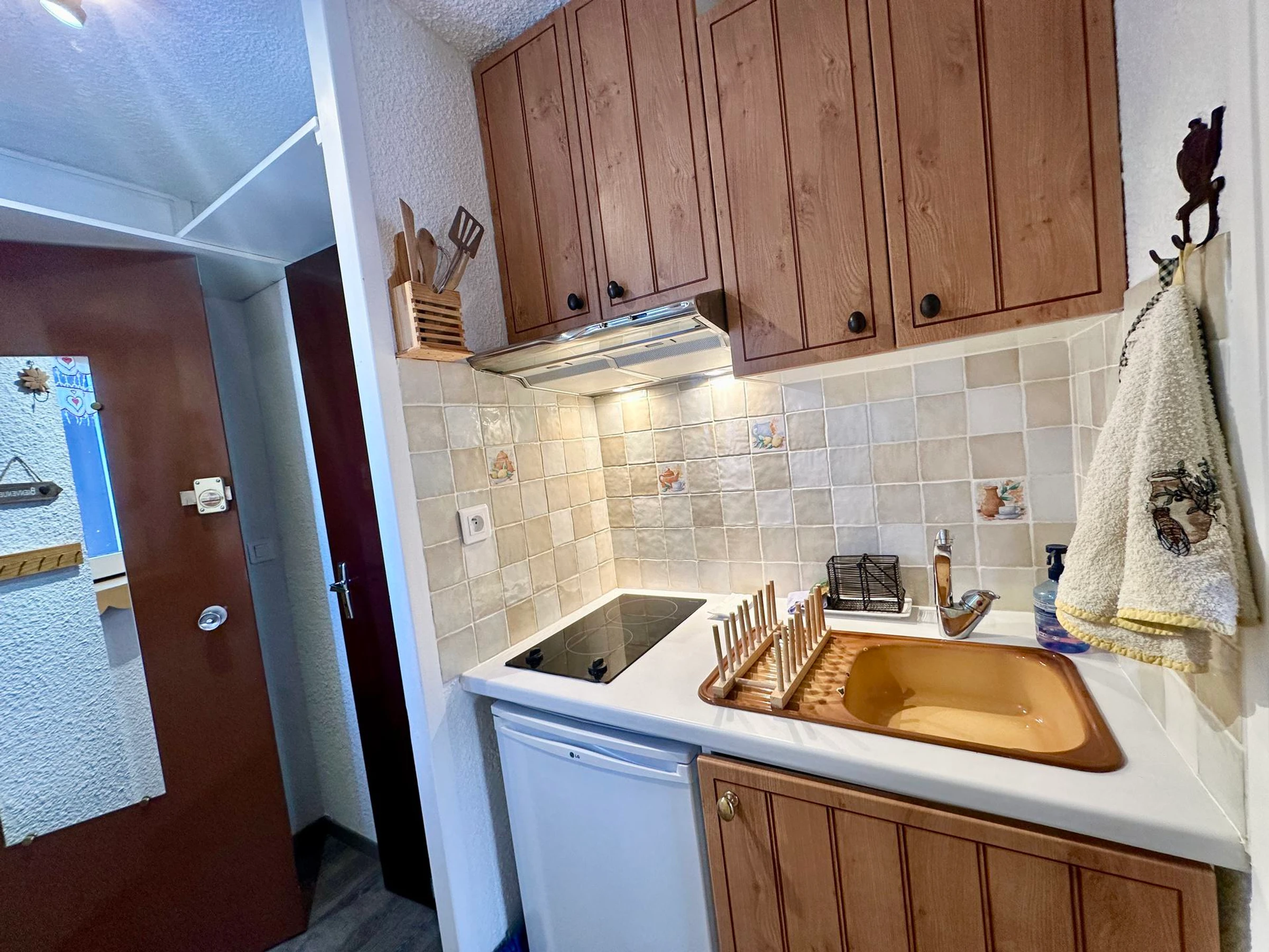 Ce studio comprend une salle d'eau avec WC et une cuisine ouverte entièrement équipée, incluant un appareil à raclette, un appareil à fondue, un réfrigérateur, un micro-ondes, une bouilloire, une machine à café Senseo, un mixeur, et une plaque en céramique.