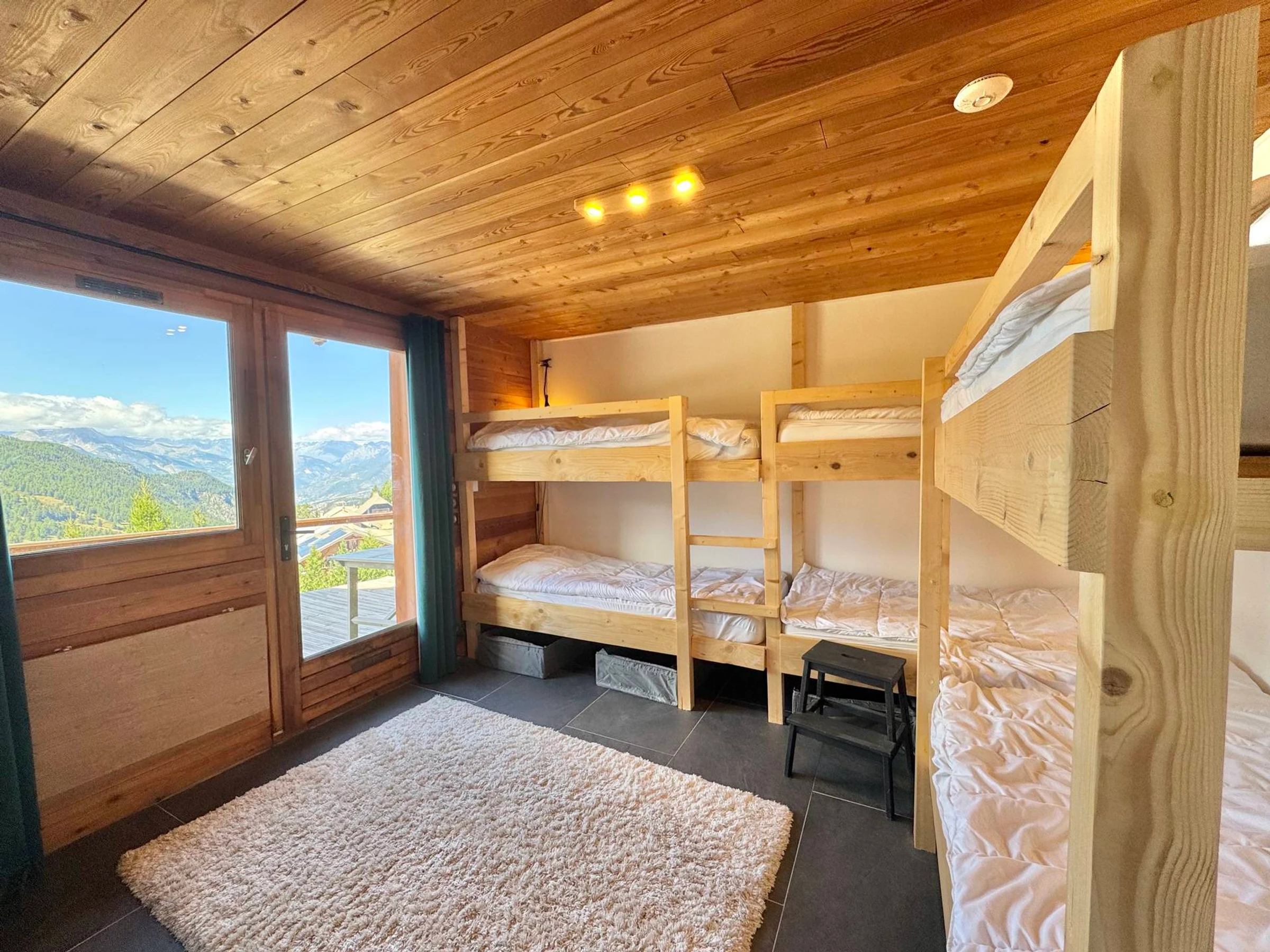 Côté nuit, l’appartement propose une chambre double (lit 160x200) avec verrière et placard, une chambre familiale comprenant six lits simples superposés (90x200) et un bureau, ainsi qu’une salle de bain avec WC, sèche-cheveux et fer à lisser. Enfin, une troisième chambre accueille un lit double (160x200) et deux lits simples superposés (90x200), complétée par sa propre salle d’eau avec WC attenant.