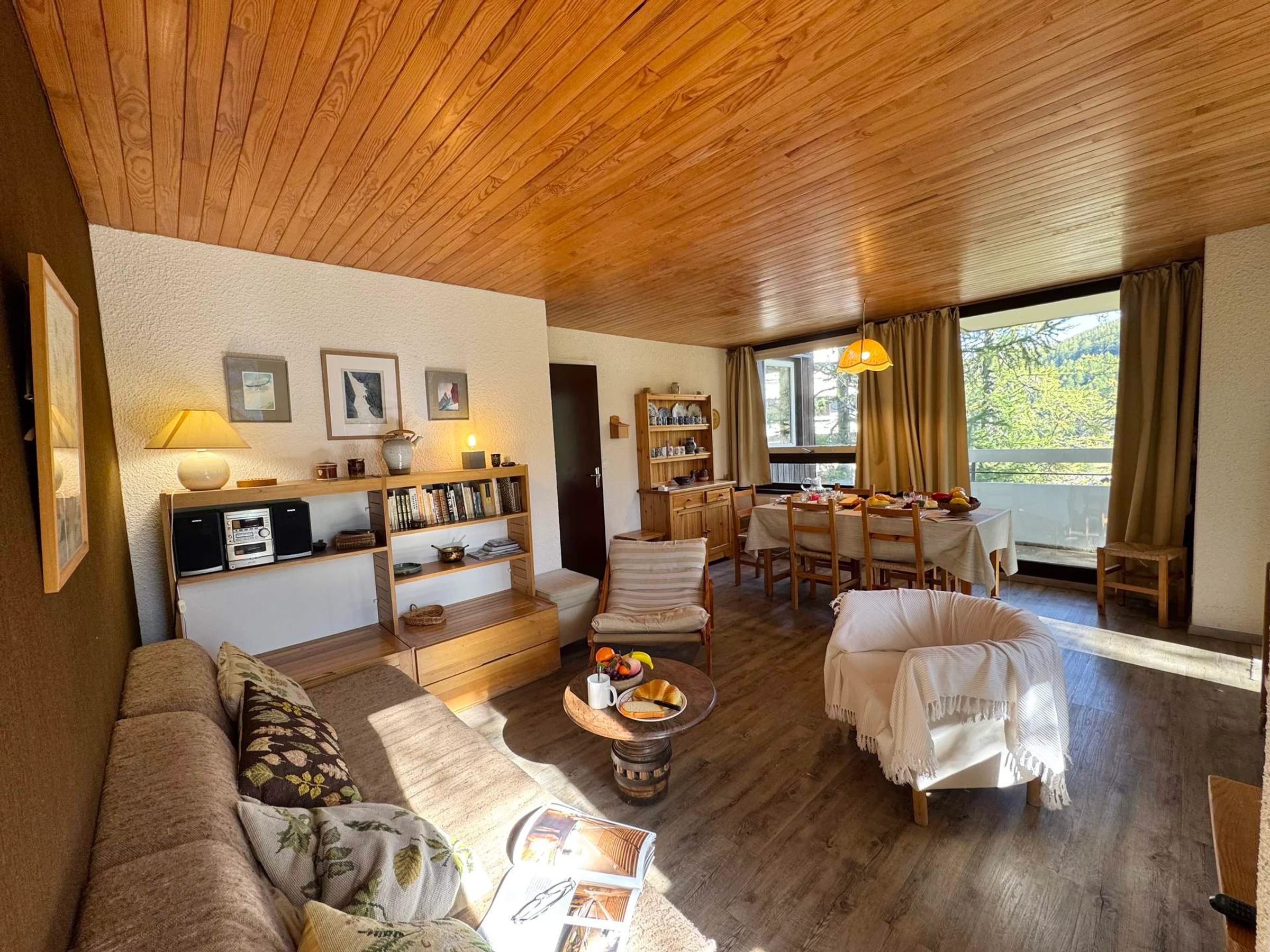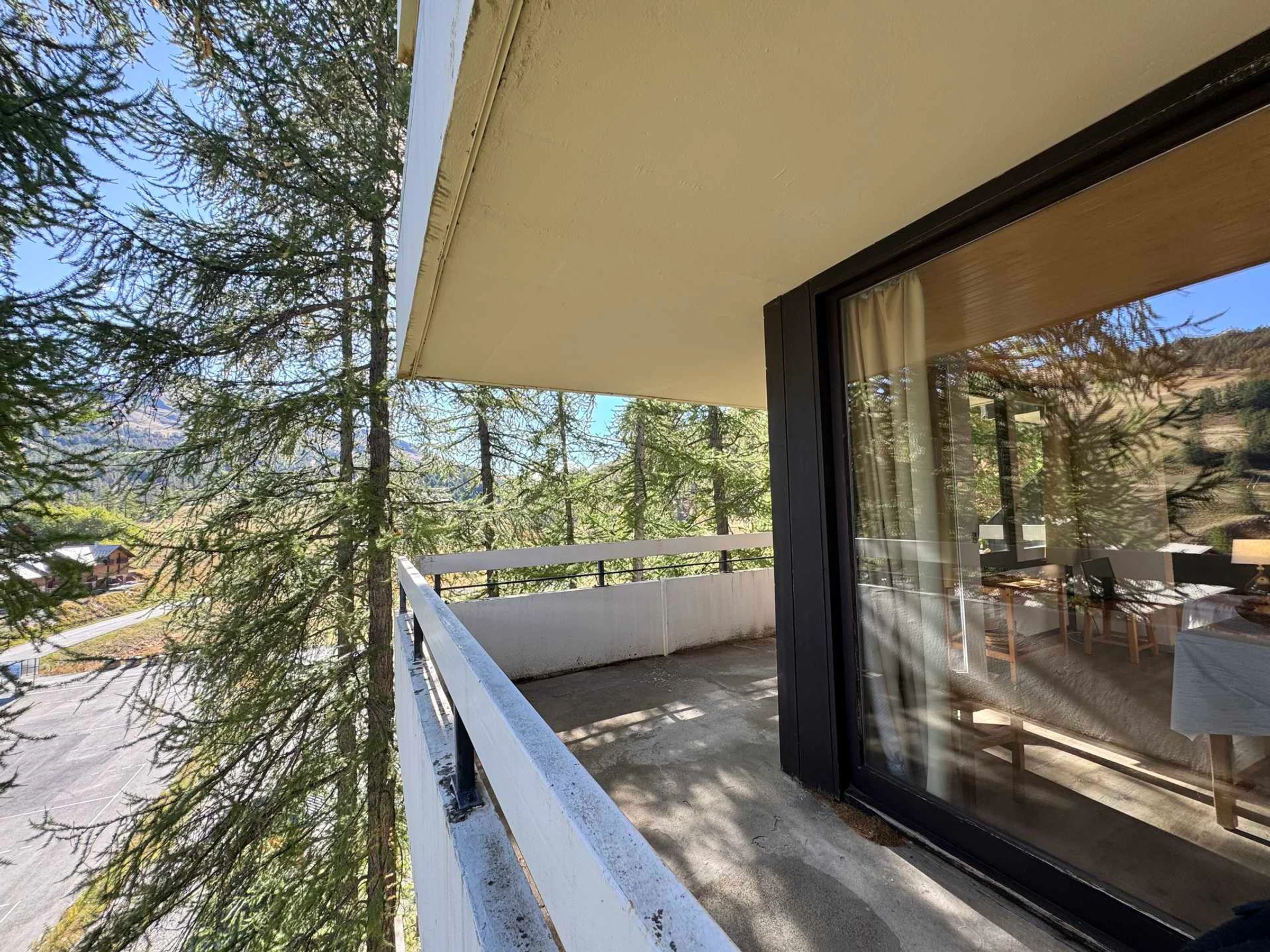 Le vaste salon, baigné de lumière grâce à ses grandes baies vitrées, s’ouvre sur un balcon spacieux donnant l’impression unique d’être suspendu dans les arbres, au cœur des mélèzes. Ce bien allie ainsi confort, charme et emplacement privilégié pour des vacances inoubliables au cœur de Vars.