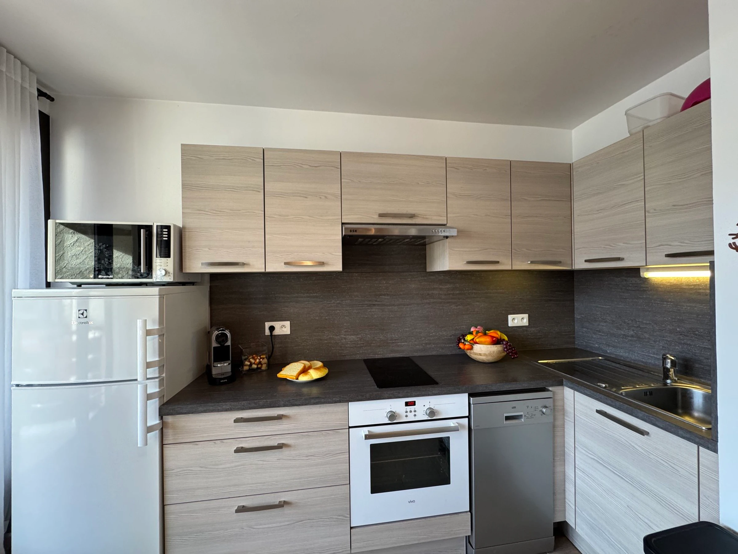 La cuisine, entièrement équipée, comprend un réfrigérateur, un four traditionnel, un lave-vaisselle, un micro-ondes, une machine à café Nespresso ainsi qu’une machine à raclette.