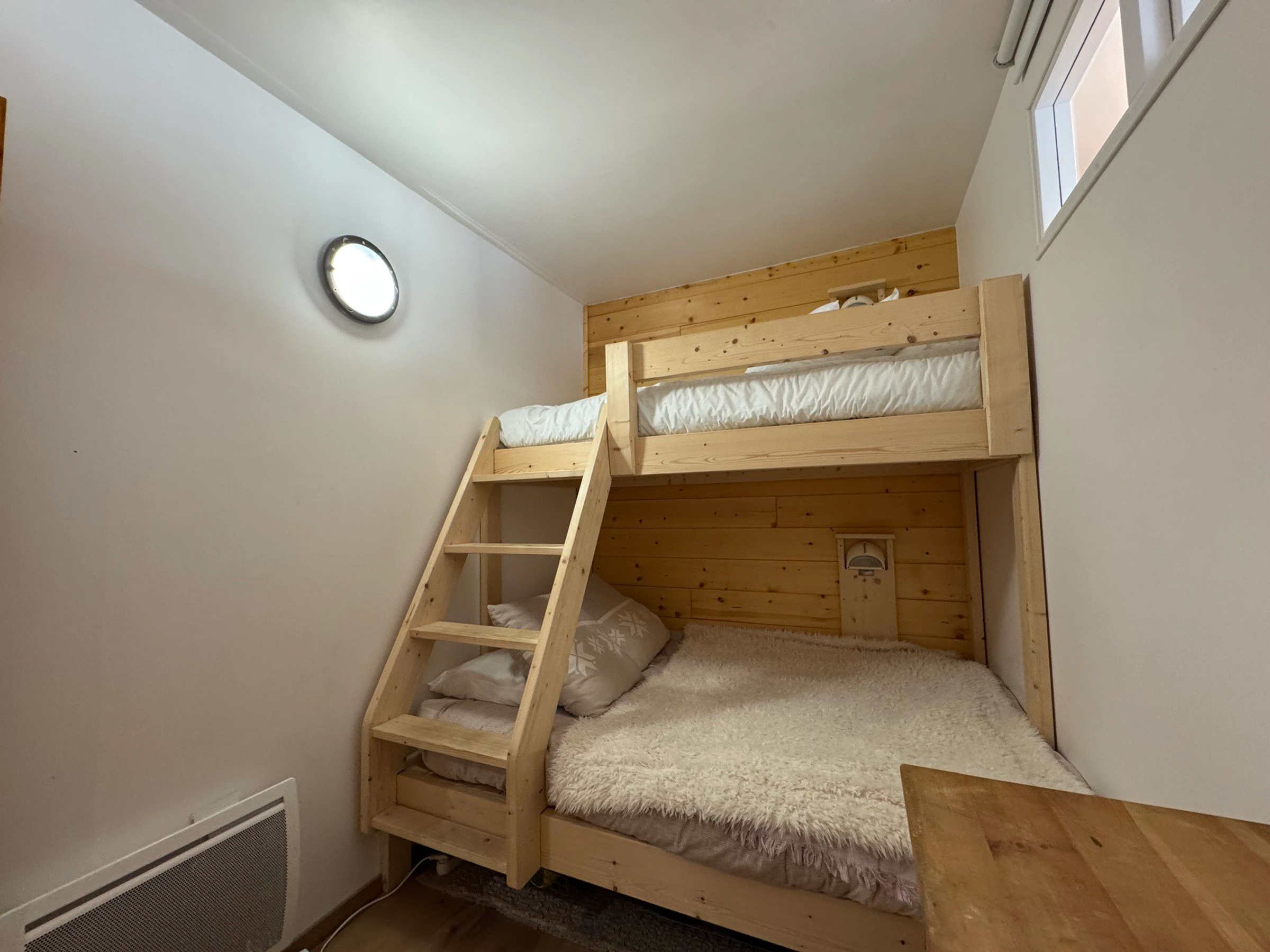 Le logement se compose d’une chambre équipée d’un lit double en 160x200, d’une cabine comprenant un lit double en 140x190 et un lit simple en 90x190 en hauteur (superposé). Cette cabine bénéficie d’un bain de lumière grâce à une petite fenêtre en hauteur donnant sur le salon. Le séjour est équipé d’un canapé convertible offrant un couchage double supplémentaire, portant la capacité totale du logement à six personnes.