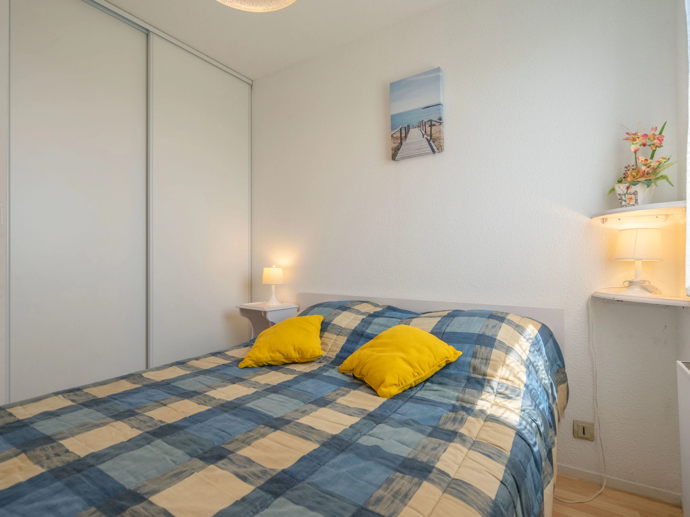 Apt 2 pièces 26 m2 au 2ème étage. Séjour/salle à manger avec 1 divan-lit double (1 x 140 cm, longueur 190 cm), TV. 1 chambre avec 1 grand-lit (1 x 140 cm, longueur 190 cm). Coin cuisine (2 plaques de cuisson, lave-vaisselle, combiné micro-ondes). Douche/WC. Chauffage électrique. Balcon 6 m2. Meubles de terrasse. Vue éloignée sur la mer. A disposition: Internet (Connexion WIFI, en sus). Veuillez noter: détecteur de fumée.