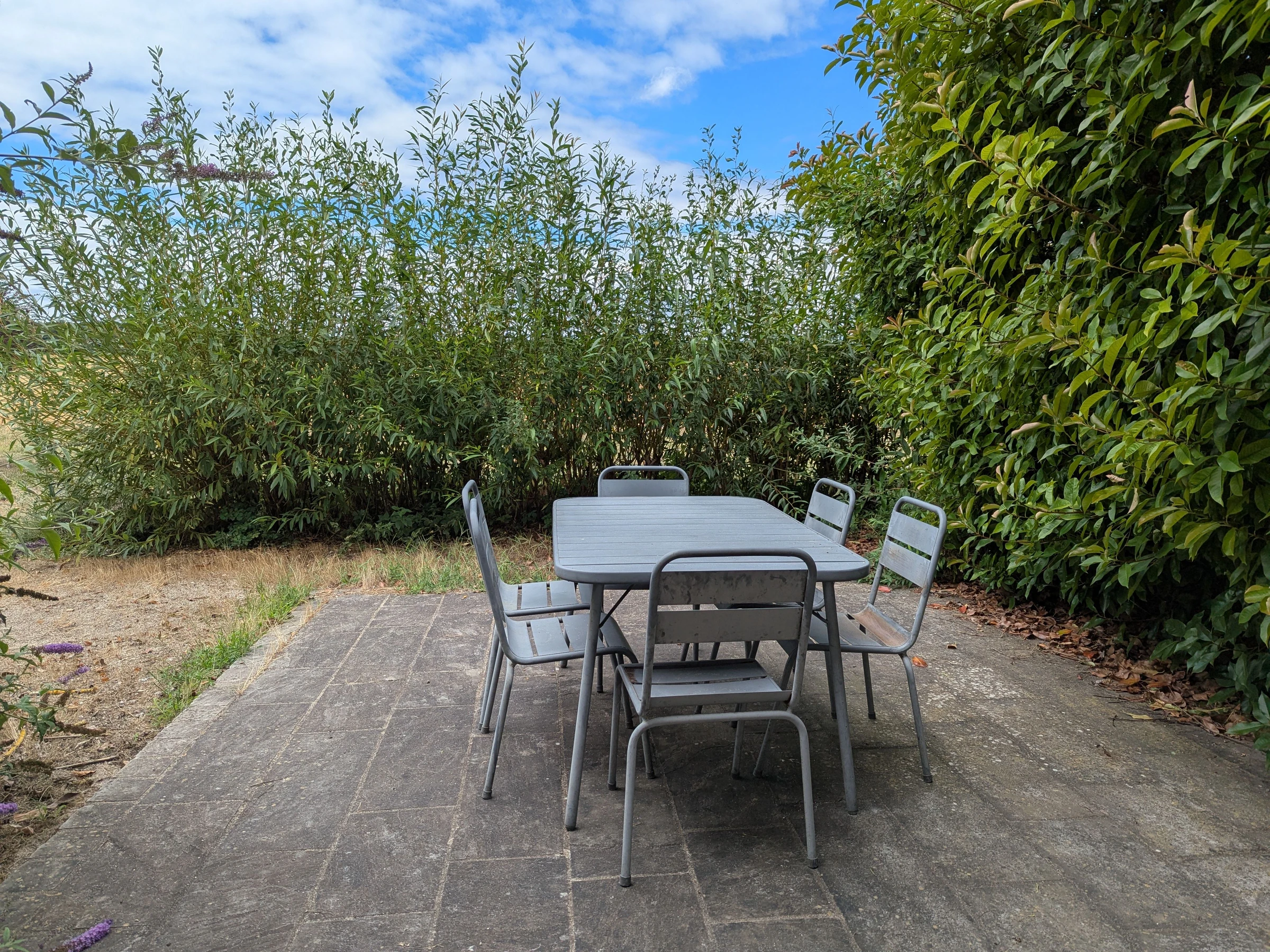 Extérieur : Terrasse privative avec salon de jardin, barbecue.