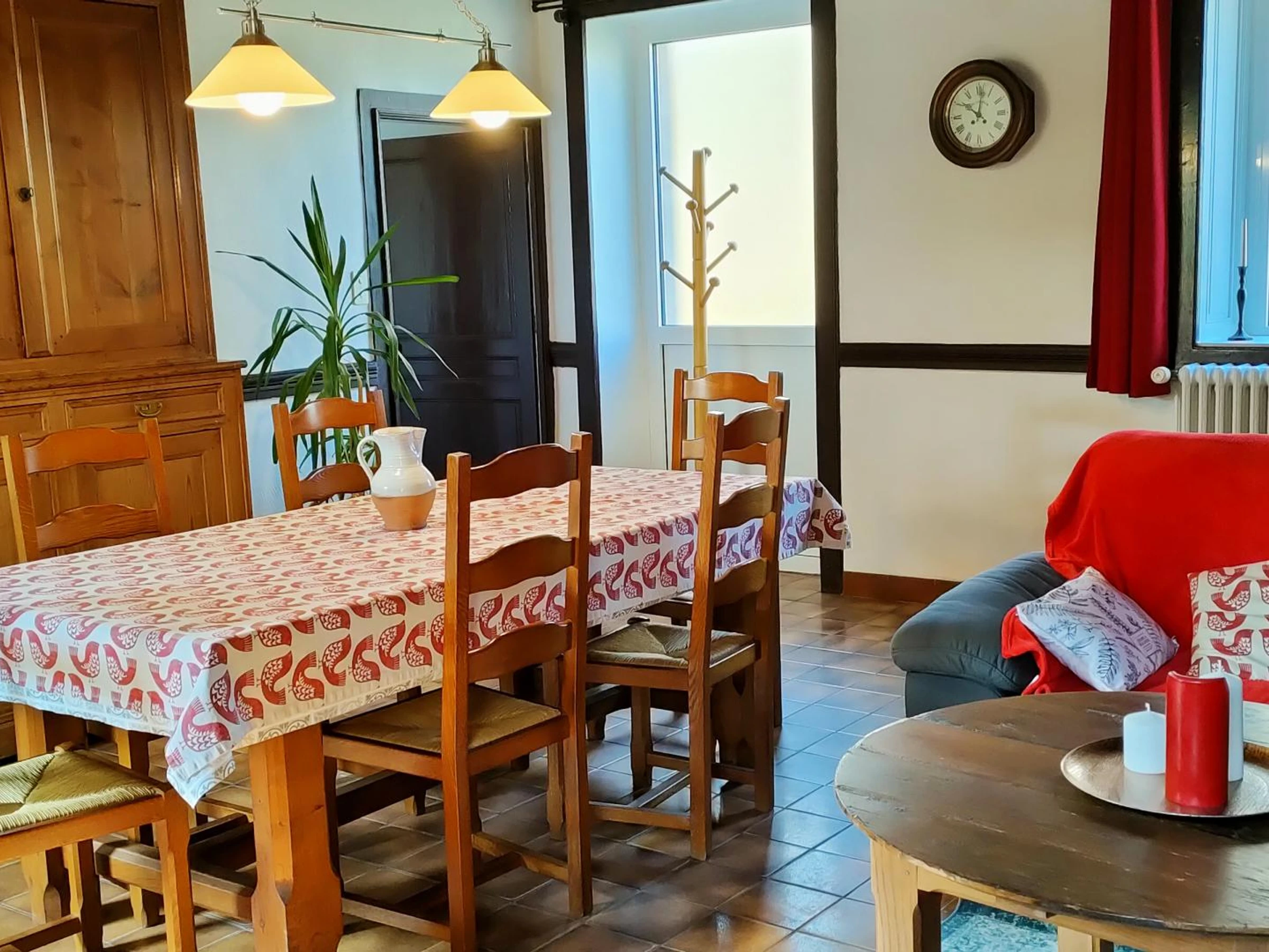 Maison mitoyenne à celle du propriétaire. RDC : Séjour avec poêle à bois (payant). WIFI. TV. Poste radio/CD. Cuisine aménagée et équipée (micro ondes, lave-vaisselle, four, case congélateur). Petite salle d'eau (douche). WC. Étage : Chambre 1 (1 lit 160). Chambre 2 (1 lit 140). Chambre 3 (2 lits 90). Lave-linge. Draps et linge de maison en location. Chauffage par pompe à chaleur inclus . Ménage en option sur demande . Bois en supplément. Terrain clos privé. Salon de jardin. Barbecue. Garage. Prise domestique pour recharge de voiture électrique à disposition et en supp. Cette maison située dans une région calme et reposante a su conserver son âme et son caractère. Une cheminée complète l'aménagement rustique du grand séjour. La propriétaire est agricultrice à la retraite.