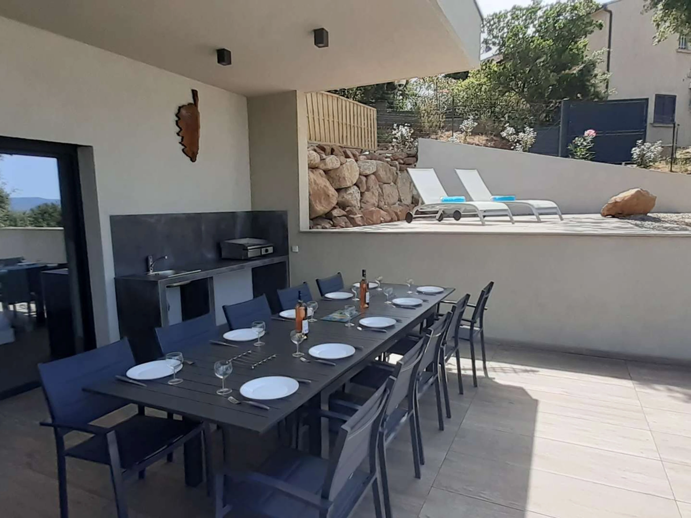 À l'extérieur, vous pourrez profiter d'une piscine privée, ainsi que de transats pour vous détendre. La terrasse extérieure, partiellement couverte, est équipée d'une cuisine d'été et d'une plancha, idéale pour partager des repas conviviaux. Elle donne directement sur la piscine, parfaite pour passer des moments agréables tout en profitant du soleil corse.