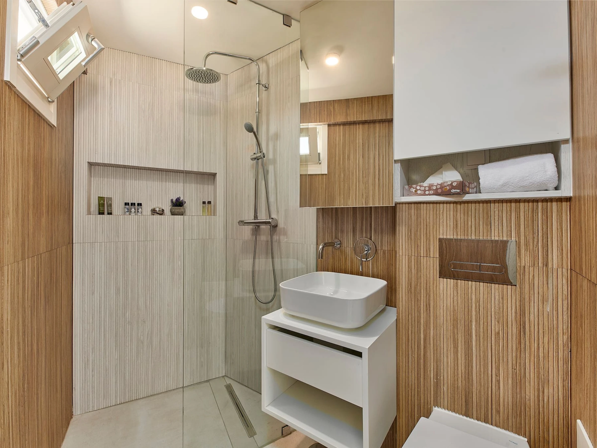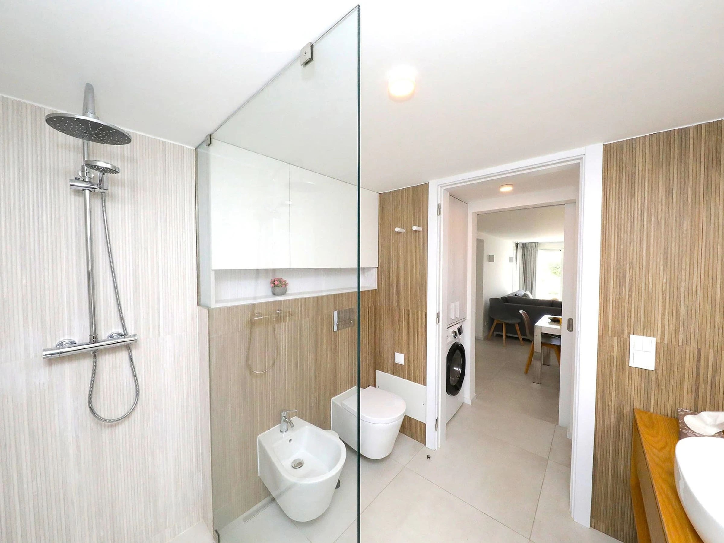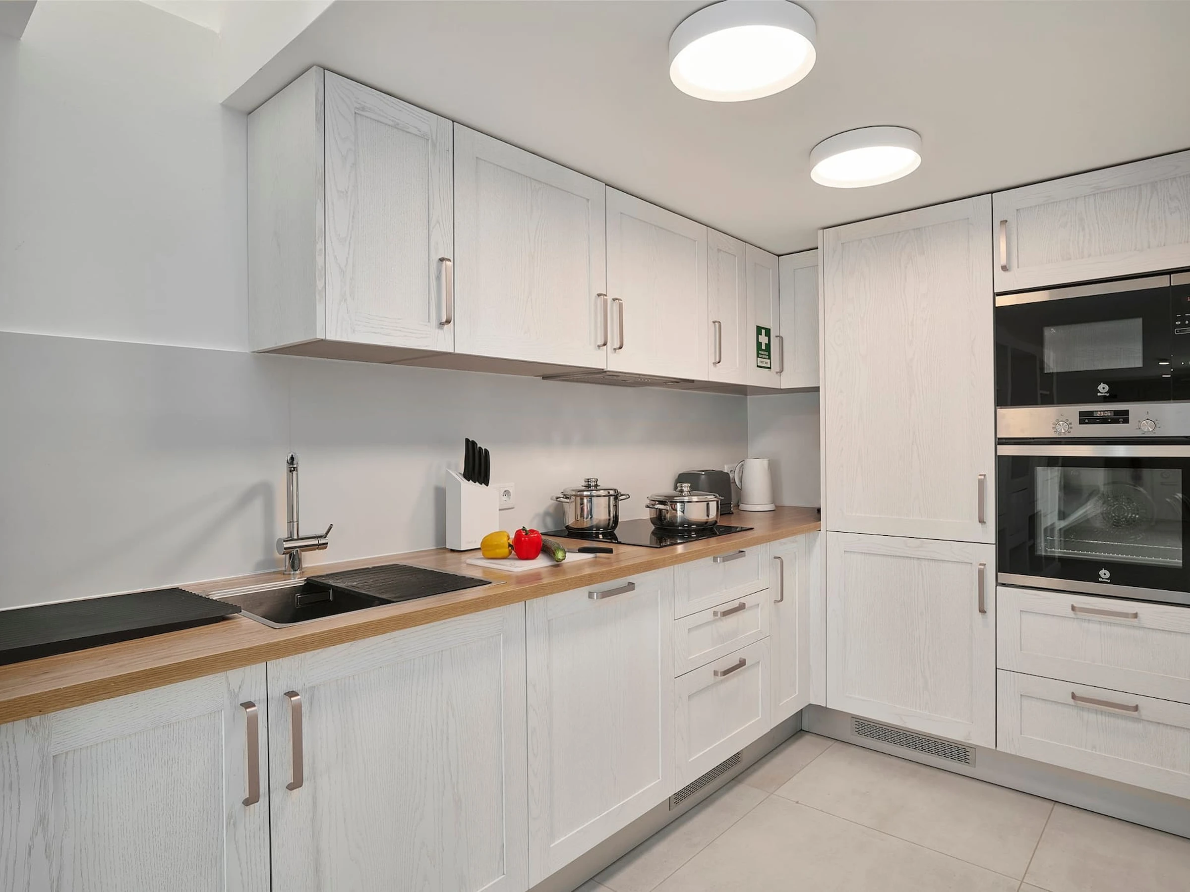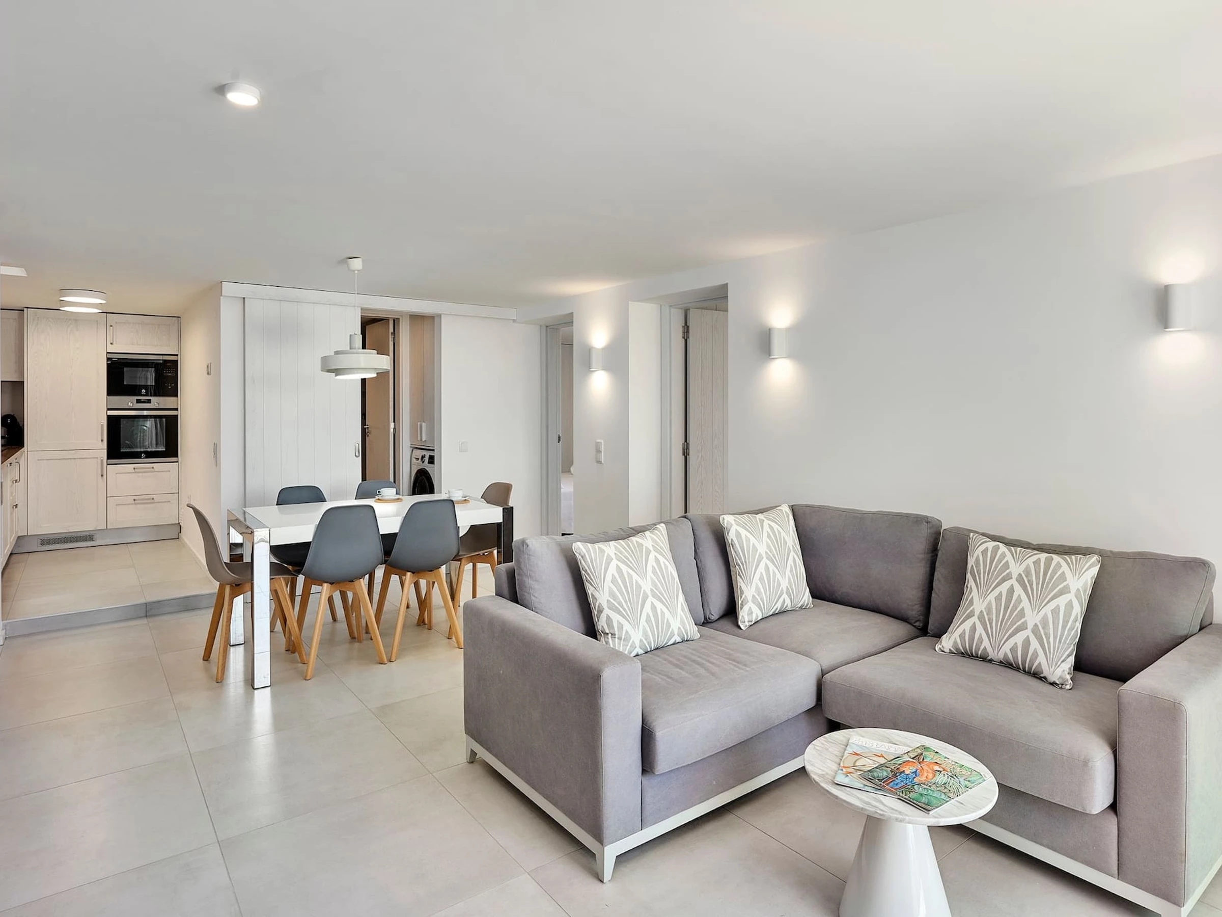 Pénétrez dans un espace ouvert confortablement meublé qui vous accueille à bras ouverts. La cuisine de style galley, entièrement équipée d'ustensiles et d'équipements, vous invite à préparer de délicieux repas à la maison. Découvrez la commodité d'un lave-linge, lave-vaisselle, plaque à induction et four, répondant à tous vos besoins. Rassemblez-vous autour de la table à manger élégante, pouvant accueillir jusqu'à six invités, et savourez des repas mémorables ensemble. Enfoncez-vous dans les canapés moelleux et accueillants, profitant du confort qu'ils offrent, tout en profitant du divertissement sur le téléviseur intelligent fixé au mur avec accès internet. À l'arrière de l'appartement, une salle de bain moderne vous attend, avec une douche spacieuse et des doubles lavabos.