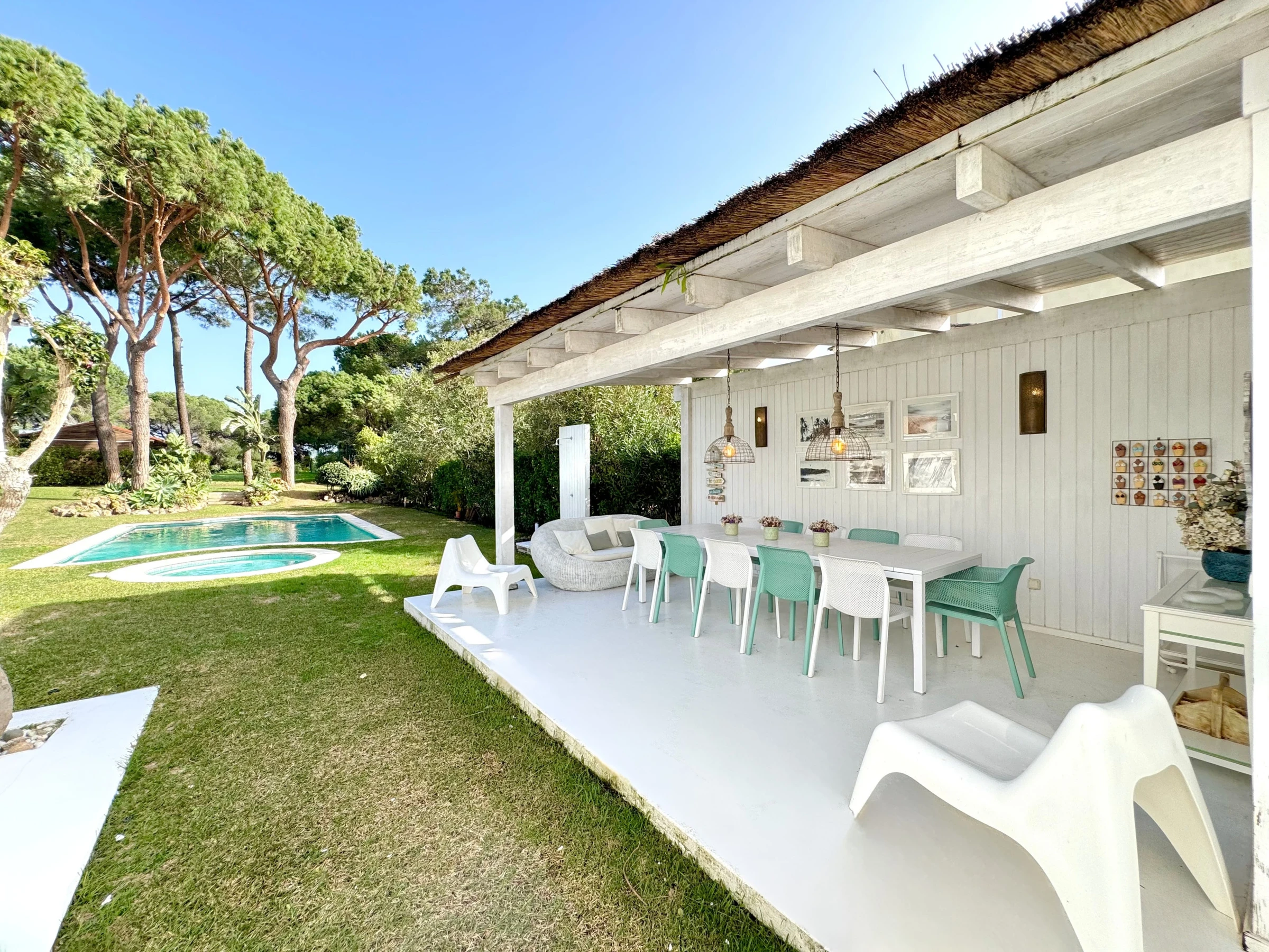 À l'extérieur, vous trouverez une piscine privée, entourée d'un jardin soigné et verdoyant, idéal pour se détendre au soleil, profiter de repas en plein air ou simplement apprécier la tranquillité des lieux. Le jardin offre de la confidentialité et un environnement parfait pour les adultes et les enfants.