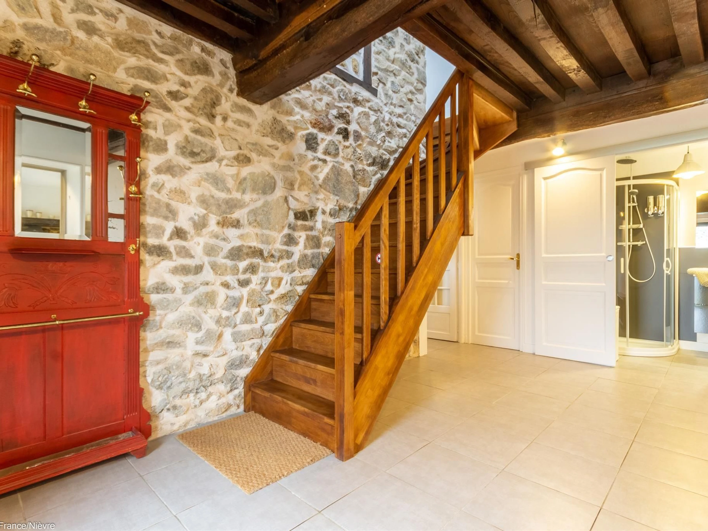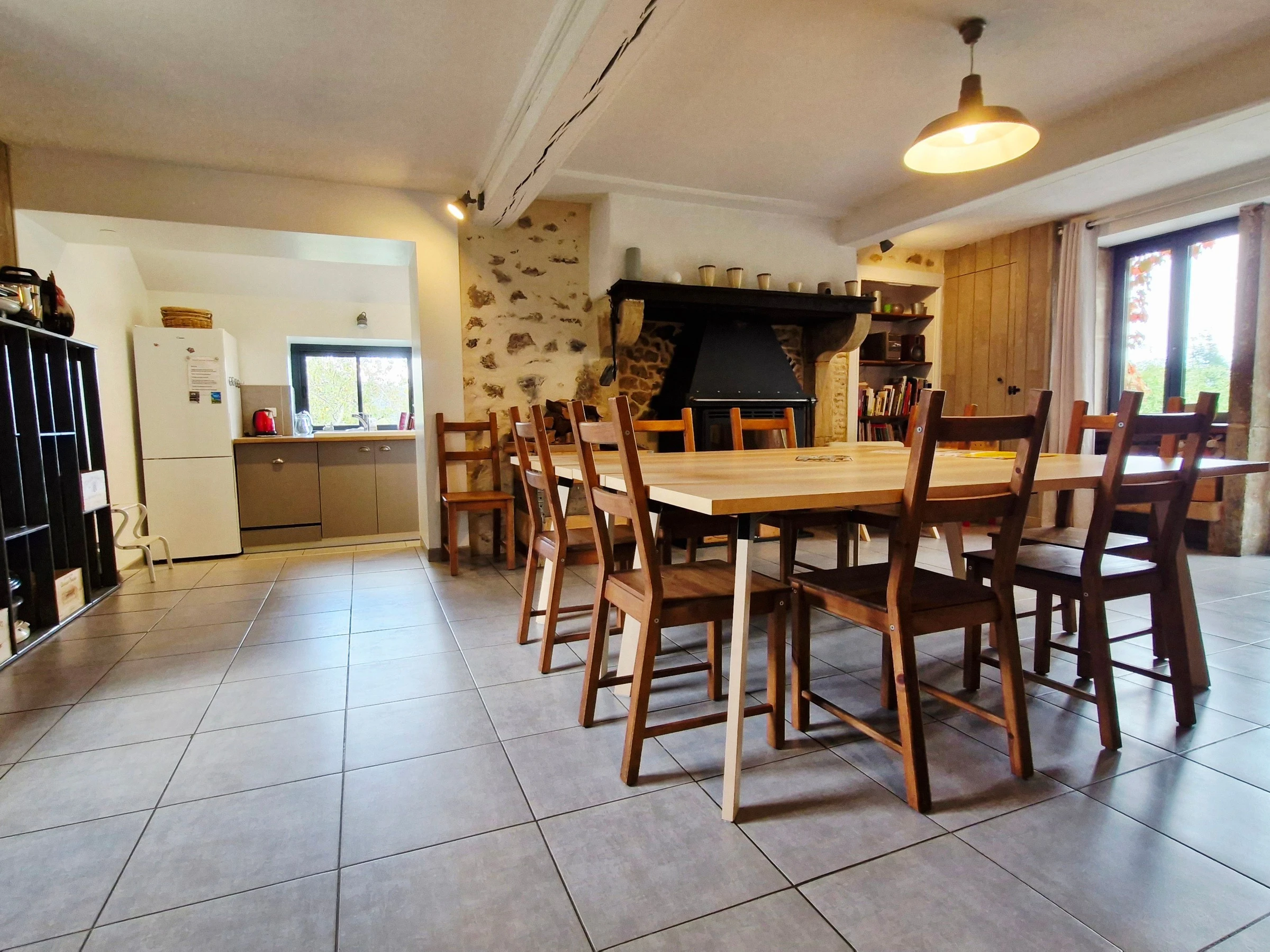 Au rez-de-chaussée :cuisine équipée, grande salle à manger avec poêle à bois, un salon cosy avec poêle à bois et télé, une salle d'eau (douche), wc séparé.