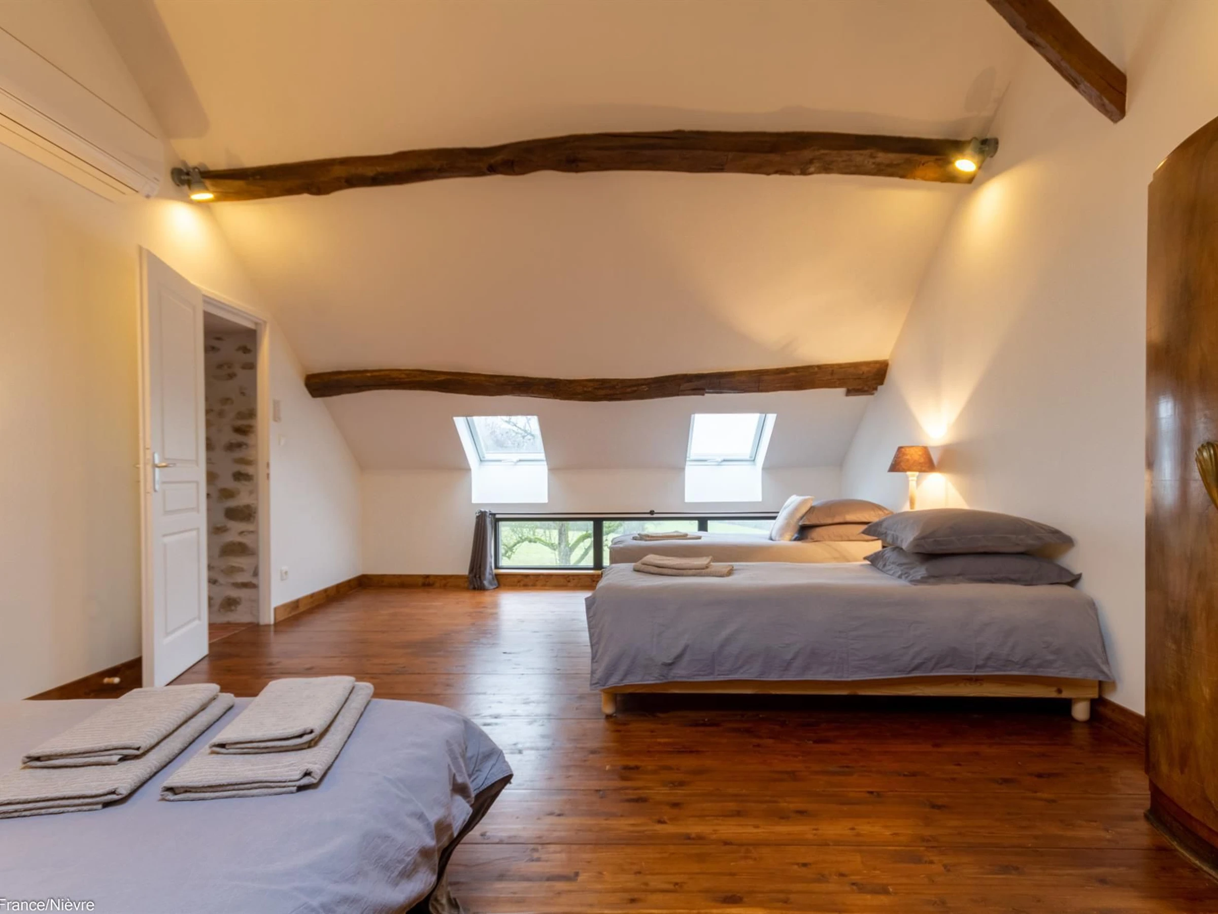 Au 1er étage : 2 chambres avec chacune 1 lit 140x190; 1 chambre avec 1 lit 140x190 + 2 lits 90x190; une salle d'eau (douche) et wc séparé.