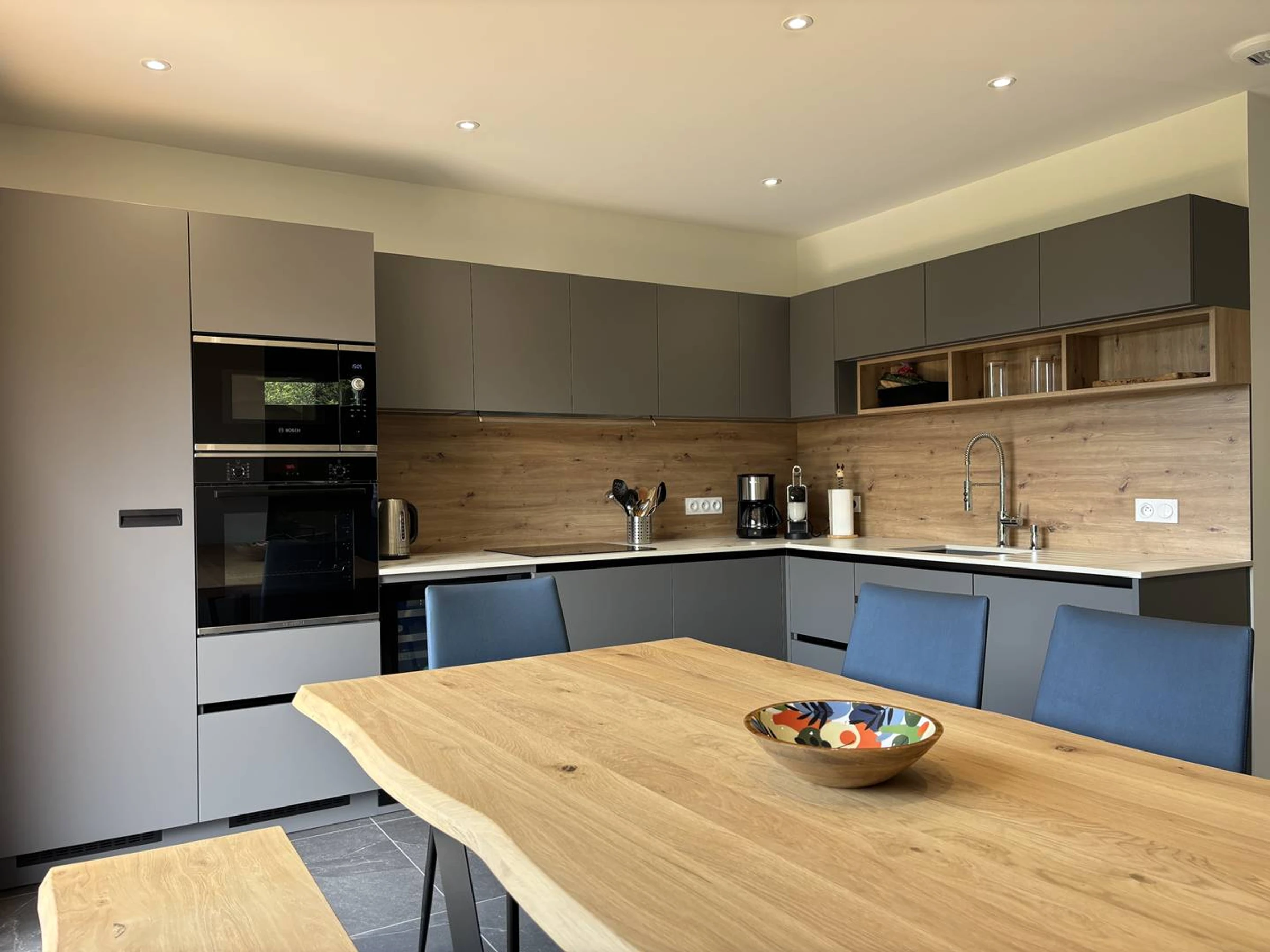 - Belle pièce de vie avec cuisine aménagée ouverte sur le séjour doté d'un poêle à granulés. La pièce ayant accès à la terrasse exposée Sud Ouest