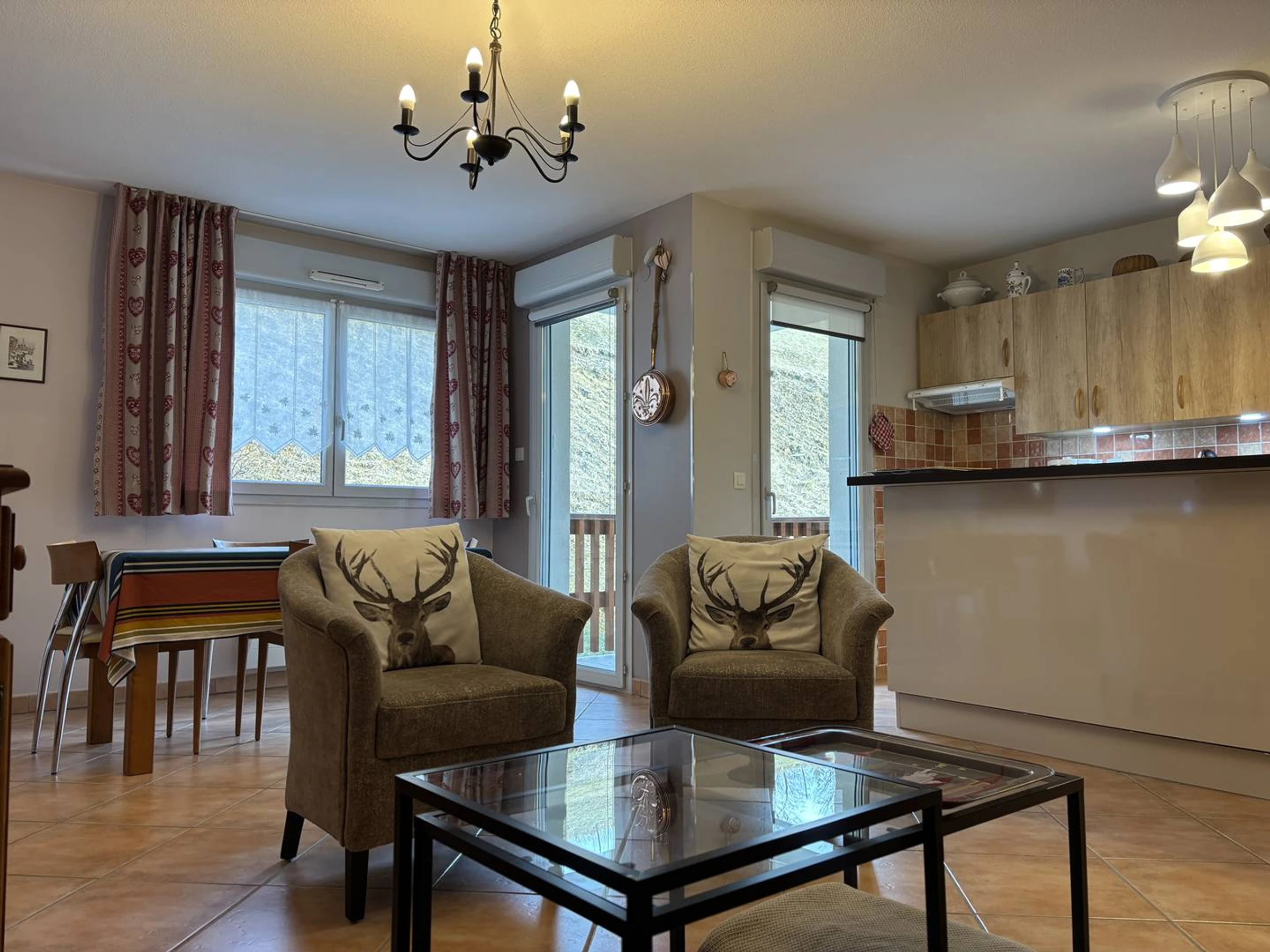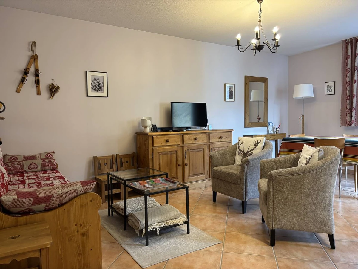 Une belle pièce de vie avec canapé-lit (2 lits gigognes en 80 cm) ouvrant sur un balcon exposé sud-est, idéal pour savourer votre café face à la montagne.